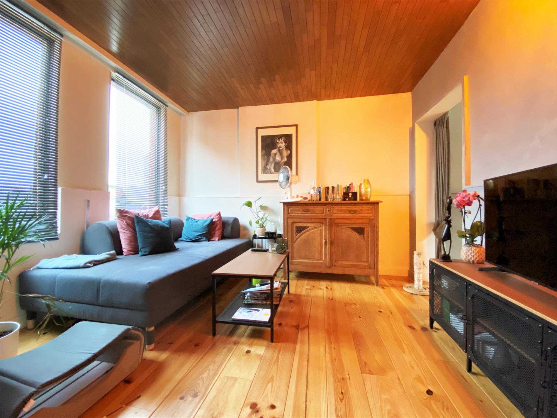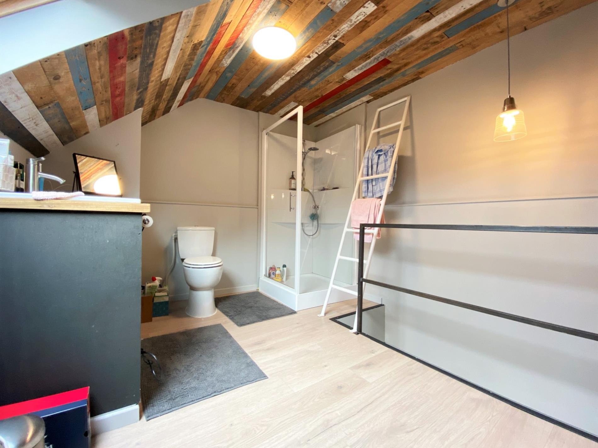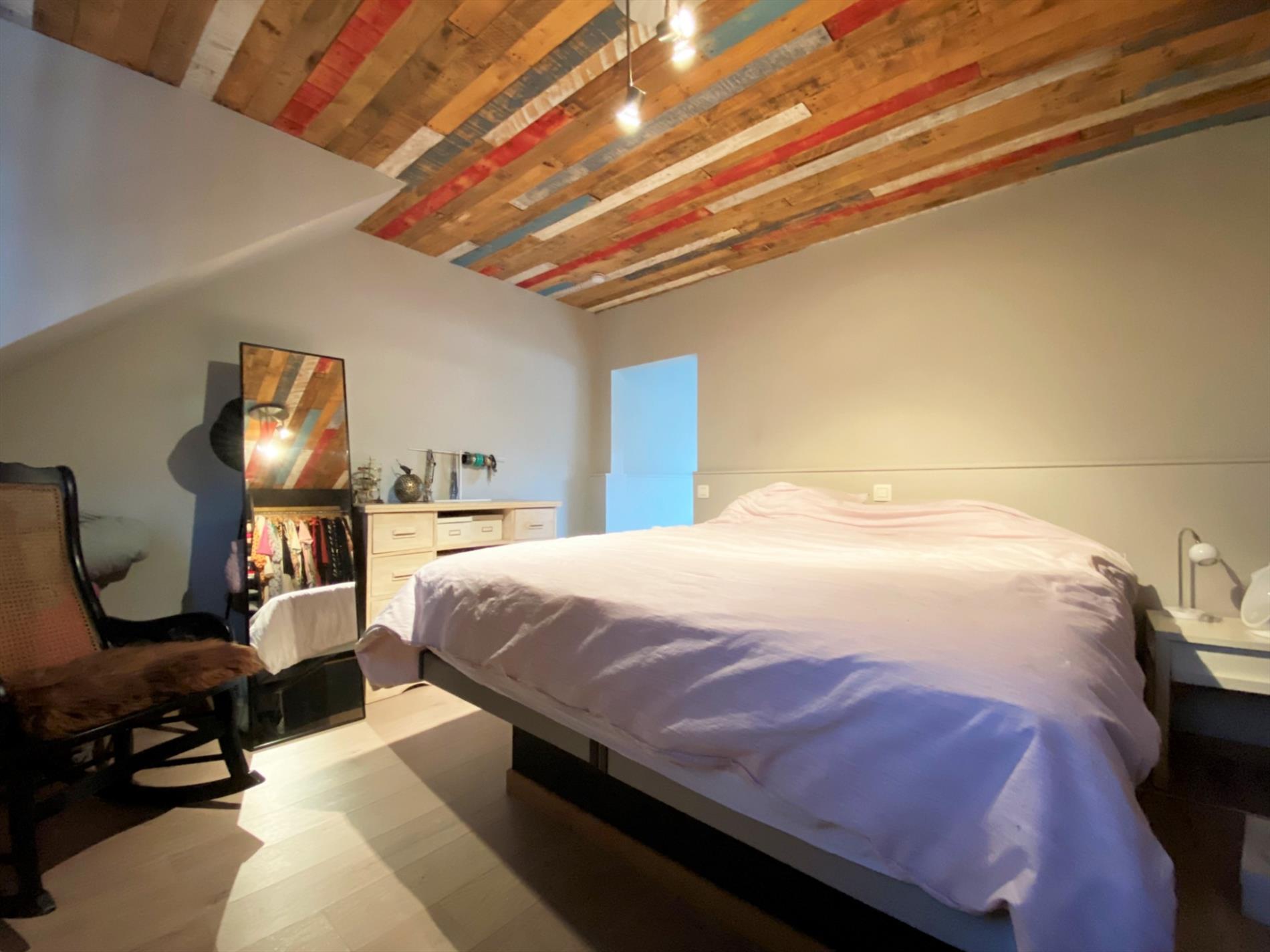 Het verdiep telt één slaapkamer met ingemaakte kasten en een ingerichte badkamer (lavabo/douche en toilet).