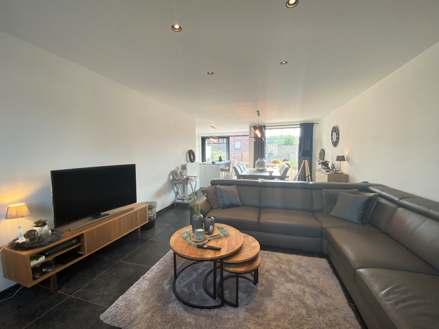 Aan de binnenzijde is deze woning op het gelijkvloers voorzien van een inkomhall met gastentoilet, een open ruime leefruimte (zithoek en eethoek) met aansluitend de open volledig ingerichte keuken.