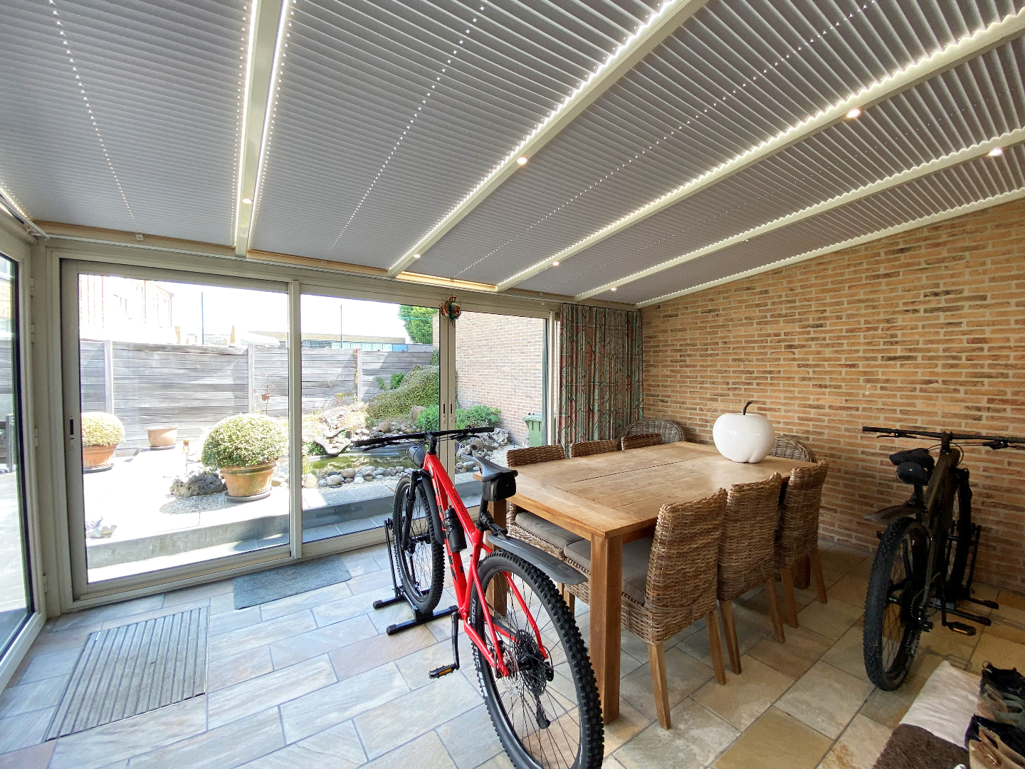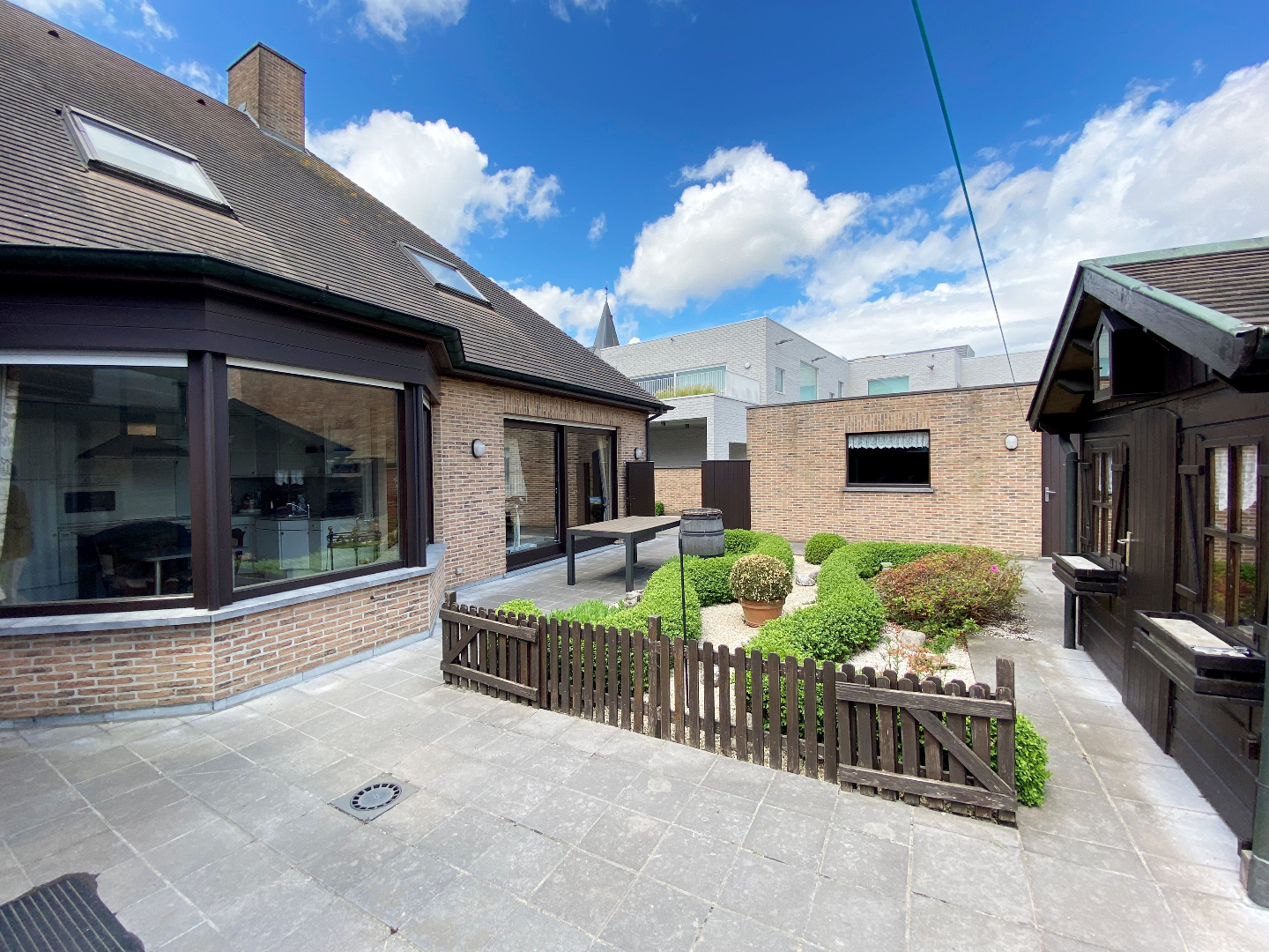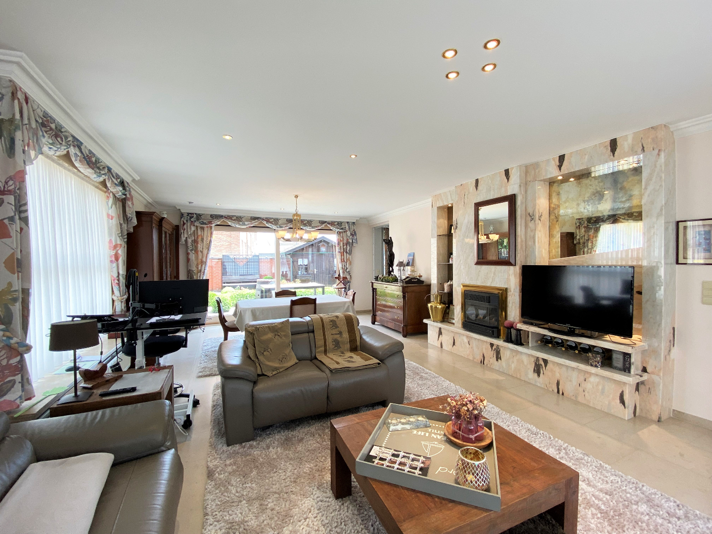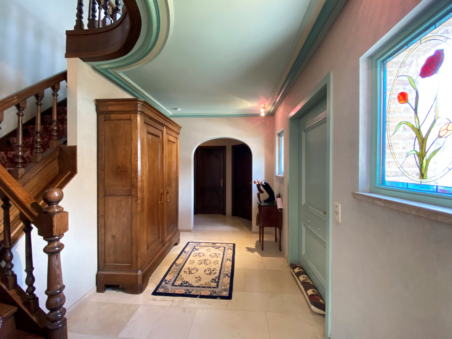 U komt binnen in de zeer ruime inkomhal waar er ook plaats is voor een vestiaire kast. De inkomhal biedt U toegang tot de ruime woonkamer (zithoek en eethoek) en de EERSTE keuken. De hoofdkeuken omvat een keramische kookplaat, een dampkap, een spoelbak, een vaatwasmachine, een oven en een koelkast. In de bijkeuken staat een grote diepvries en is ook de aansluiting voor de wasmachine en de droogkast (toestellen blijven staan). Beide keukens en de woonkamer hebben zicht op de tuin. Ook werd hier een veranda geïnstalleerd waarin U op en top kan genieten van het zongerichte terras met vijver.