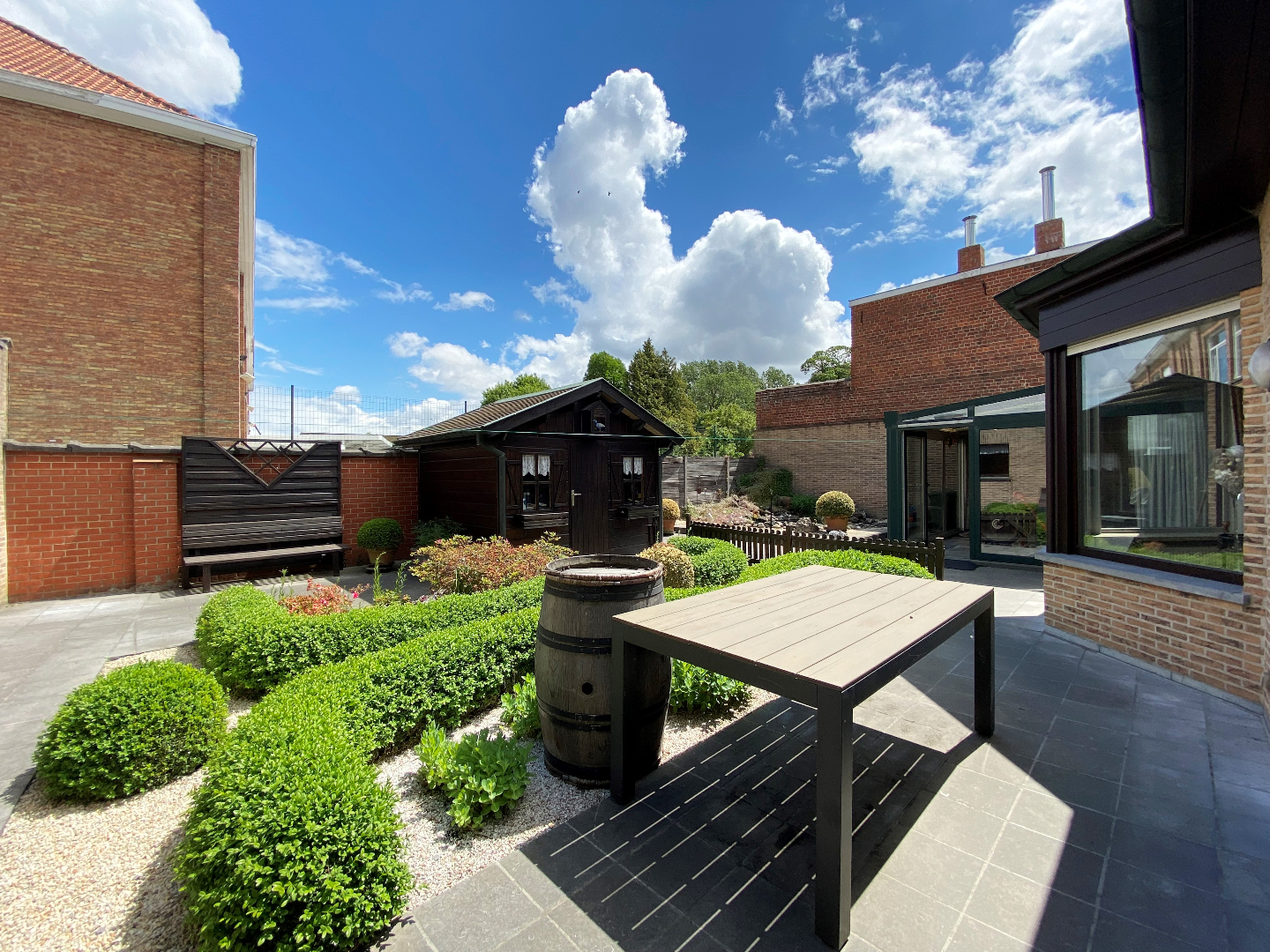 Het exterieur van de woning omvat een terras, beplanting, een vijver, een tuinhuis, een oprit en een garage met automatische kantelpoort.