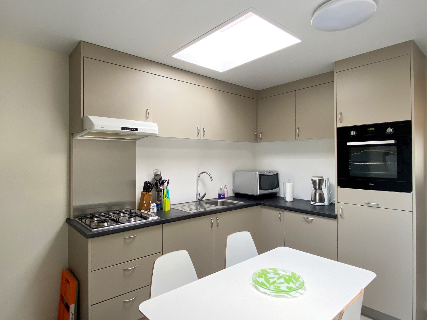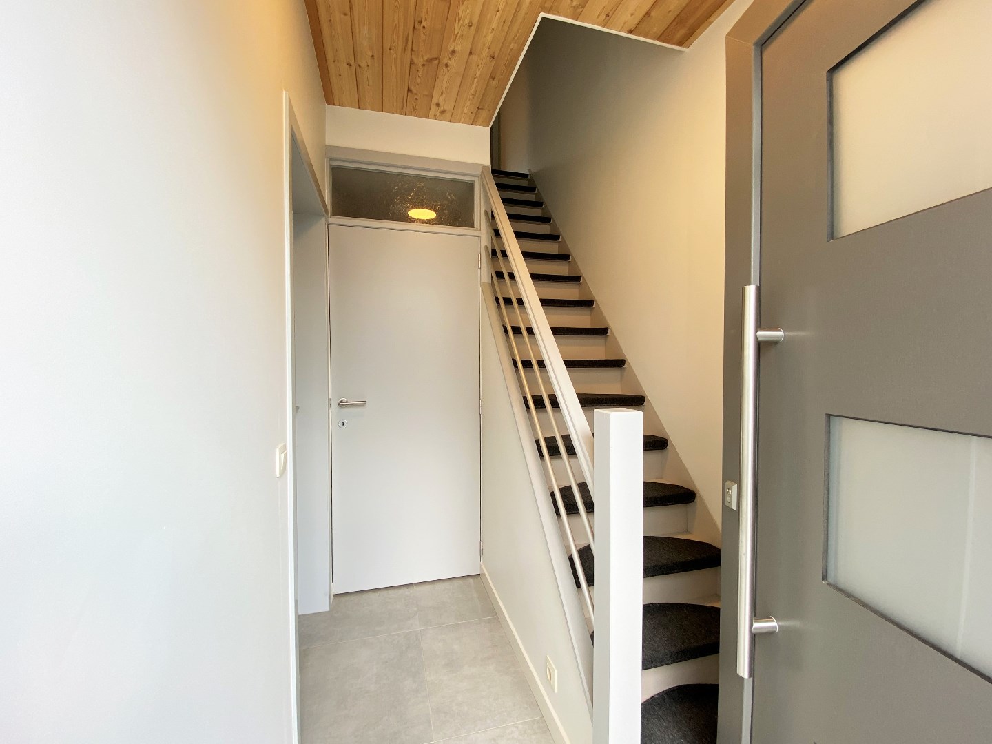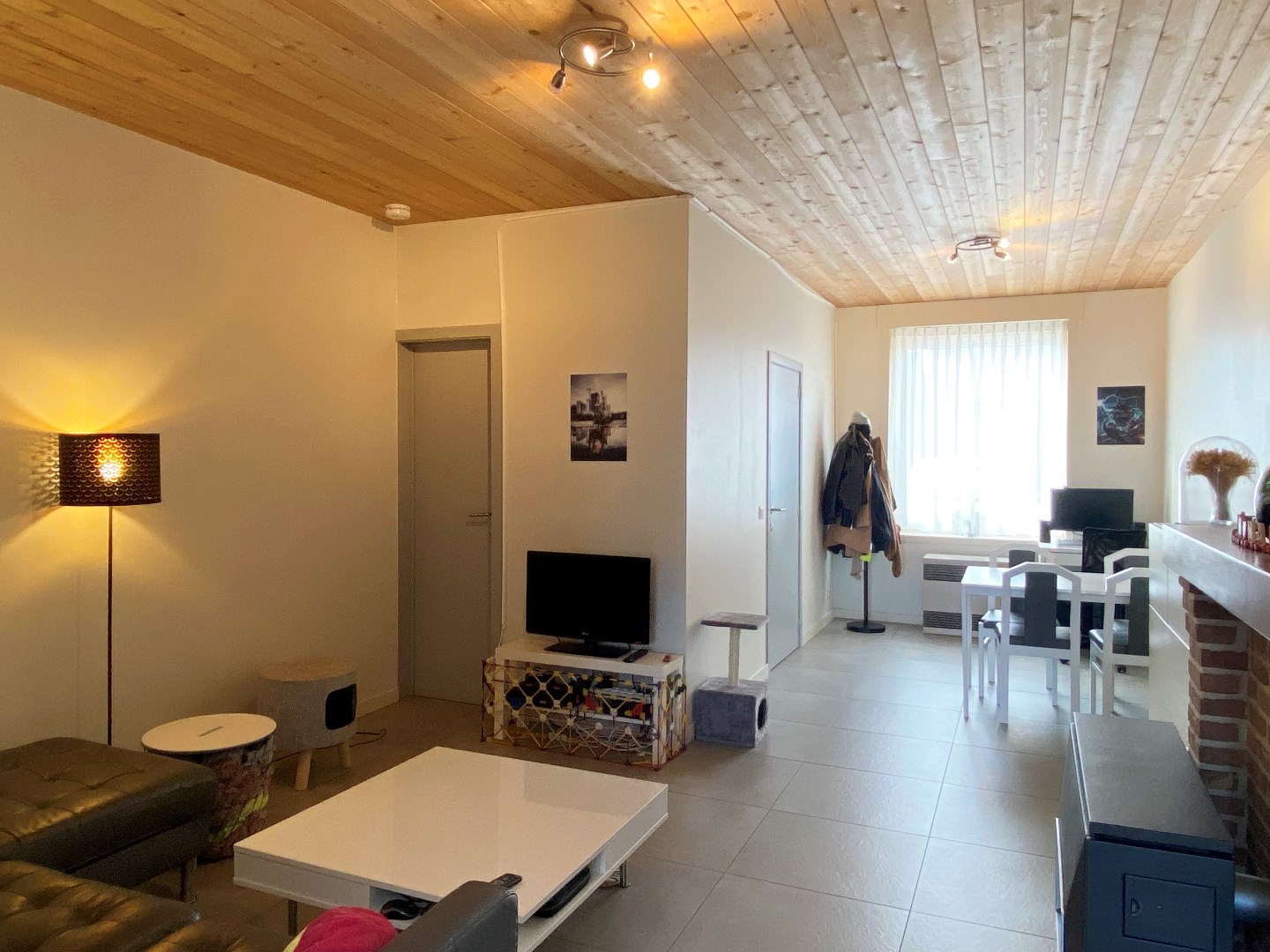 U komt binnen via de inkomhal met trappenhal die toegang geeft tot het apart toilet en de leefruimte. De leefruimte omvat een zitruimte en een eetplaats. Via de leefruimte komt u terecht in de open ingerichte keuken met zicht op de aangelegde tuin. De keuken is ingericht met een koelkast - dampkap - kookplaat -vaatwasmachine. Tevens is er in de keuken plaats om een eettafel te zetten. Verder in de woning bevindt zich de badkamer met dubbele lavabo's en douche (nieuw). De woning werd recent geschilderd en werd voorzien van lichtarmaturen!
