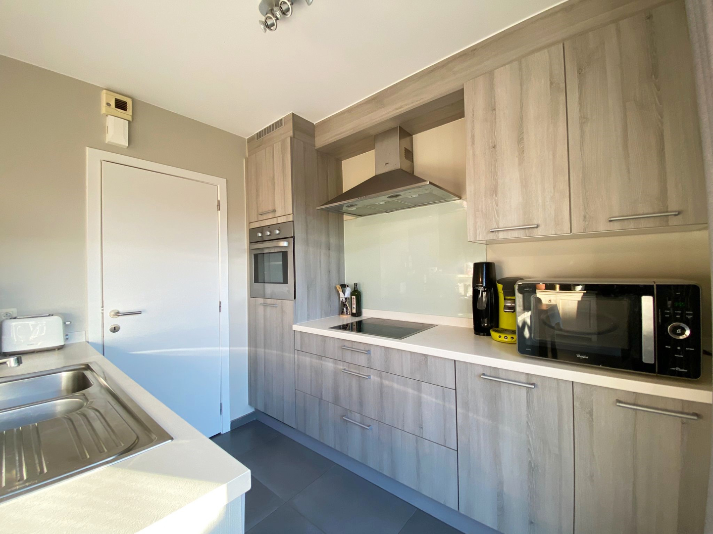 De keuken is voorzien van een spoelbak, een keramische kookplaat, een dampkap, een vaatwas, een oven en een koelkast. In de berging is de aansluiting voor de wasmachine en de droogkast.