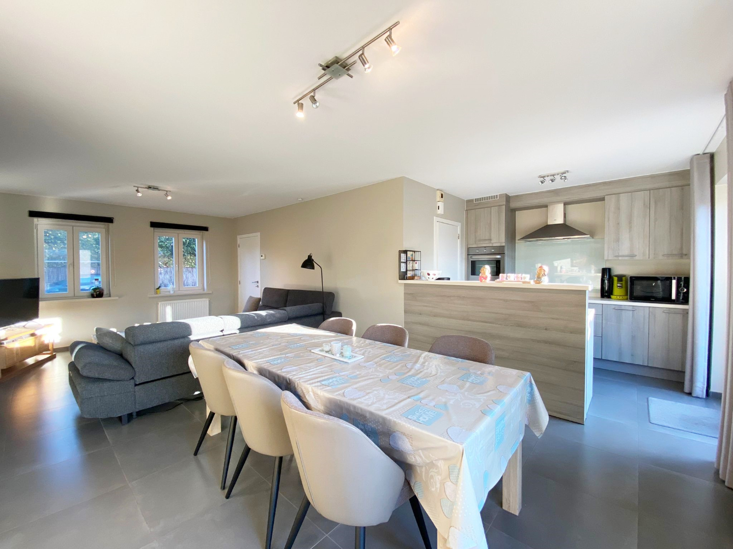 In de woonkamer is er plaats voor een zithoek en een eethoek. Aansluitend is de open ingerichte keuken met berging.