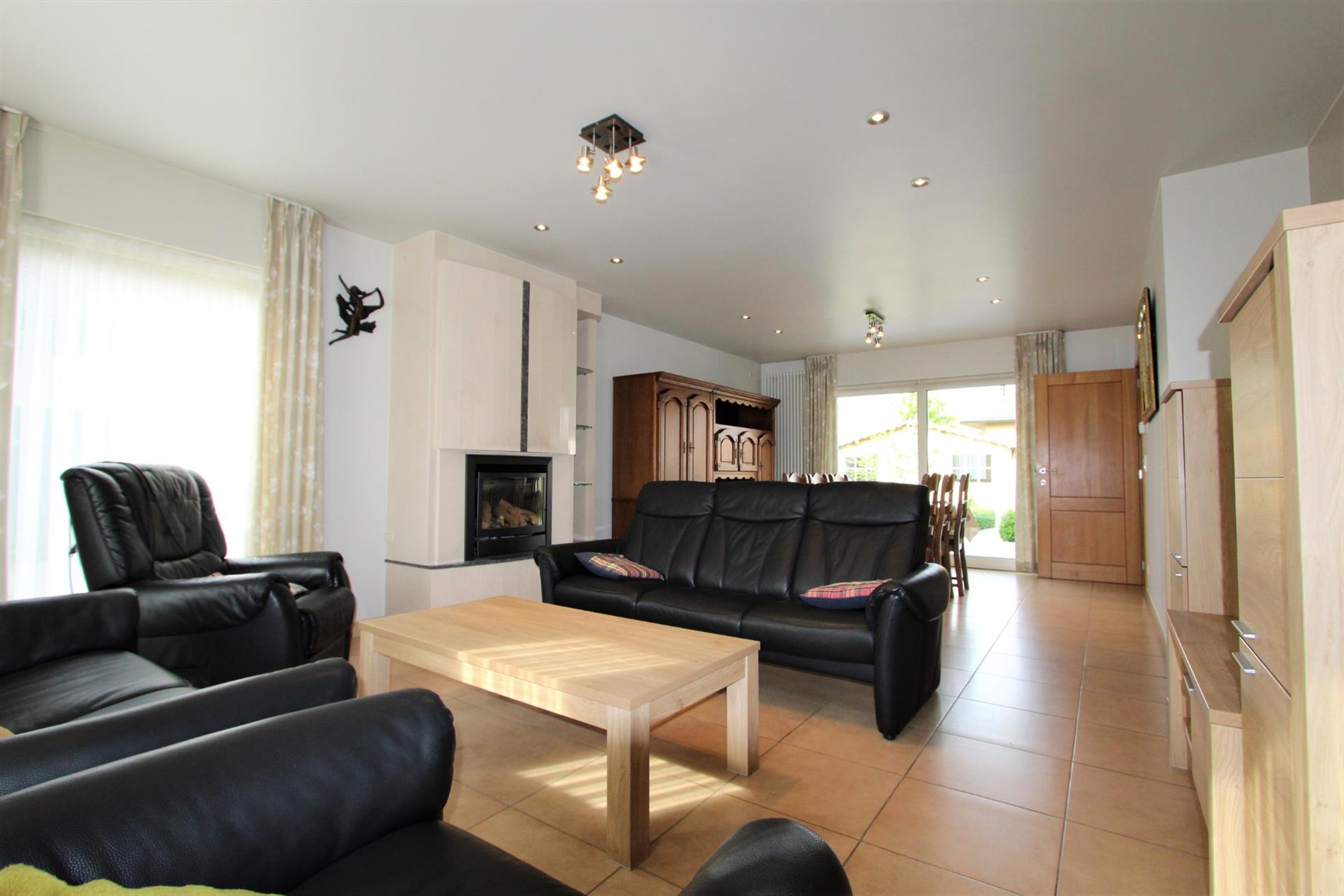 We komen binnen in een ruime inkomhal met gastentoilet. De inkomhal biedt U toegang tot de leefruimte, deze is voorzien van een mooi recente gashaard en grote raampartijen die voor veel natuurlijk lichtinval zorgen alsook een mooi zicht op de tuin.