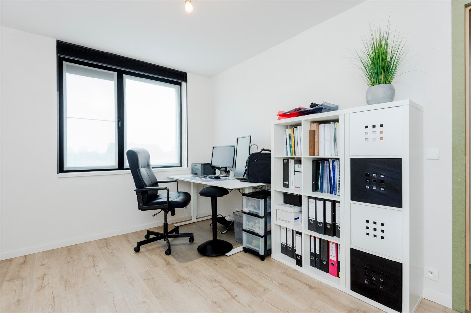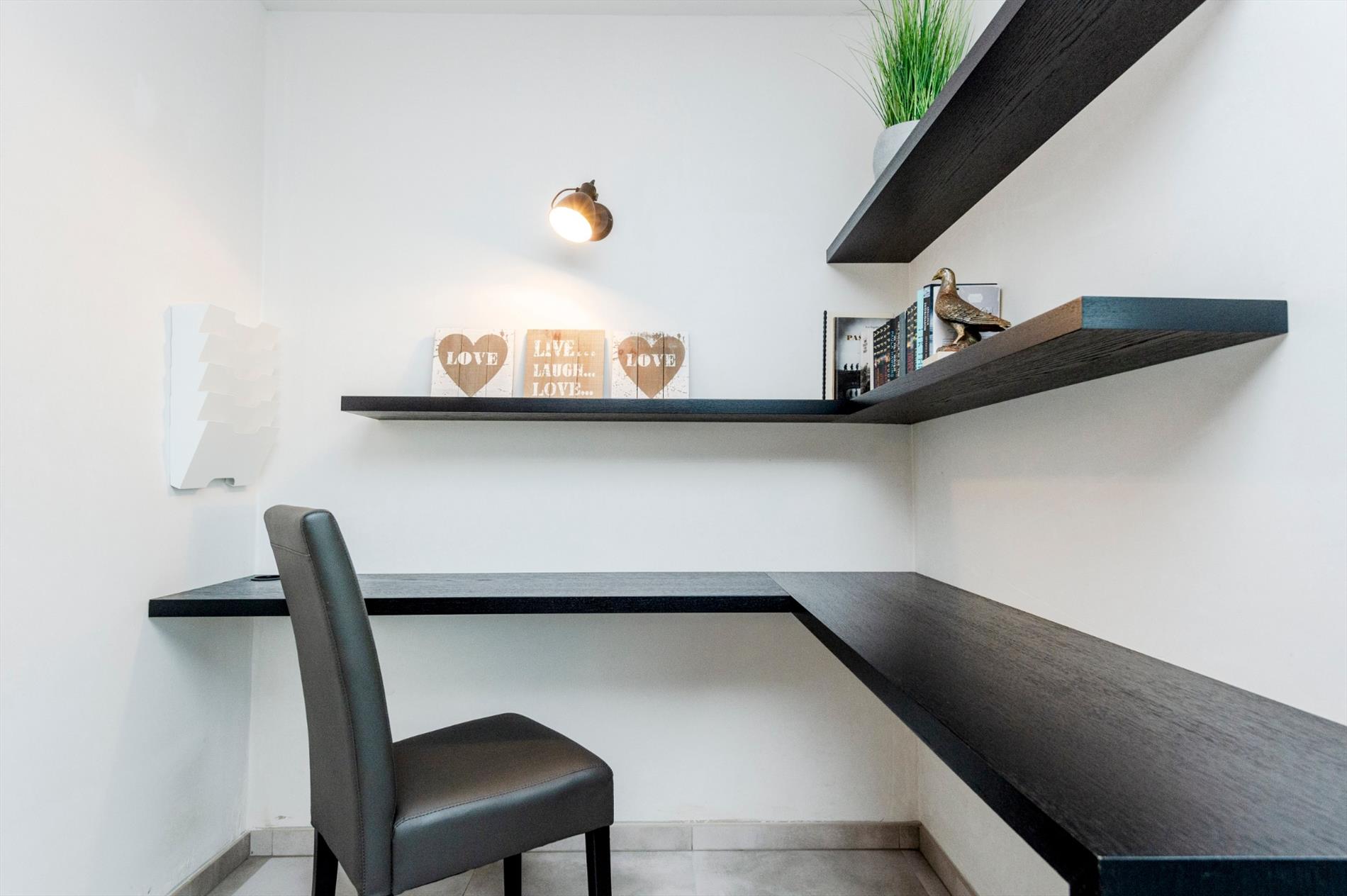 Op het gelijkvloers is er een ingerichte bureauruimte (direct contact met de zithoek) alsook 2 bergingen (wasruimte van 4 m² en een koele ingerichte berging van 3,50 m²).