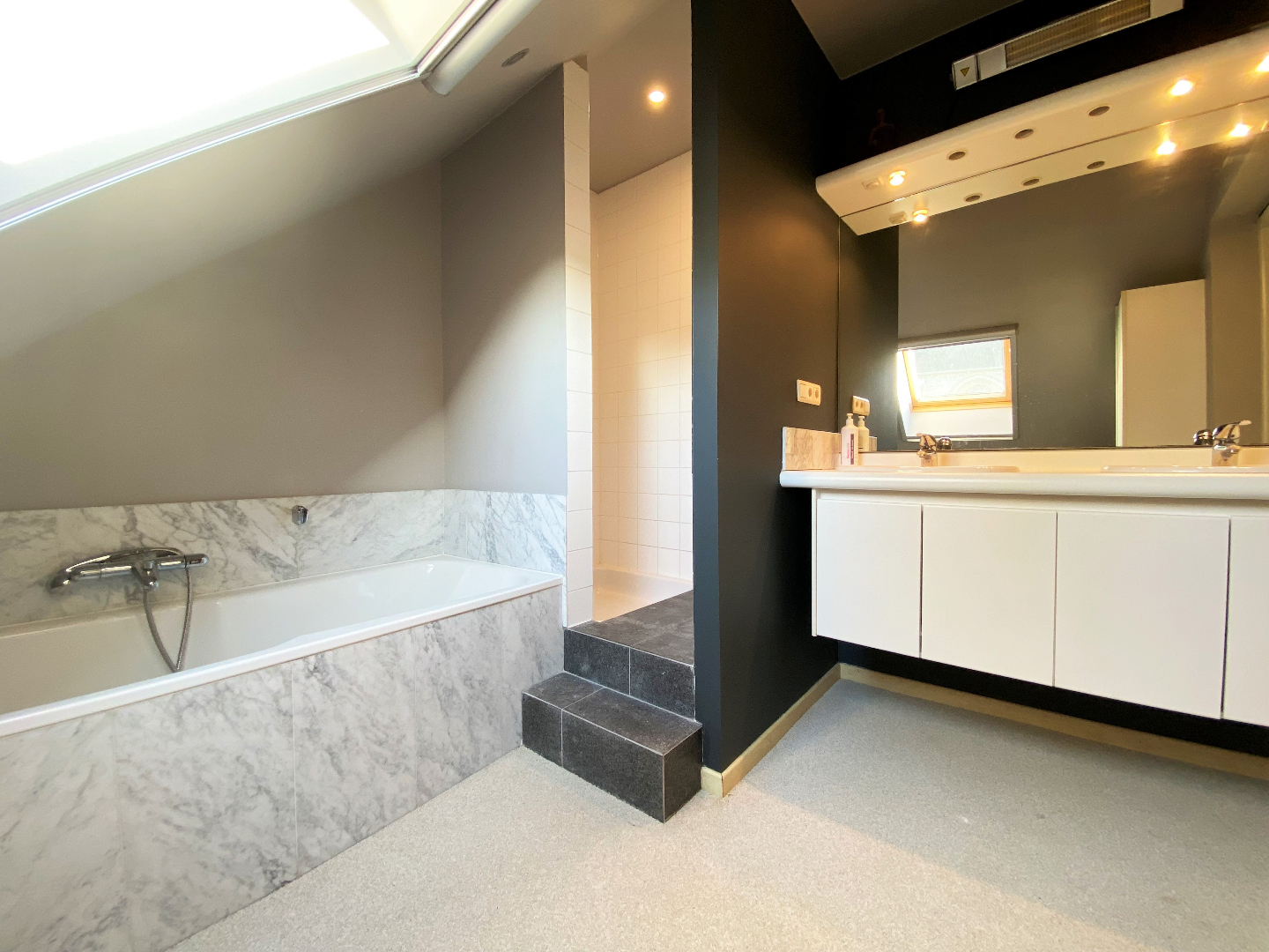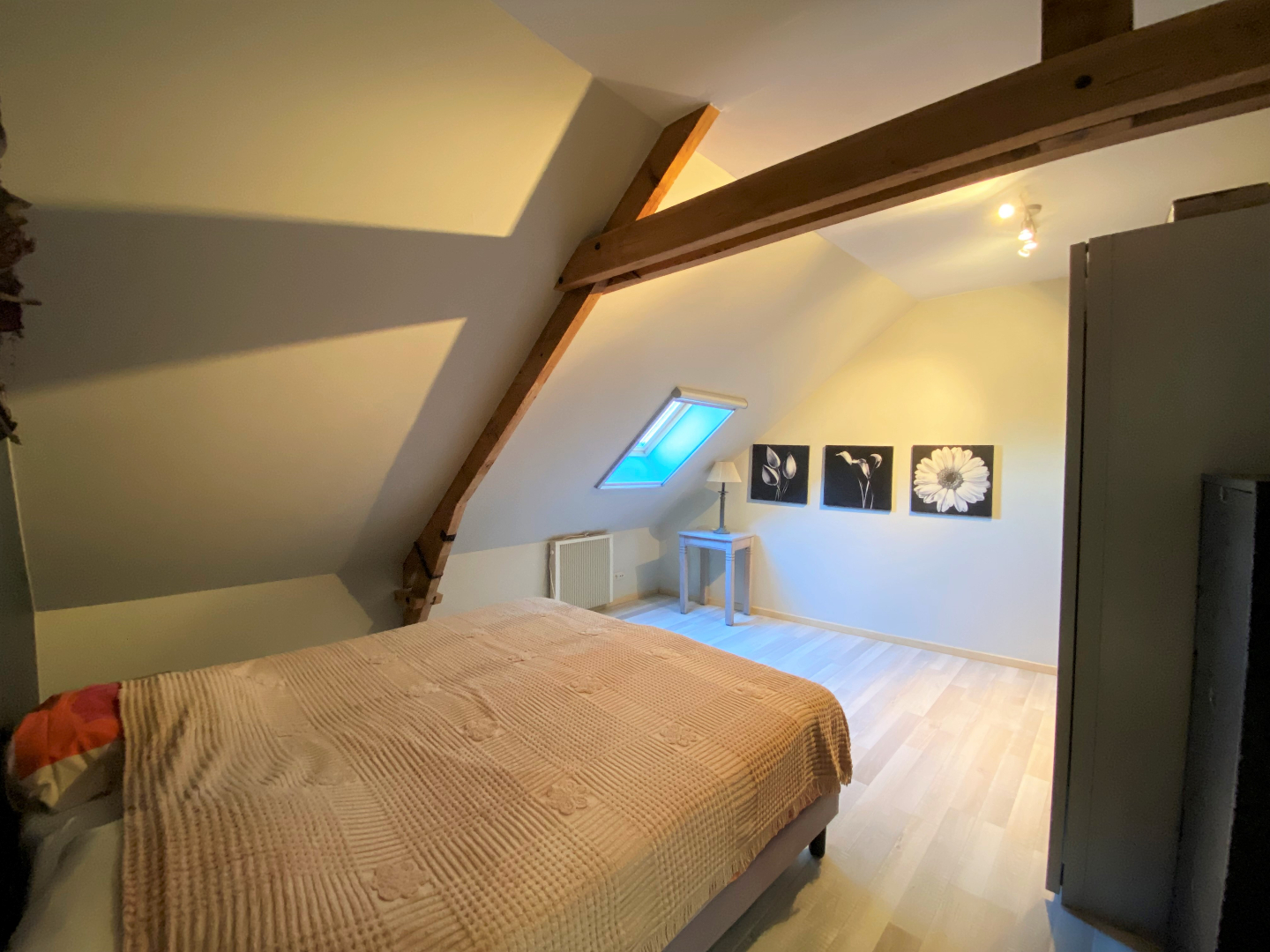 Via een vaste trap gaat u naar het verdiep. Hier zijn er 3 slaapkamers. De slaapkamers zijn voorzien van laminaat als vloerbekleding. De veluxen hebben een verduistering. Het verdiep omvat een tweede badkamer met ligbad, douche en dubbele lavabo's met meubel en een apart toilet.