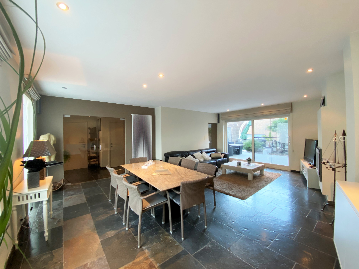 U komt binnen via de inkomhall die toegang verleent tot de wasplaats, apart toilet, keuken en woonkamer. Via de dubbele glazen deur komt u terecht in de lichtrijke woonkamer met zicht op het terras. Alle gordijnen en overgordijnen blijven aanwezig in de woning. Via een twee glazen deur komt u terecht in de geïnstalleerde keuken oven | microgolfoven | keramische kookplaat | dampkap | spoelbak. De vaatwasmachine kan overgenomen worden. Via de keuken kan u de wasplaats en de praktische berging betreden. Verder is er op het gelijkvloers nog een slaapkamer en een badkamer met inloopdouche , dubbele lavabo's met meubel en toilet. Via de woonkamer, keuken en slaapkamer kan u naar het terras.