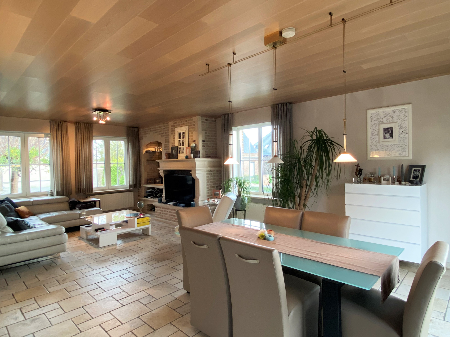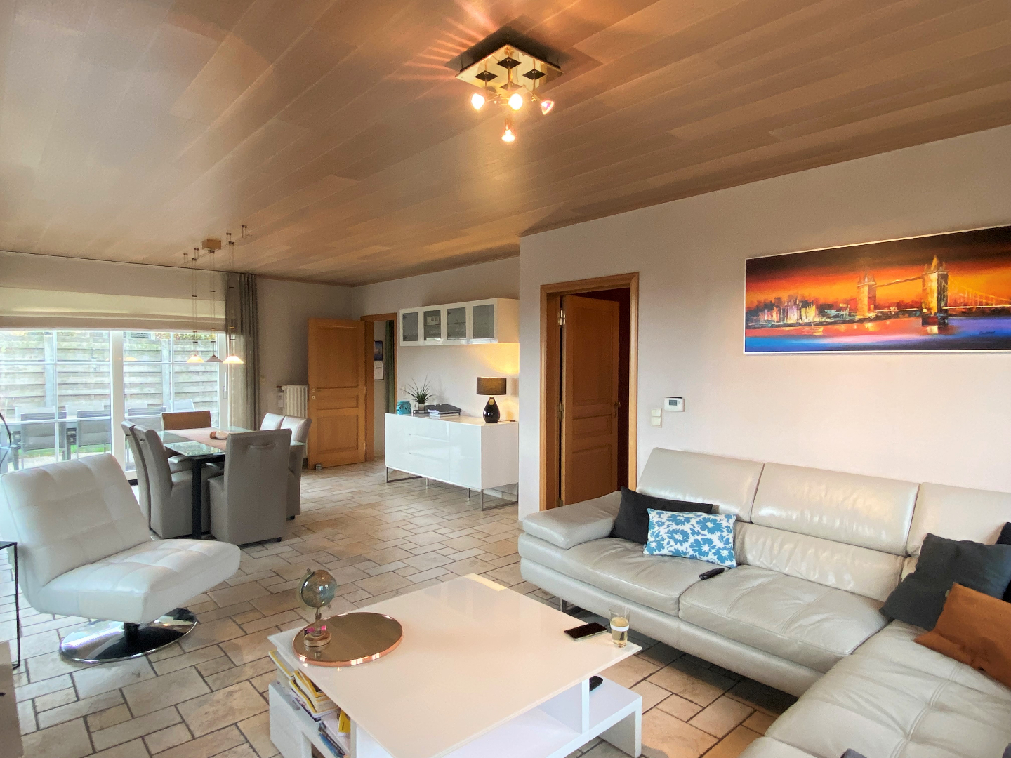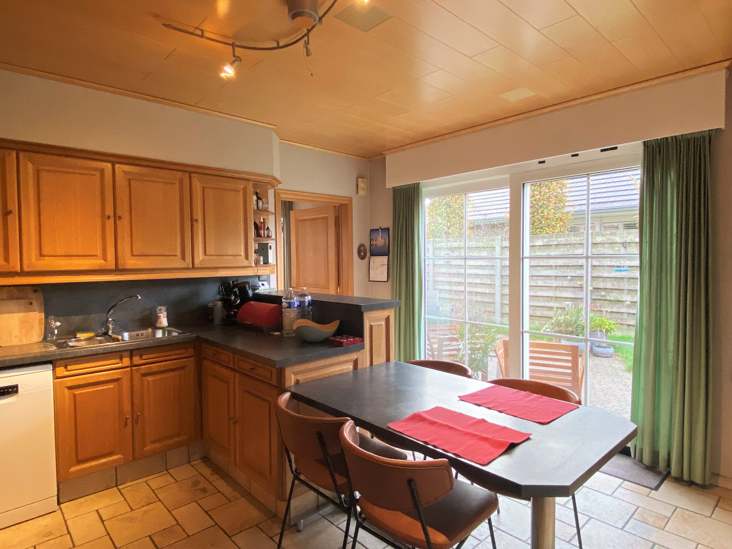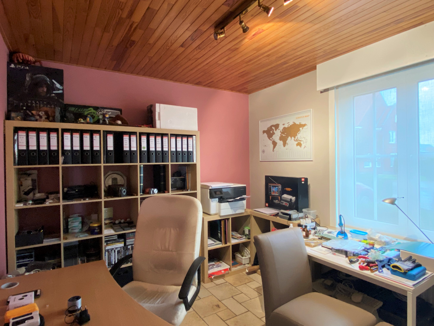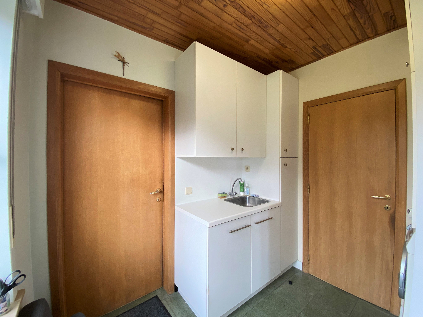 U komt binnen in de ruime inkomhal. Deze biedt U toegang tot de lichtrijke woonkamer (zithoek en eethoek), bureau/slaapkamer en het apart toilet. Aansluitende de woonkamer bevindt zich de geïnstalleerde keuken (oven | koelkast | vaatwasmachine | elektrische kookplaat | dampkap ). Naast de keuken heeft u nog een wasplaats die toegang verleent tot garage. In de garage is er een douchekamer voorzien. De woonkamer en de keuken hebben zicht en toegang tot de tuin.