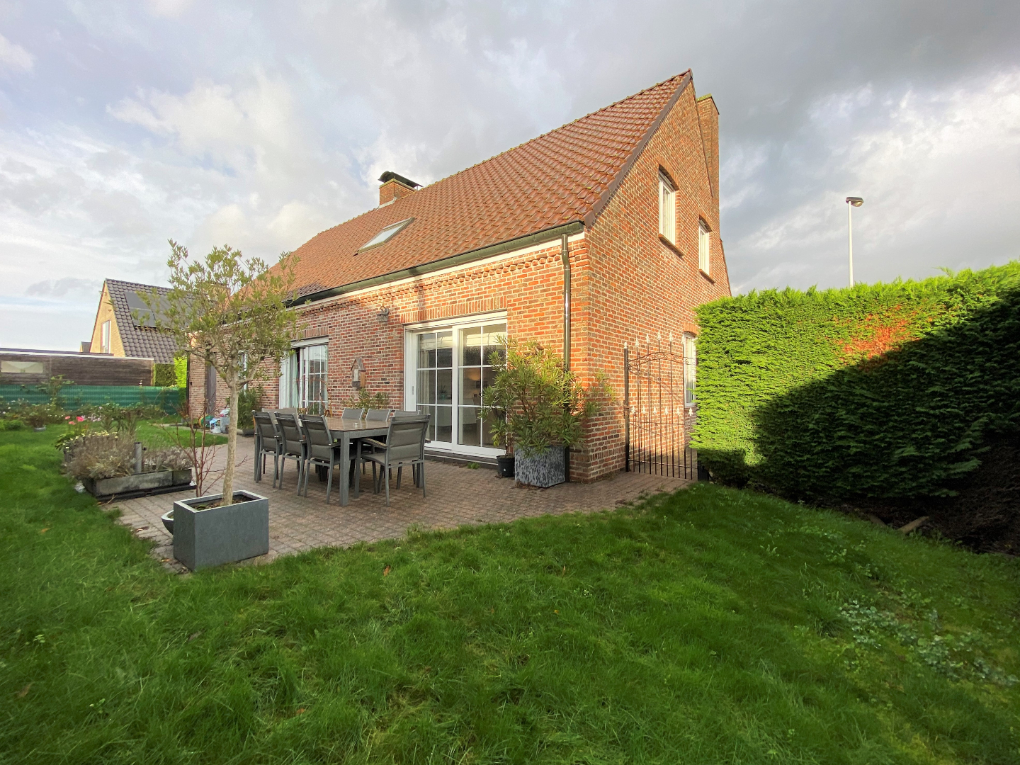 Het exterieur van de woning omvat rondom een tuin met beplanting, achteraan een terras, een oprit en een garage met automatische kantelpoort.