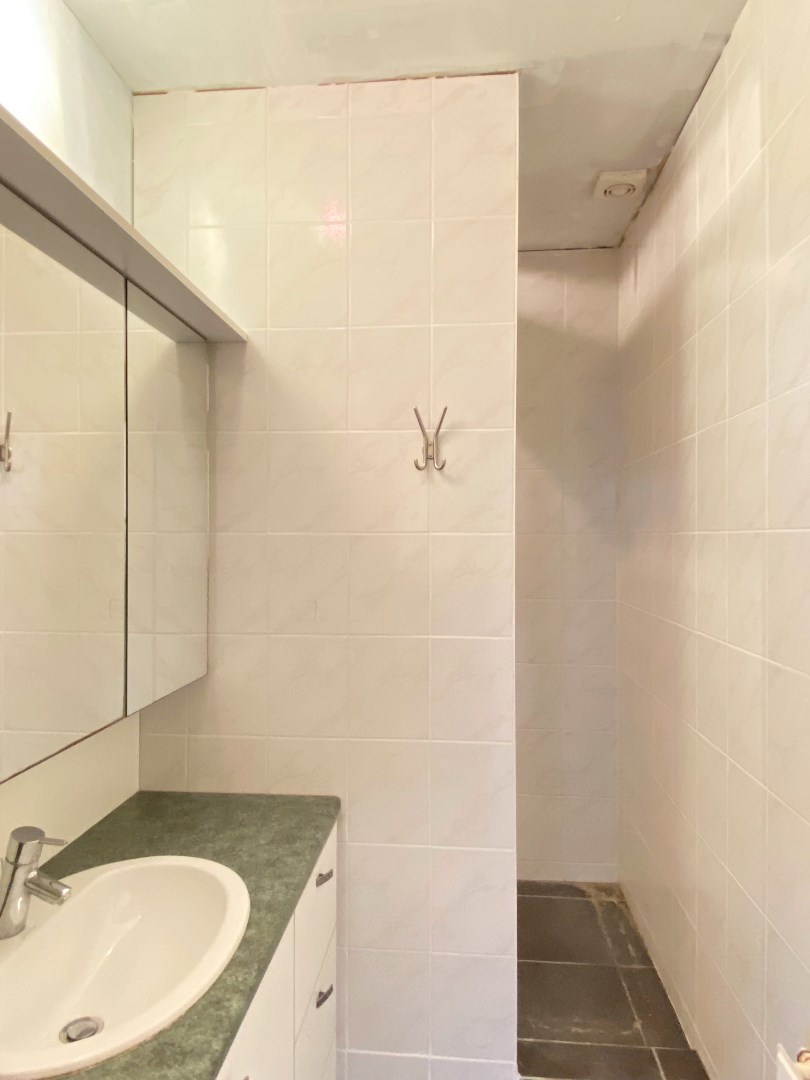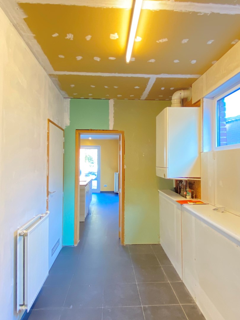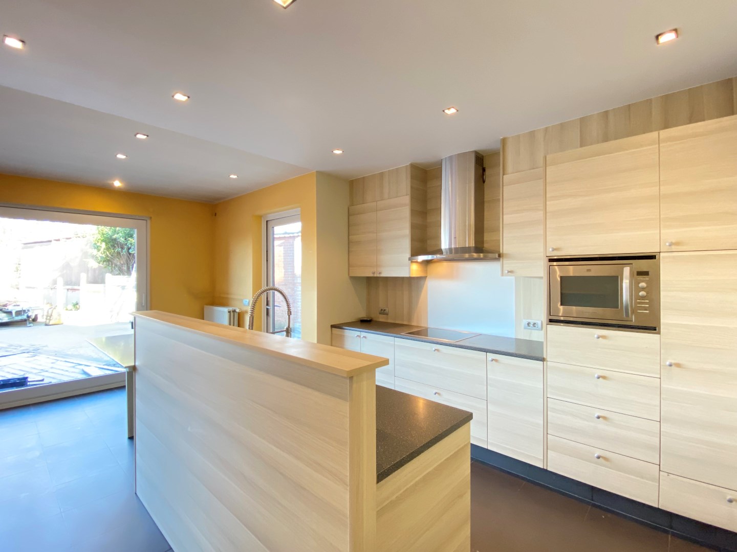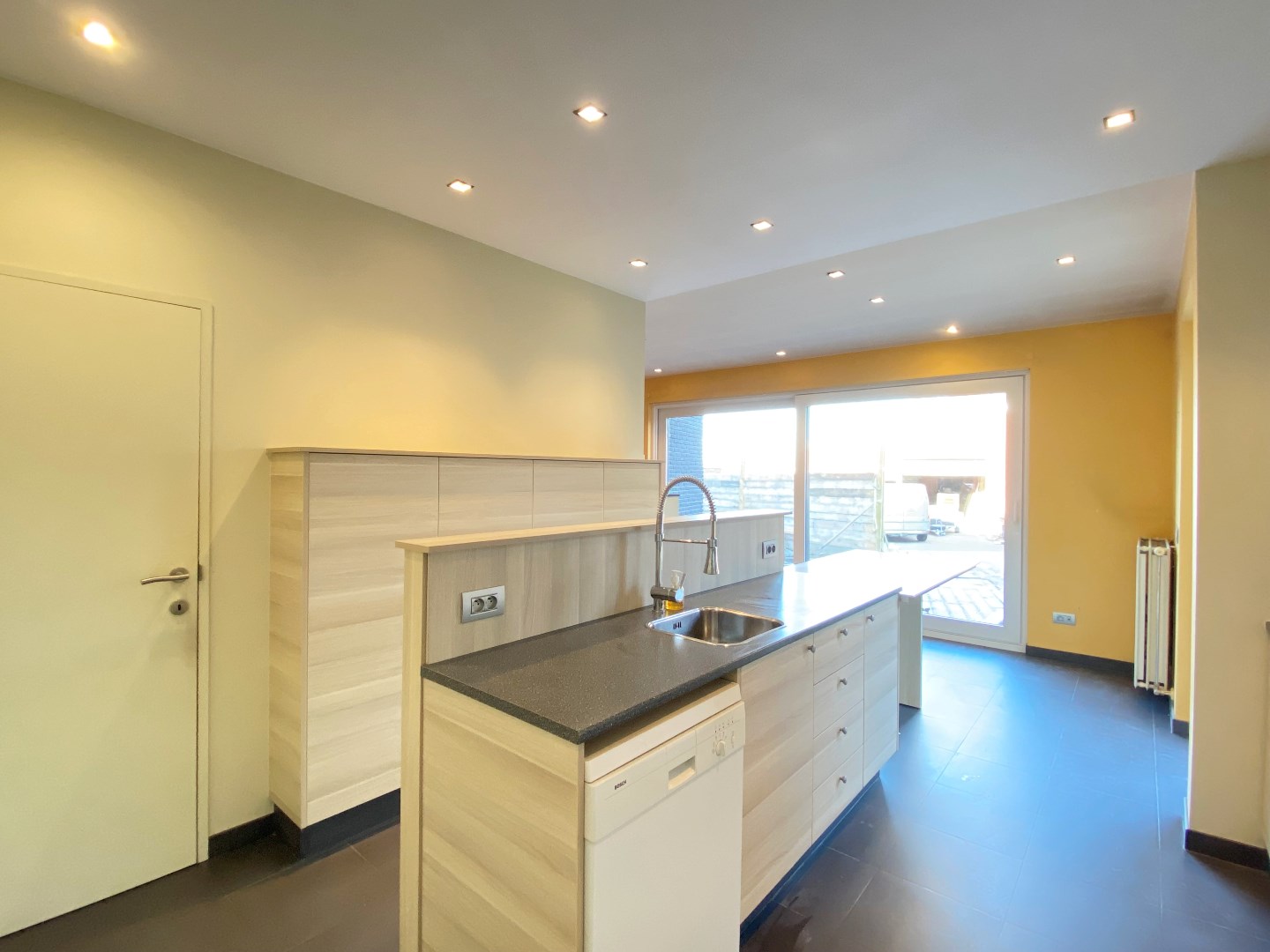 U komt binnen in de inkomhal. De inkom biedt toegang tot de leefruimte, bureel, toilet en wasplaats. Verder komt u terecht in de lichtrijke en ruime leefruimte met zithoek en eetplaats. U kan de tuin/het terras betreden via het schuifraam. Naast de leefruimte bevindt zich de open volledig geïnstalleerde keuken. De keuken omvat een kookplaat, microgolfoven, vaatwasmachine, dampkap en spoelbek. Aansluitende de keuken is er een praktische berging onder de trap. Het gelijkvloers omvat nog een wasplaats en badkamer met lavabomeubel en douche.