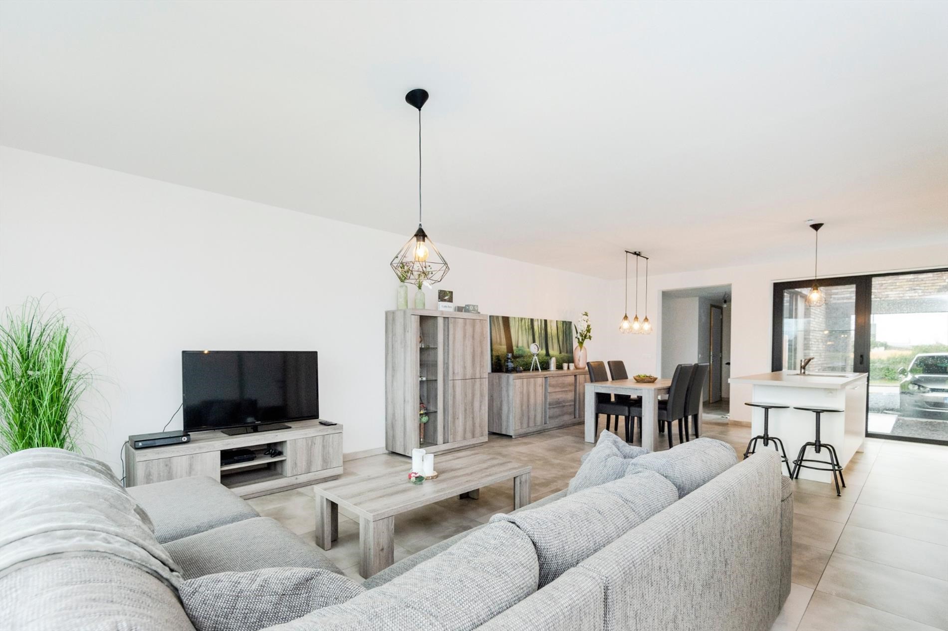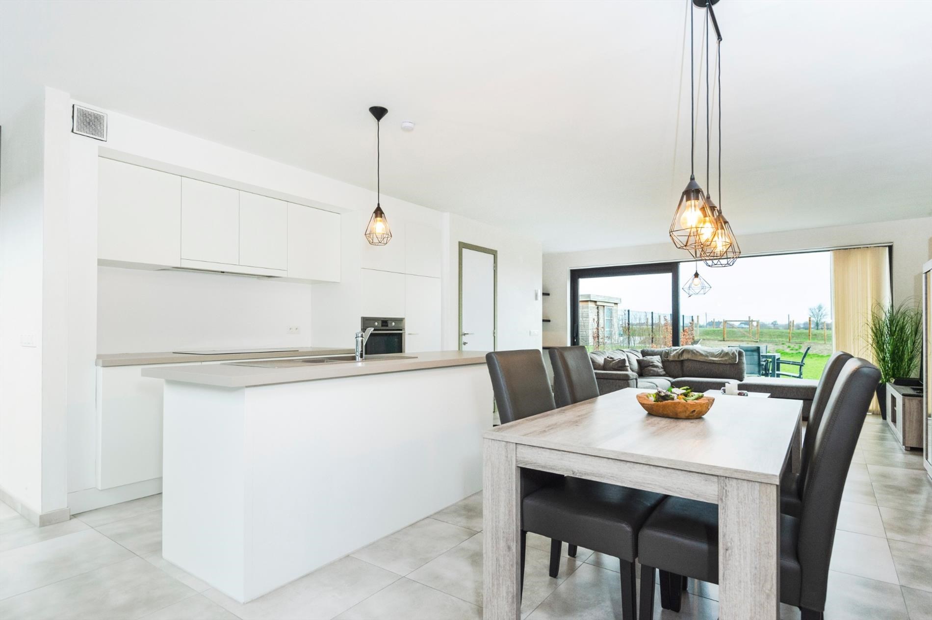 We komen binnen in de inkomhal met een afzonderlijk gastentoilet. Via deze inkom komen we binnen in de leefruimte (42 m²) met open volledig ingerichte keuken met zicht op de tuin (voor en achter) met aangelegd terras. De keuken is ingericht met kookplaat | dampkap | oven | microgolfoven | dubbele spoelbak | vaatwasmachine en koelkast.