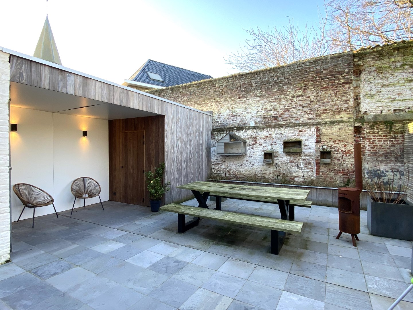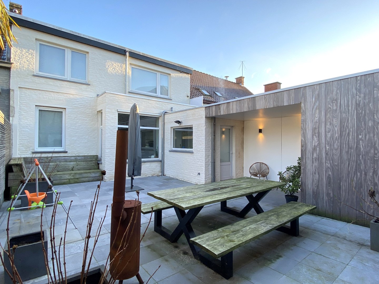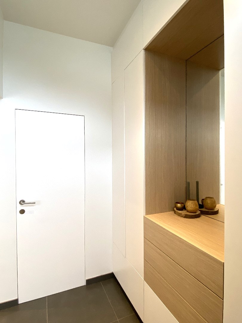 De woning is voorzien van alle comfort en omvat een inkomhal met ingemaakte kasten en gastentoilet. Verder komt u terecht in de lichtrijke leefruimte met zit en eetplaats. De open keuken is volledig ingericht (oven | combi-microgolfoven | koelkast | dampkap | keramische kookplaat | vaatwasmachine | spoelbak). Naast de keuken bevindt zich de wasplaats. De buitenkant van de woonst omvat een gezellige koer (tafel en bank blijven staan). Tevens is er nog een handige bergruimte voorzien.