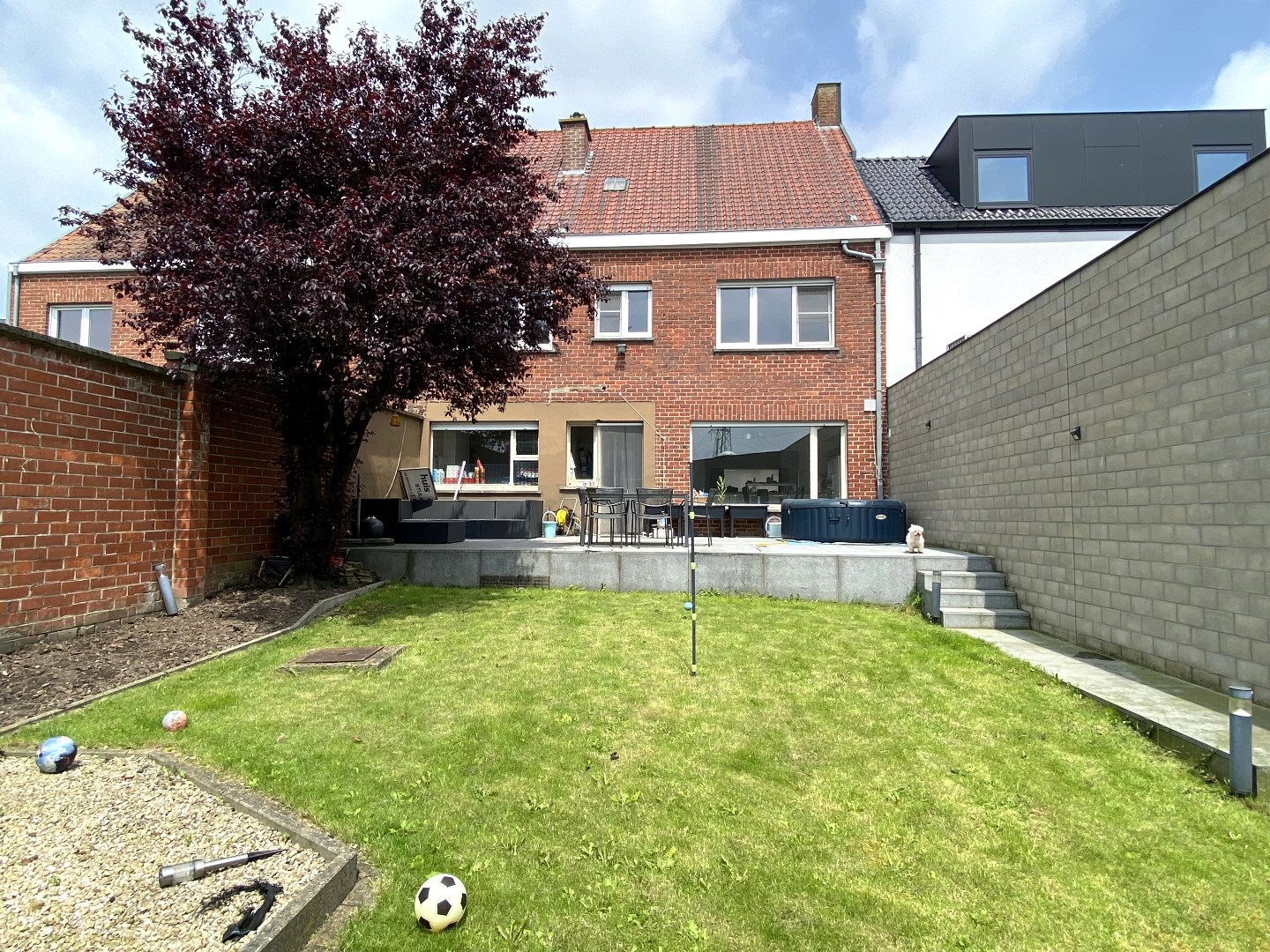 Het exterieur is voorzien een terras en grasperk. De tuin is volledig afgezet en is kindvriendelijk. Er kan geparkeerd worden voor de deur.