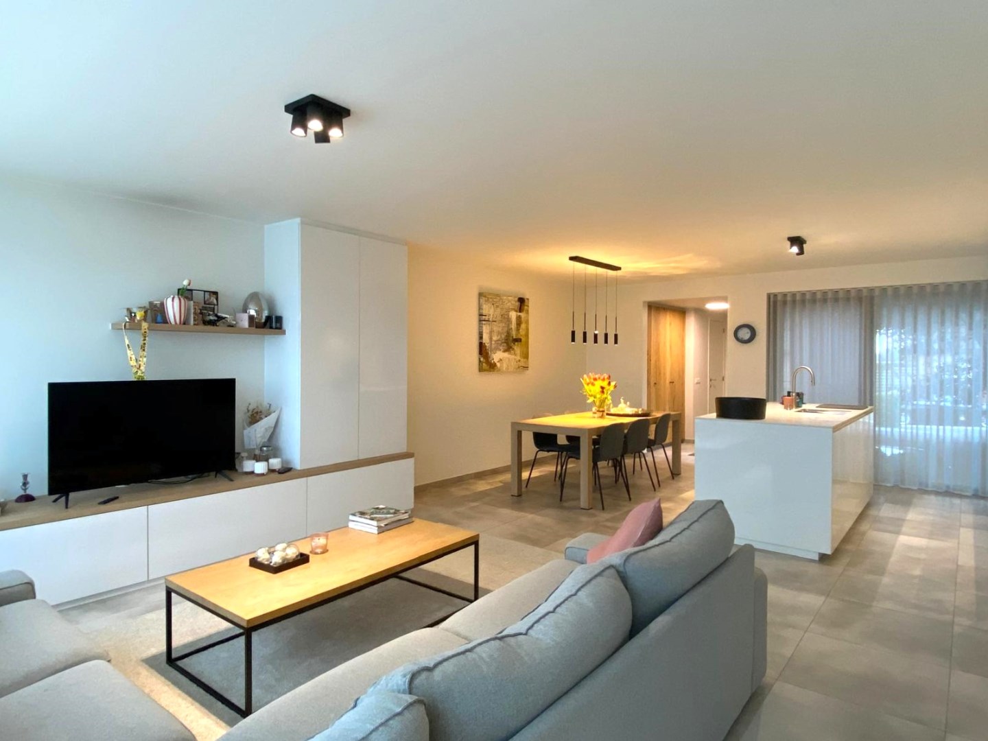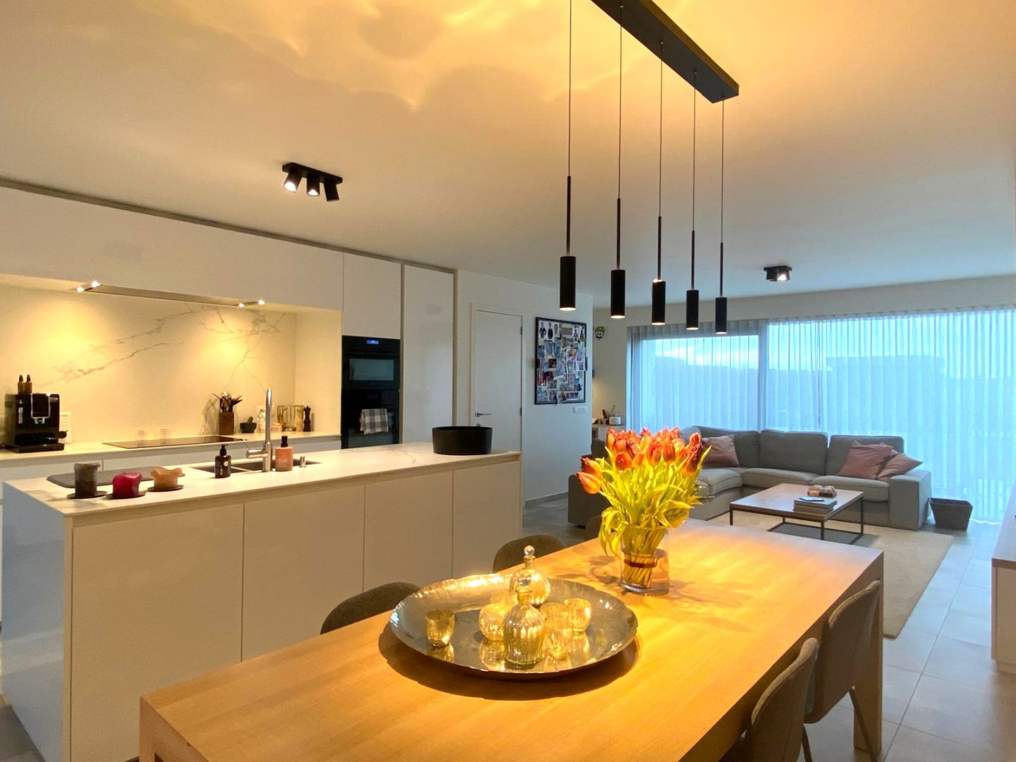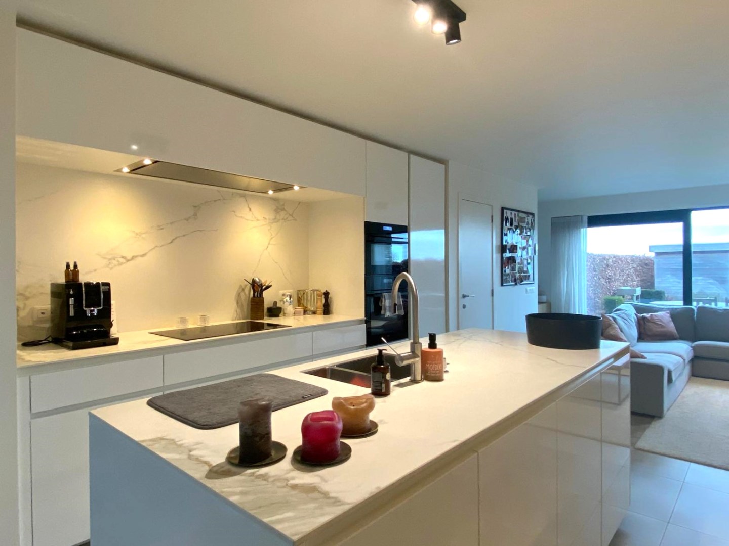 We komen binnen in de inkomhal met een afzonderlijk gastentoilet en ingemaakte vestiairekast. Via deze inkom komen we binnen in de leefruimte (prachtig TV meubel met opbergkasten | 42 m²) met open volledig ingerichte keuken (combi-steamer | combi-oven | extra grote frigo | inductie kookplaat | vaatwasser | 1,5 spoelbak). U geniet van zowel zicht op de voor- en achtertuin met aangelegd terrassen. Handig is tevens de koele berging (4 m² | volledig ingericht met rekken met diepvriezer). Op het gelijkvloers is er tevens nog een ingerichte bureauruimte (direct contact met de zithoek) alsook een wasruimte met opnieuw ingemaakte kasten.