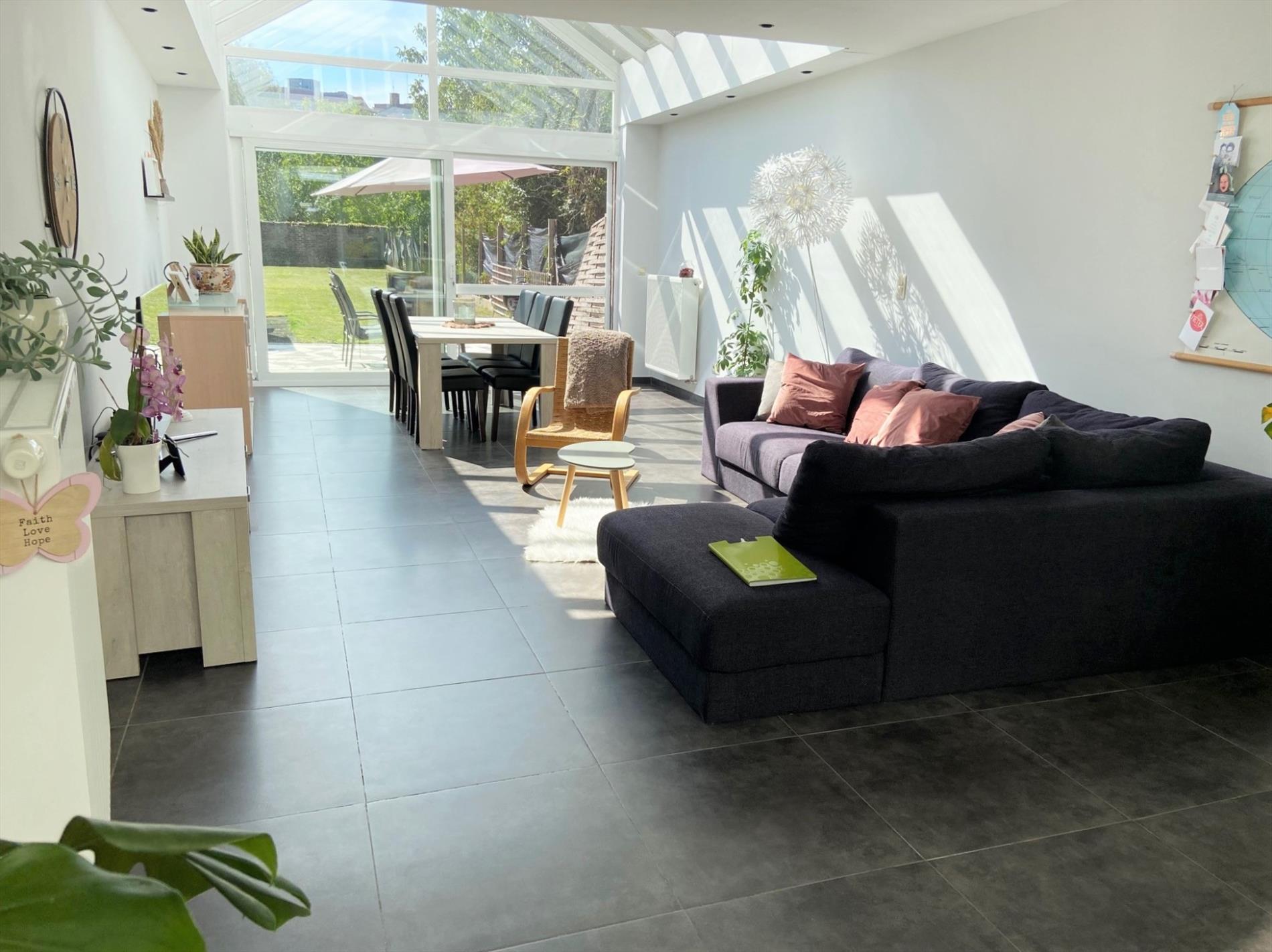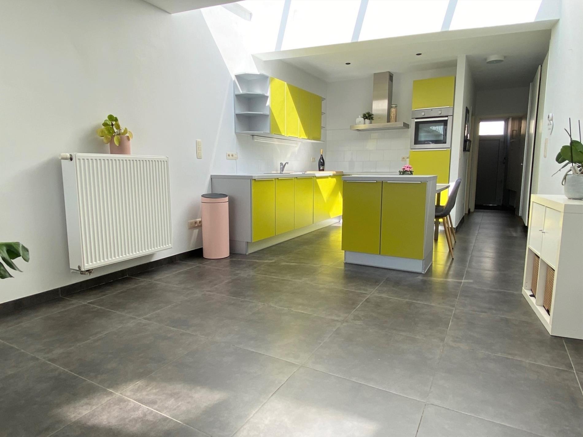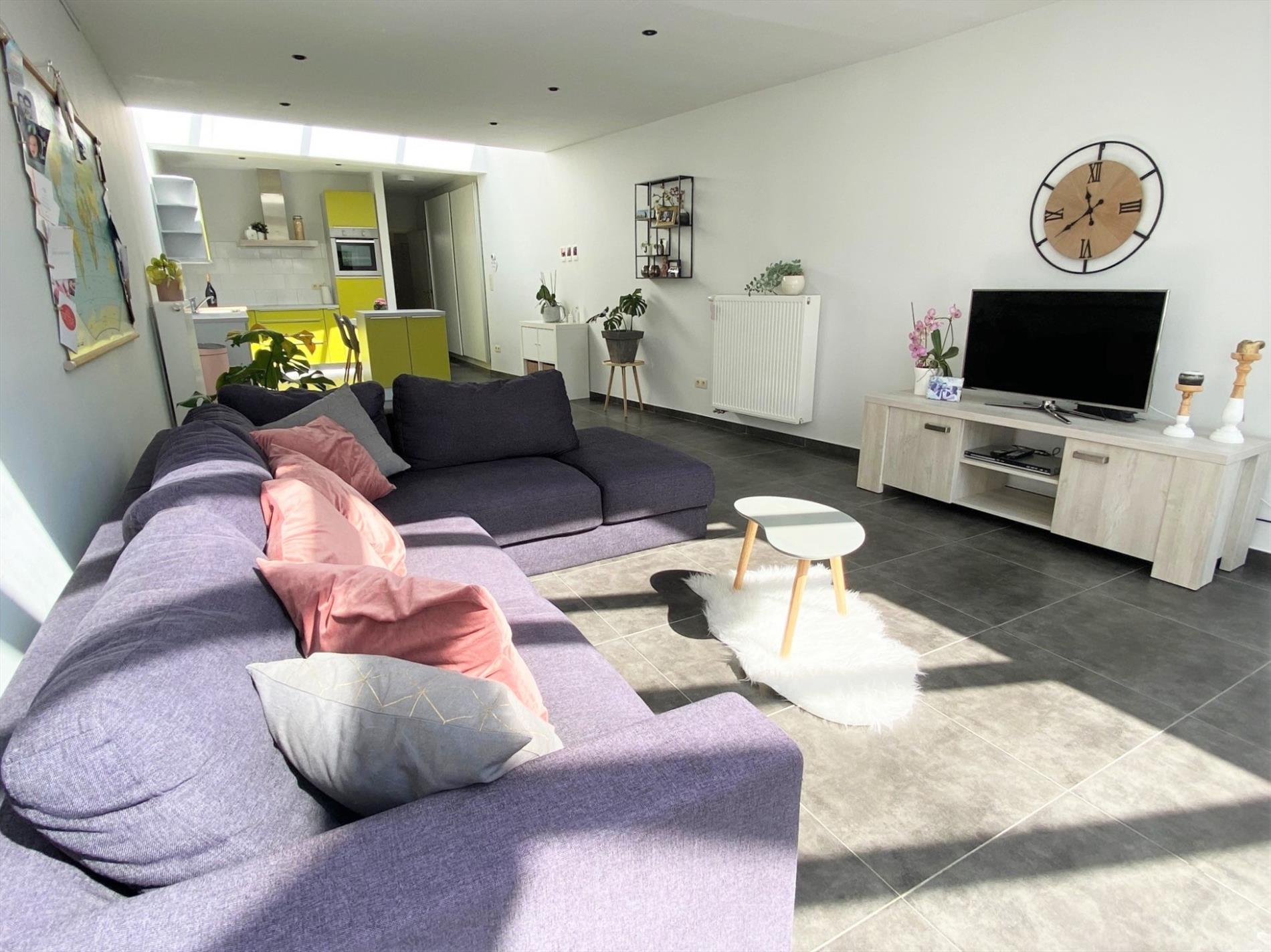 Deze centraal gelegen INSTAPKLARE rijwoning is voorzien van alle comfort en omvat een inkom met vestiairekast en trap naar het verdiep, ruime lichtrijke leefruimte met open keuken. Keuken is voorzien van een spoelbak, elektrische kookplaat, dampkap, koelkast en vaatwasmachine. De leefruimte geeft uit op het terras met zonnige tuin!