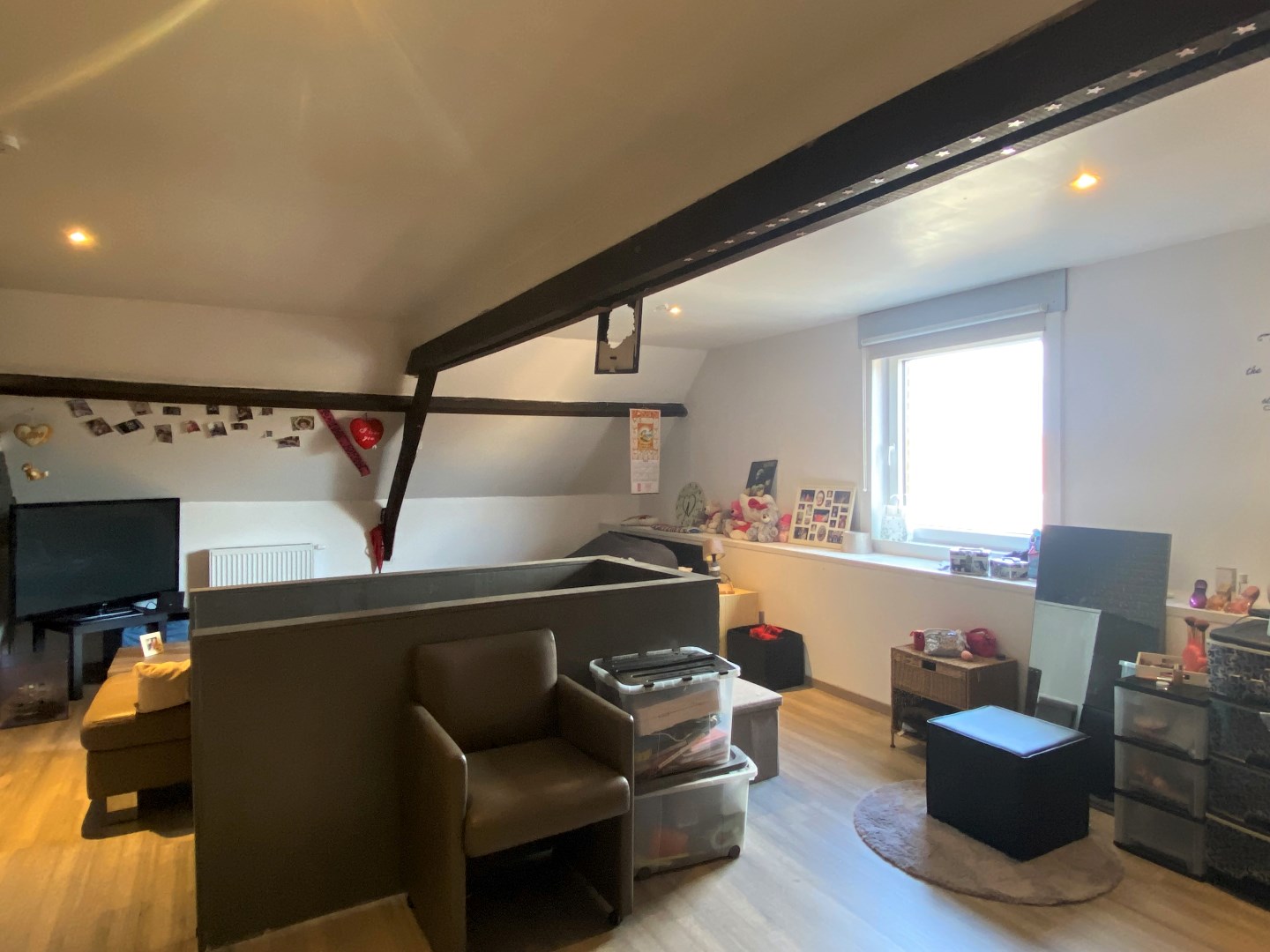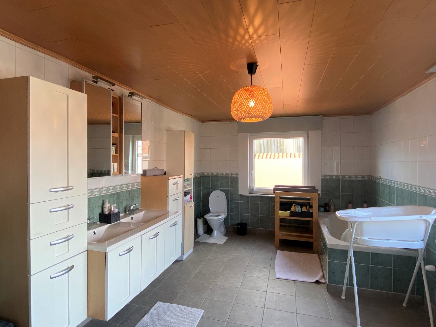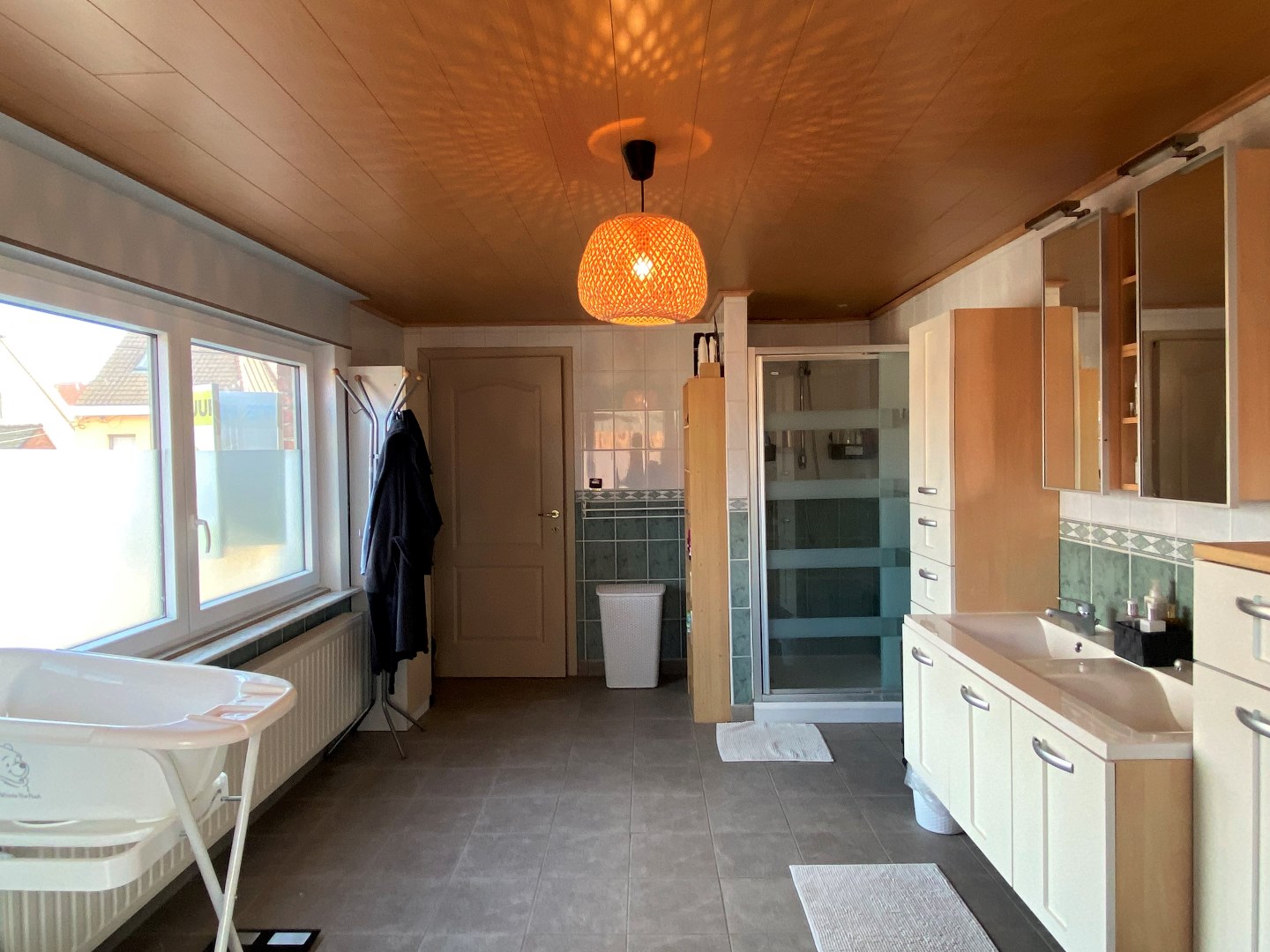 Via de vaste trap komt u terecht op het verdiep. Het verdiep omvat 2 slaapkamers en een ruime badkamer met ligbad, douche, dubbele lavabo en toilet. Tot slot komt u via tweede slaapkamer terecht op het zolderverdiep die werd opgefrist tot een 3de slaapkamer.