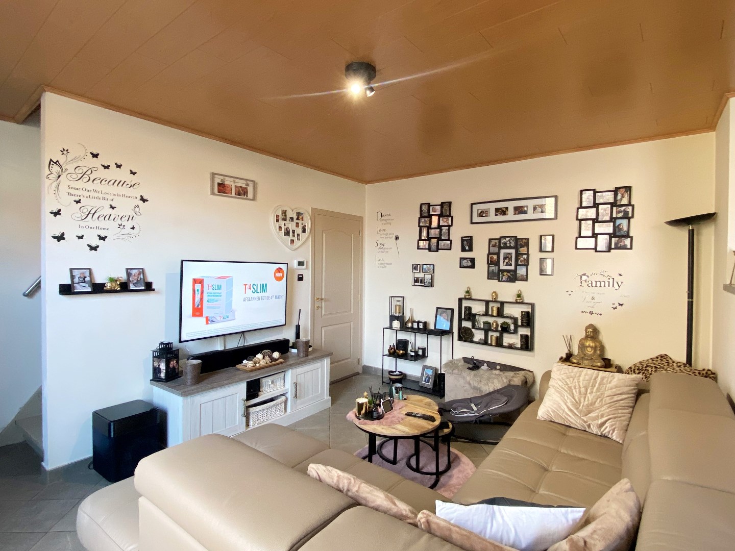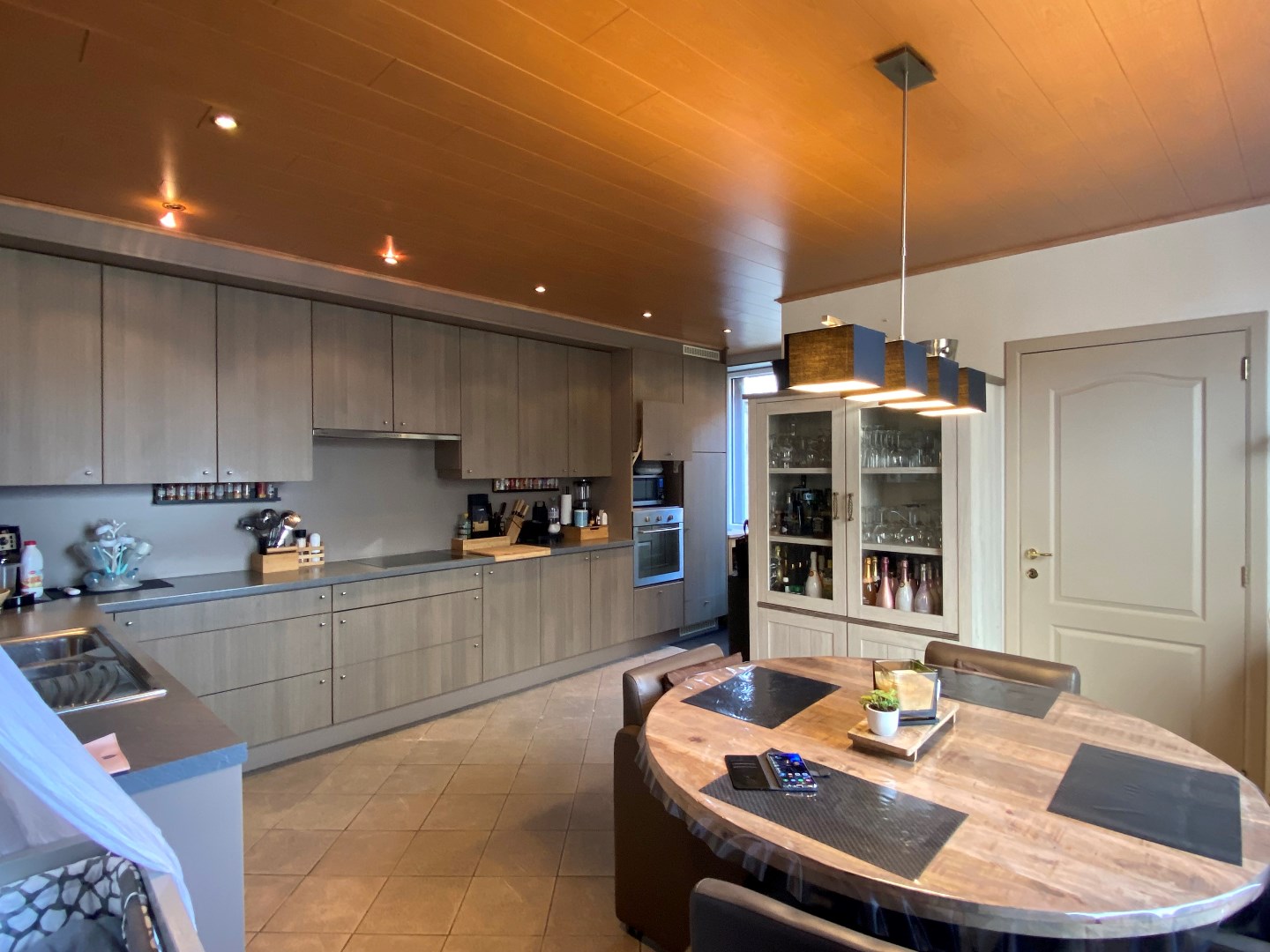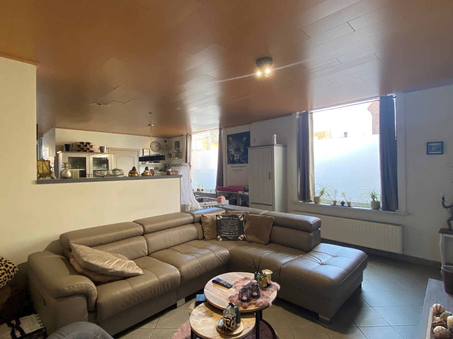 U komt binnen via het salon die uitgeeft op de woonkamer met open ingerichte keuken. De keuken is voorzien van een oven, kookplaat, vaatwasmachine, koelkast en spoelbak. Via de keuken kan u de berging betreden. Hier is een aansluiting voor een wasmachine voorzien. Het toilet bevindt zich ook op de begane grond. Tevens omvat de woning een droge staankelder.
