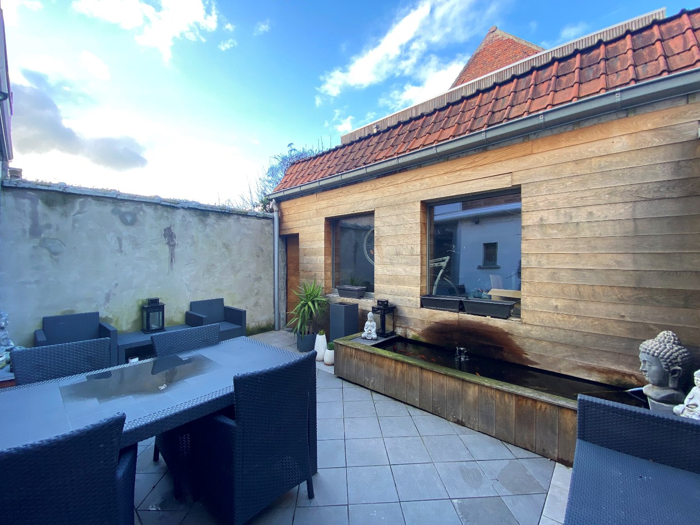 Buiten is er een koer die toegang biedt tot de buitenberging met zolder. Via de koer kan u ook de woning verlaten.