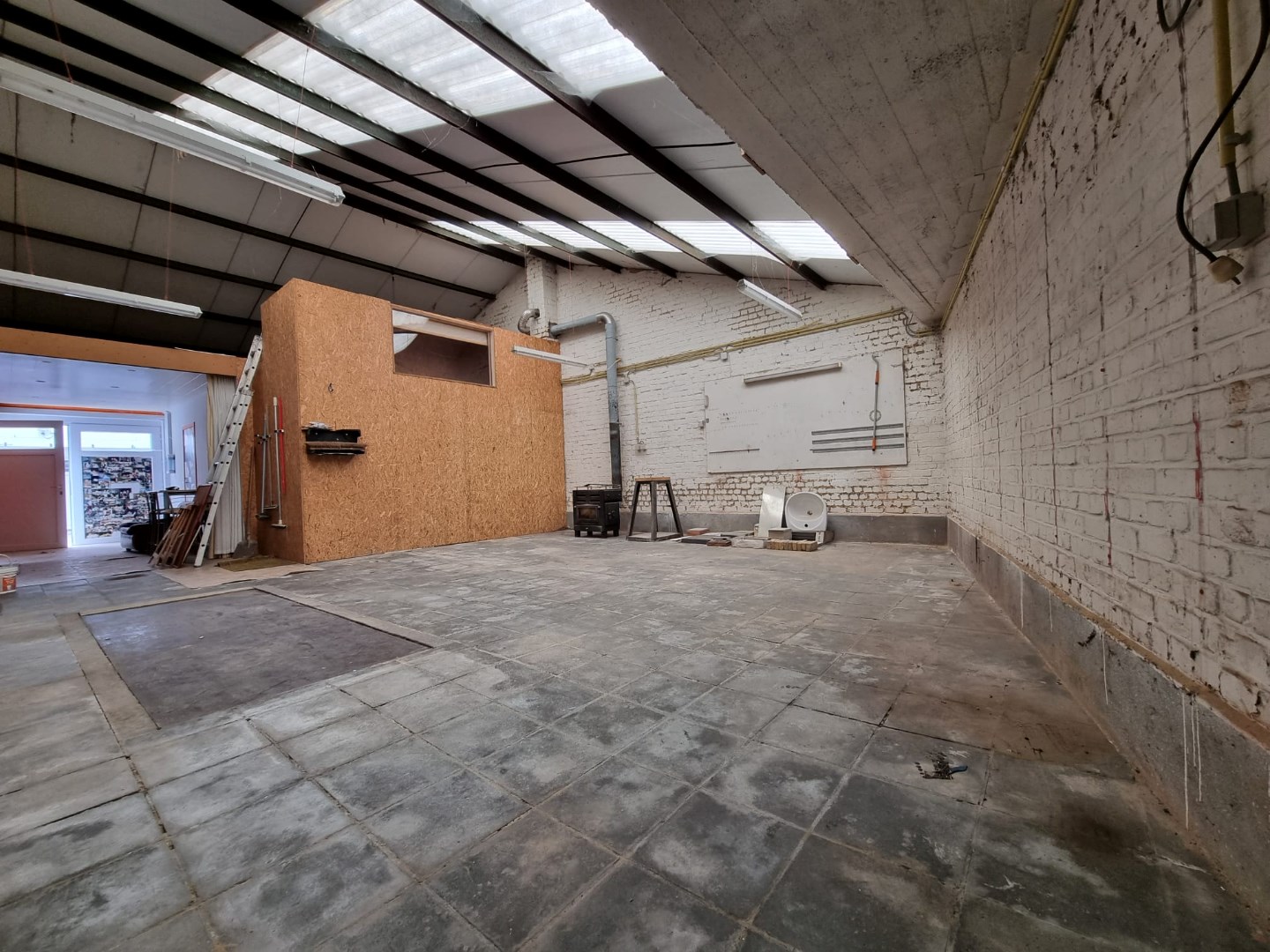 Rechts van de inkom is er toegang tot de dubbele garage van maar liefst 76 m²! Door de dubbele garagepoorten is er tevens directe toegang tot het terras en aansluitend de loods/opslagplaats van 100 m²! Als laatste op het gelijkvloers is er een koele berging en ruime wasplaats.