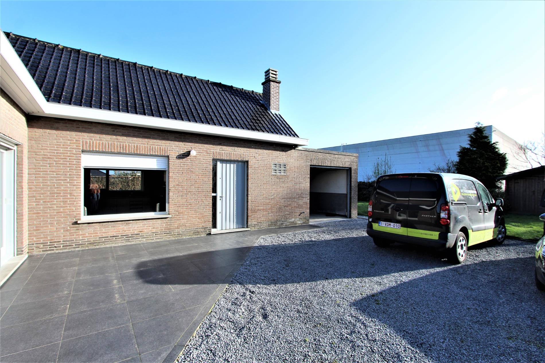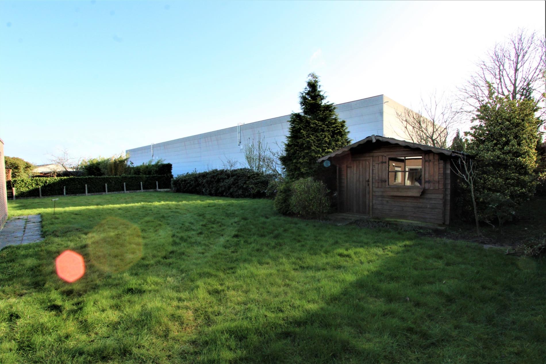 De woning wordt omgeven door gras en een terras + oprit. Het gras wordt nog opnieuw gezaaid zodra het weer dit toelaat. Op de oprit is er plaats voor enkele wagens te parkeren alsook is er een tuinhuis aanwezig.