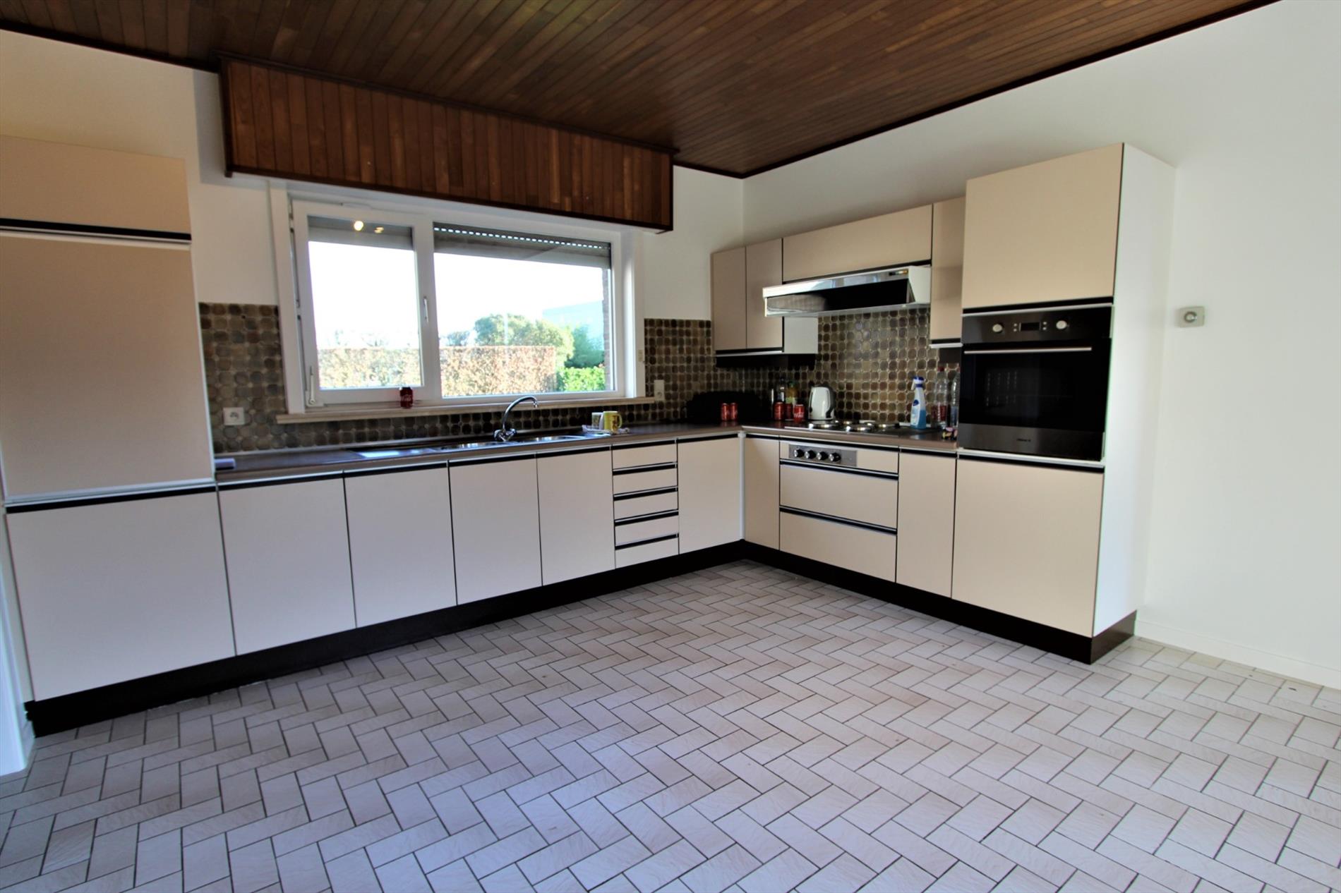 De keuken is voorzien van een dubbelvoudige spoelbak, een koelkast, een kookplaat, een dampkap en een oven.