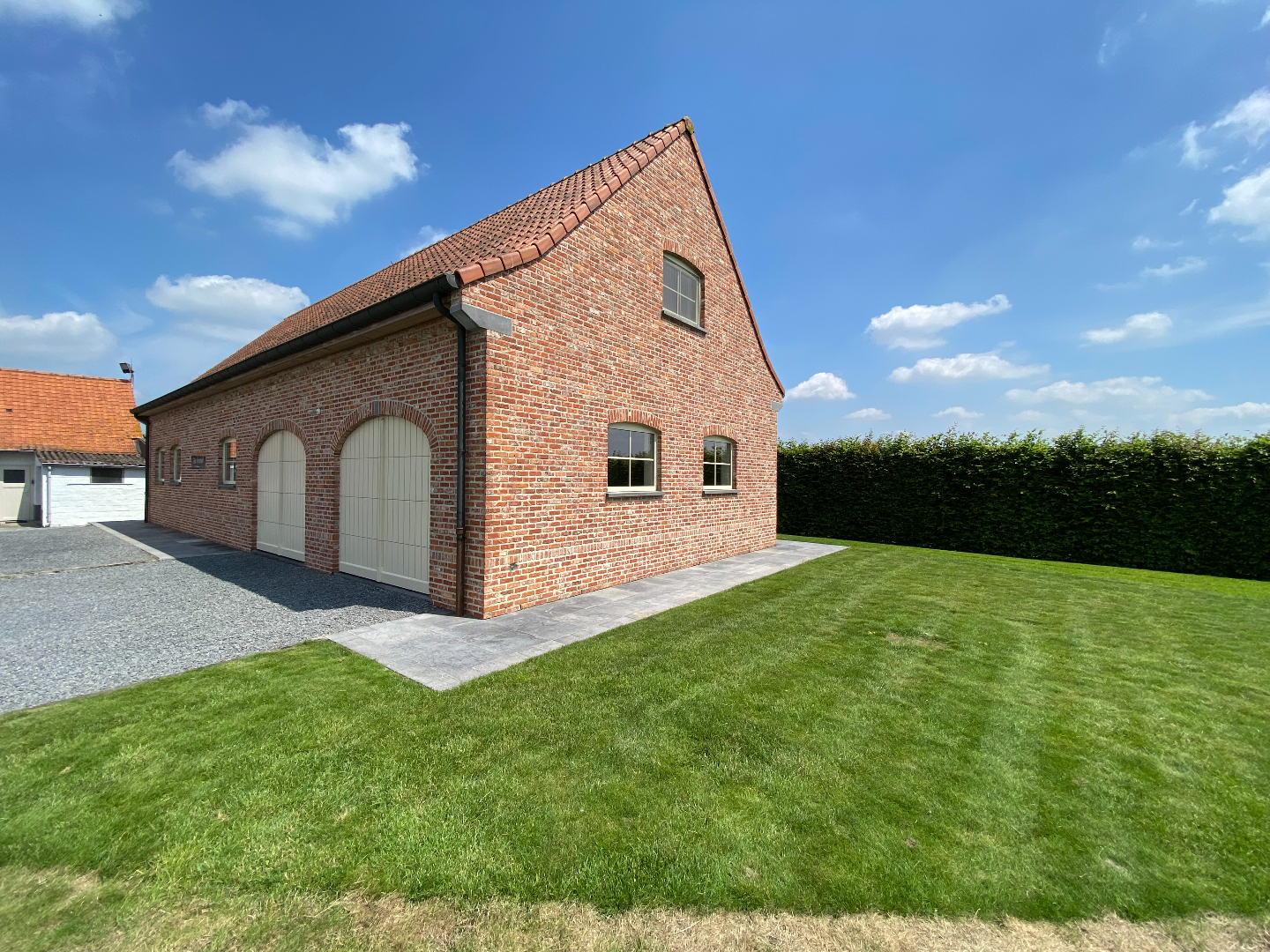 Het losstaand bijgebouw omvat de wasplaats met douche en toilet, een bergplaats, dubbele garage met automatische poort en een zeer grote polyvalente ruimte (boven de garages). Ideaal voor een bijberoep/hobby/speelkamer.