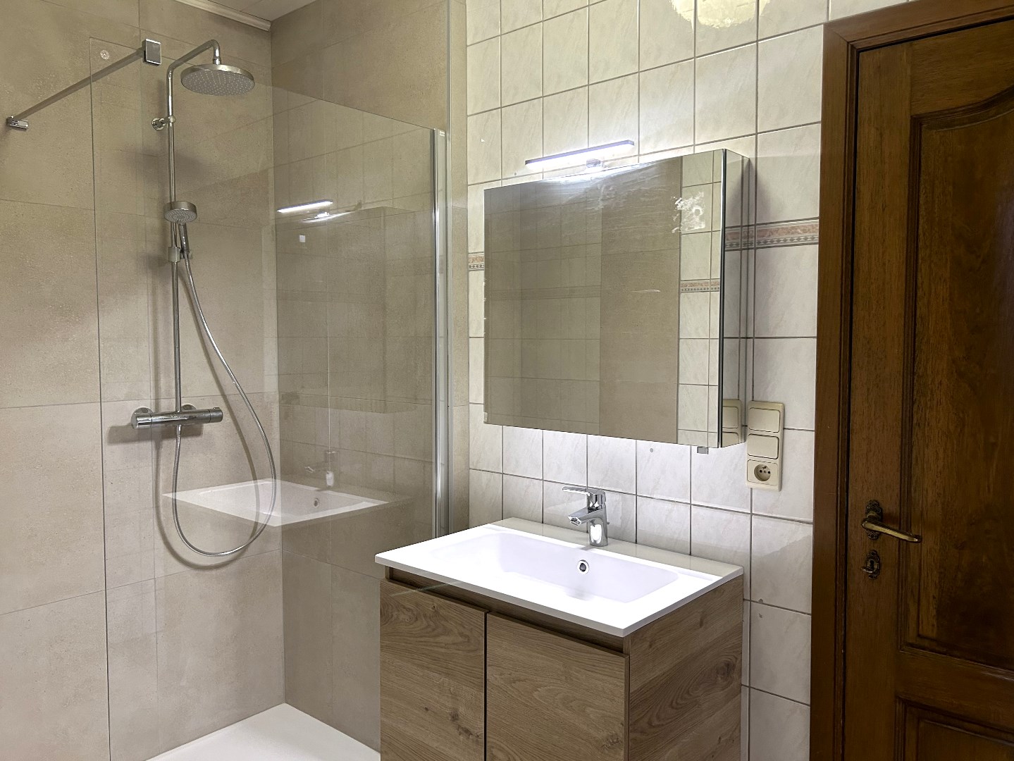 Verder is er op het gelijkvloers een eerste slaapkamer en gerenoveerde douchekamer met toegang tot de berg- en wasplaats.
