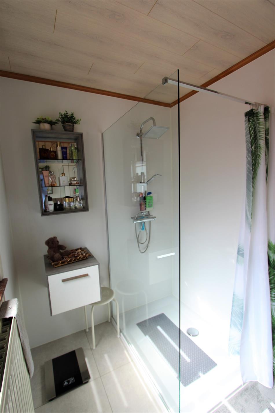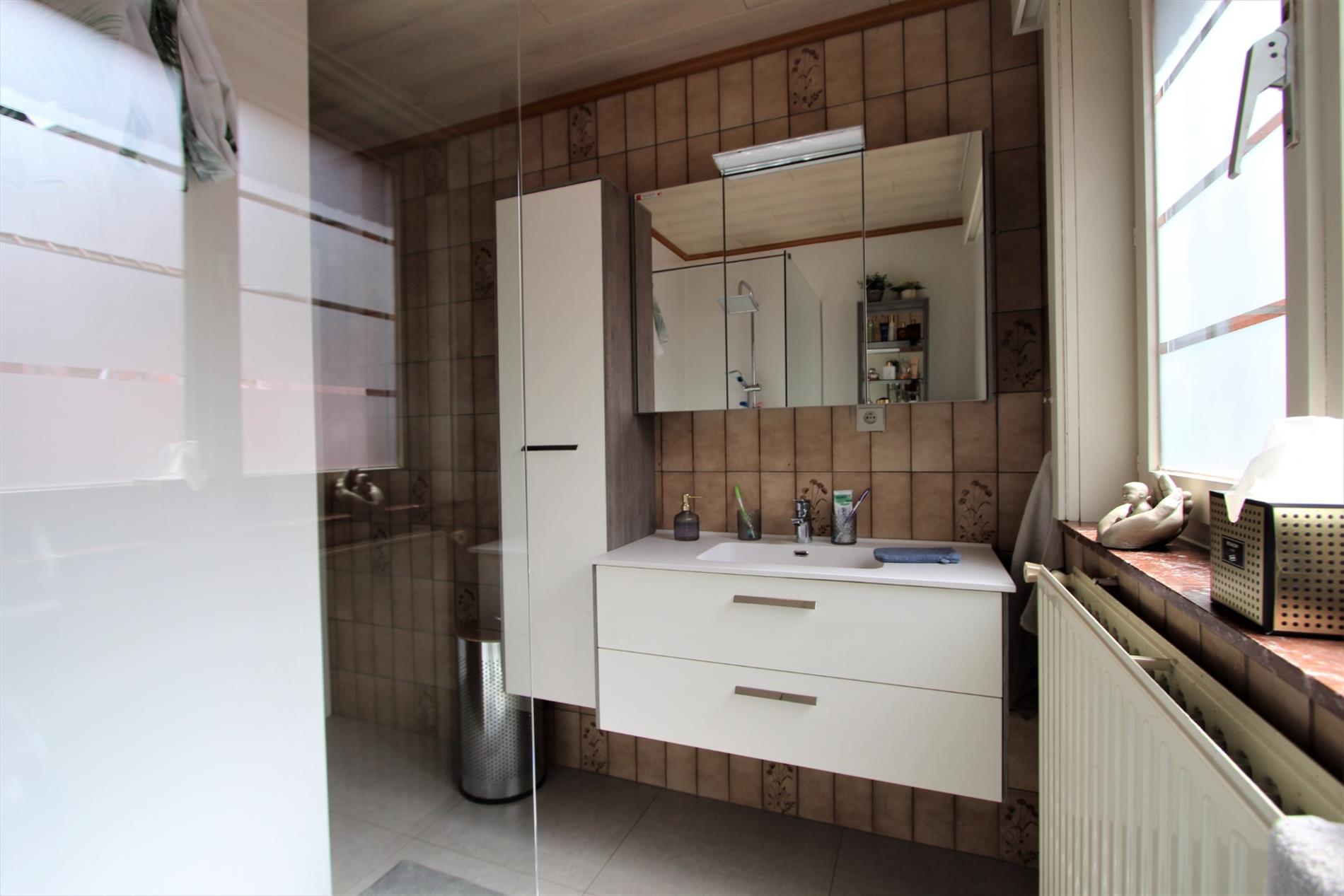 De badkamer is terug te vinden op het gelijkvloers, werd gerenoveerd in 2018 en omvat een nieuwe inloopdouche en een lavabo.