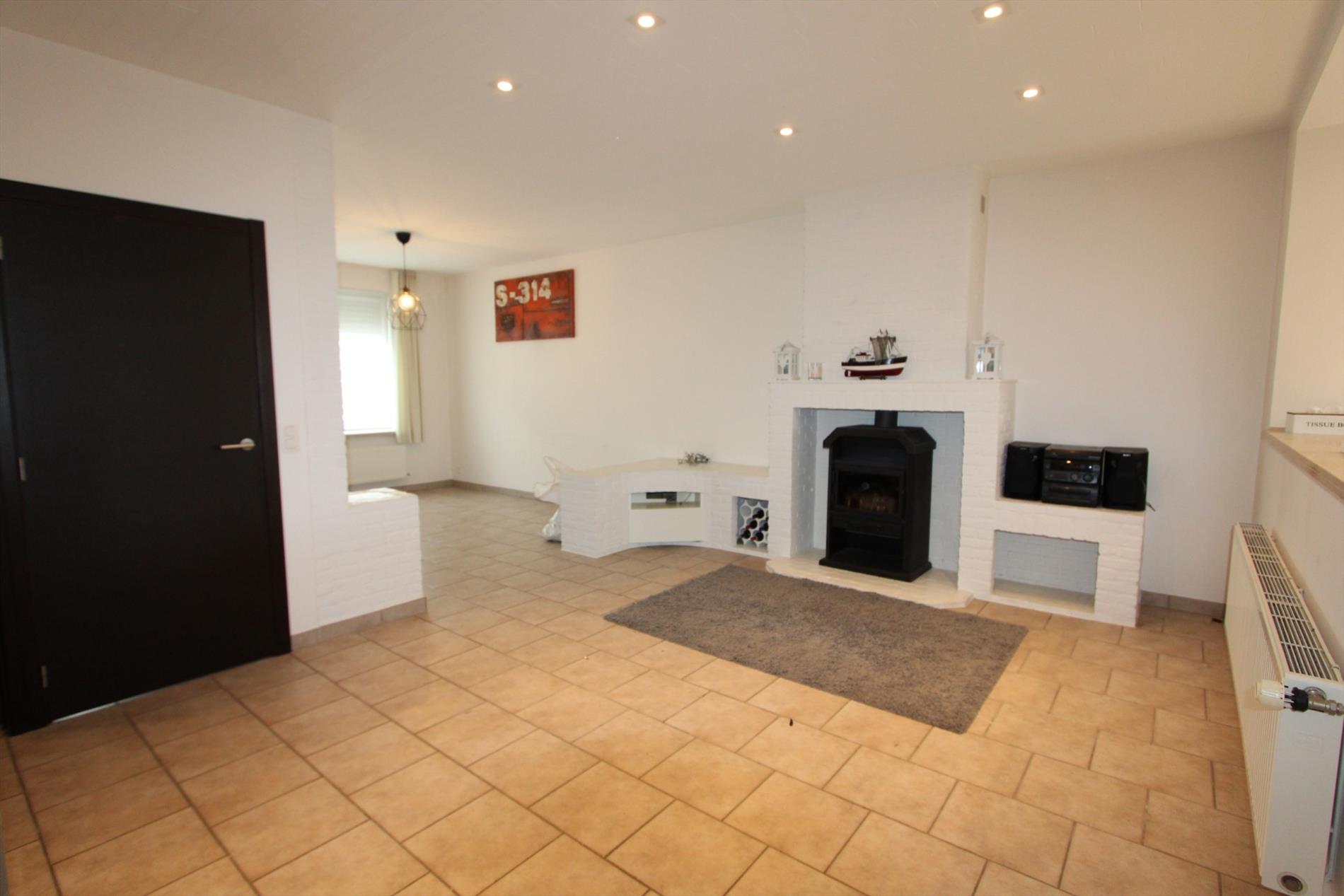 De woning omvat op het gelijkvloers een inkomhal, ruime woonkamer (eetruimte en zitruimte) met aansluitend de open ingerichte keuken. In de woonkamer is er ook een houtkachel aanwezig. De keuken omvat een spoelbak, vaatwas, keramische kookplaat, dampkap en een oven. De keuken biedt toegang tot de kelder of tot de achteringang.