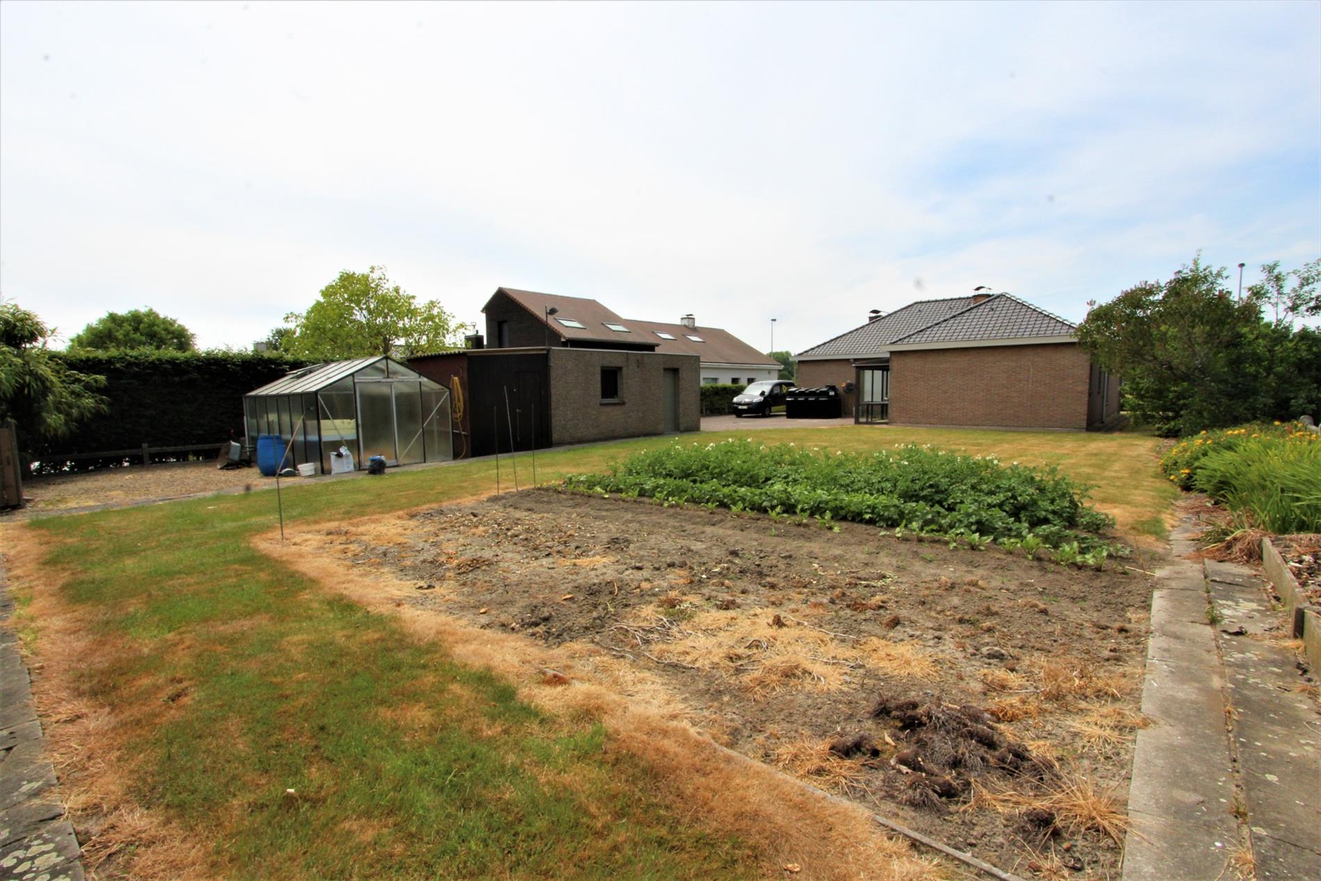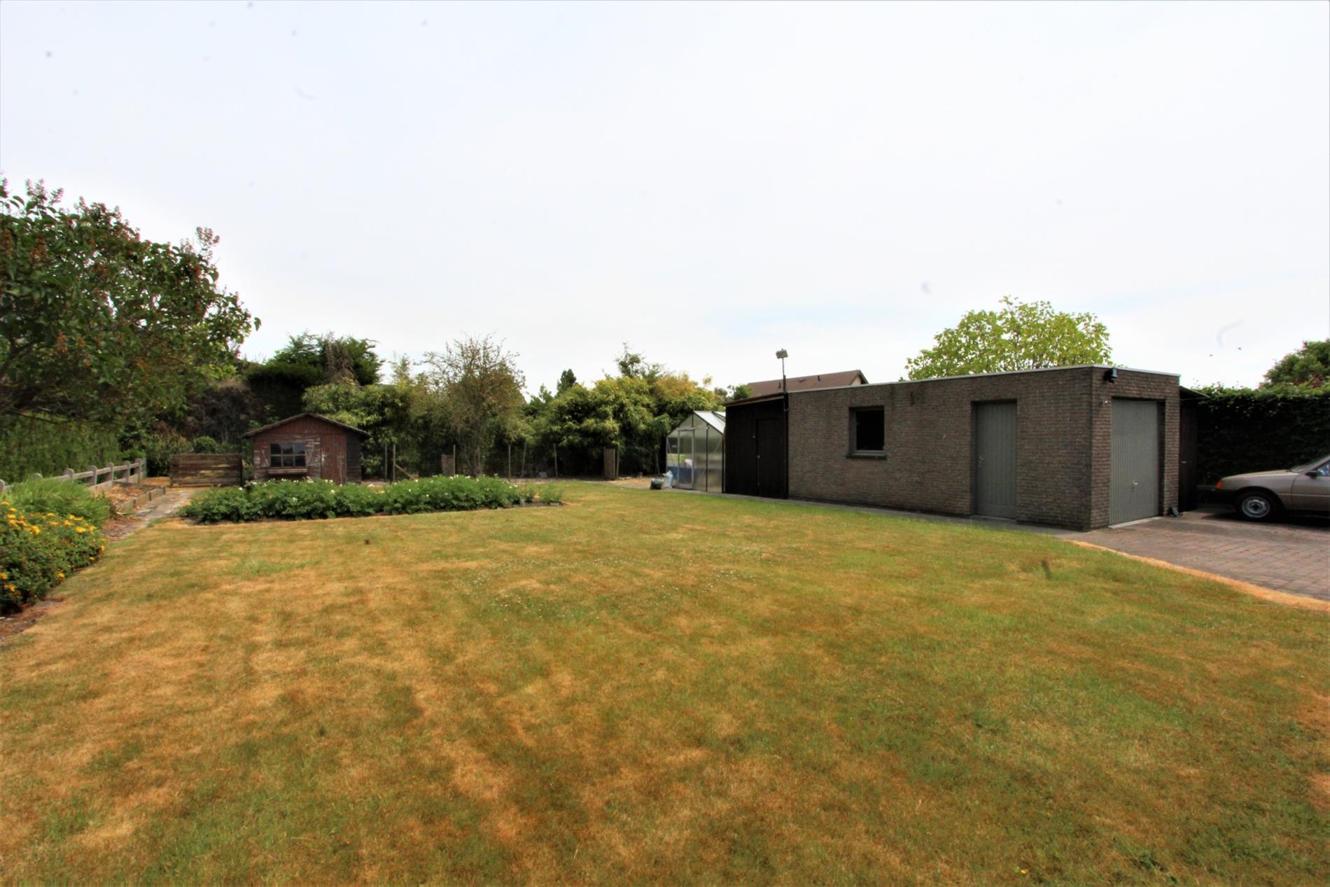 Het exterieur van deze woning is voorzien van een losstaande garage met elektrische garagepoort, een voortuin, een achtertuin, een terras, een tuinhuis en een serre.