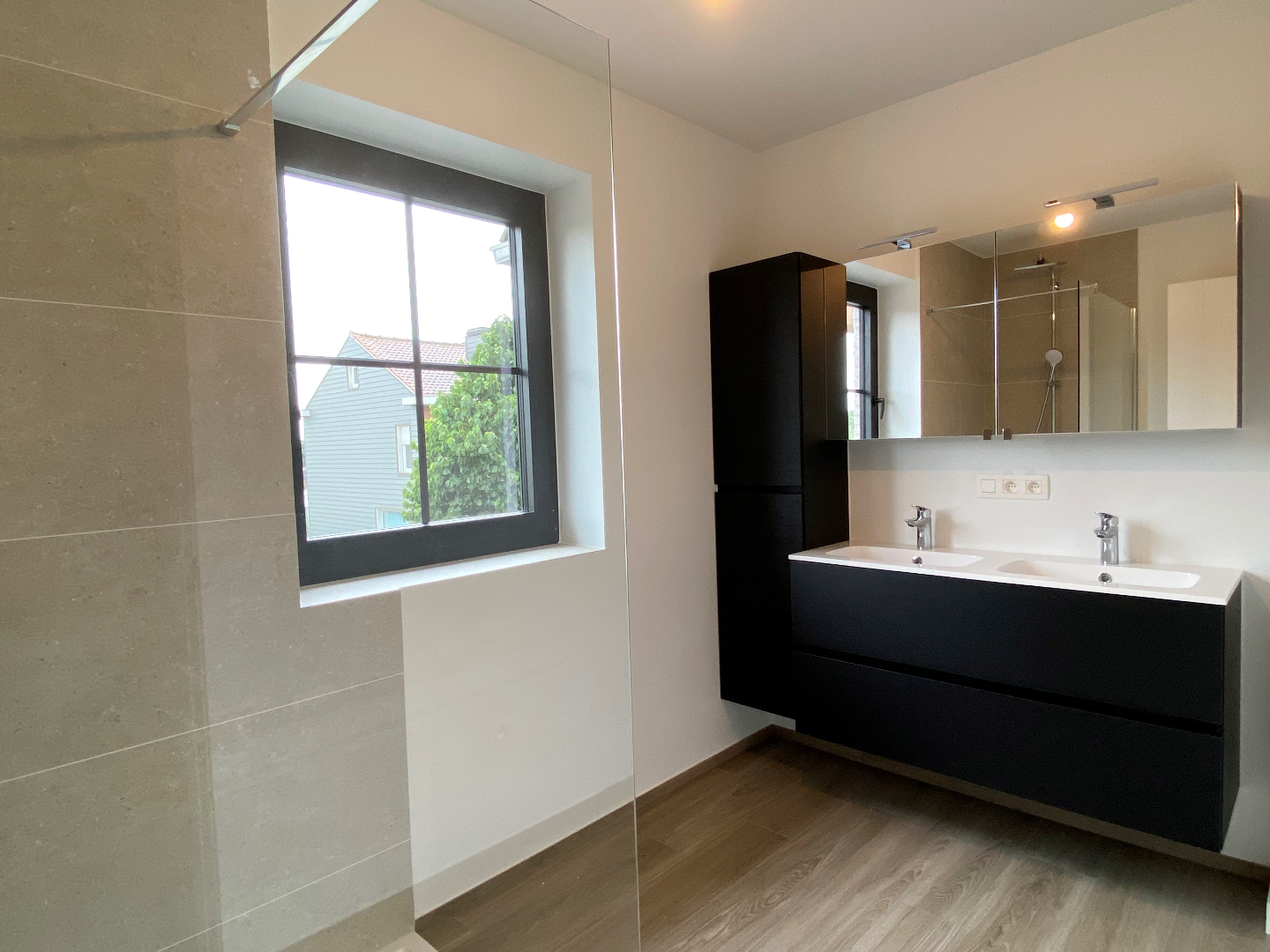 Op het verdiep zijn er 3 volwaardige slaapkamers (13,35 m²,10,97 m² en 10,11 m²), apart toilet met ingemaakte kast en een moderne badkamer met dubbele lavabo en een inloopdouche.
