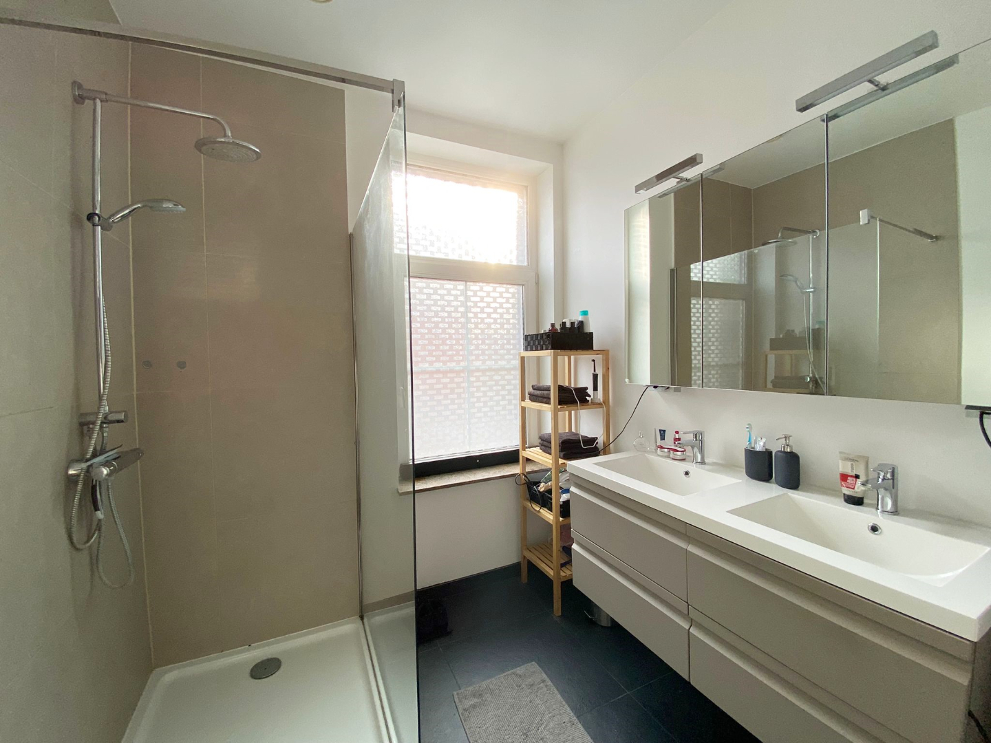 Het verdiep bestaat uit een nachthall, twee ruime slaapkamers en één kleinere kamer, een apart toilet en een moderne badkamer ( inloopdouche - dubbele lavabo).