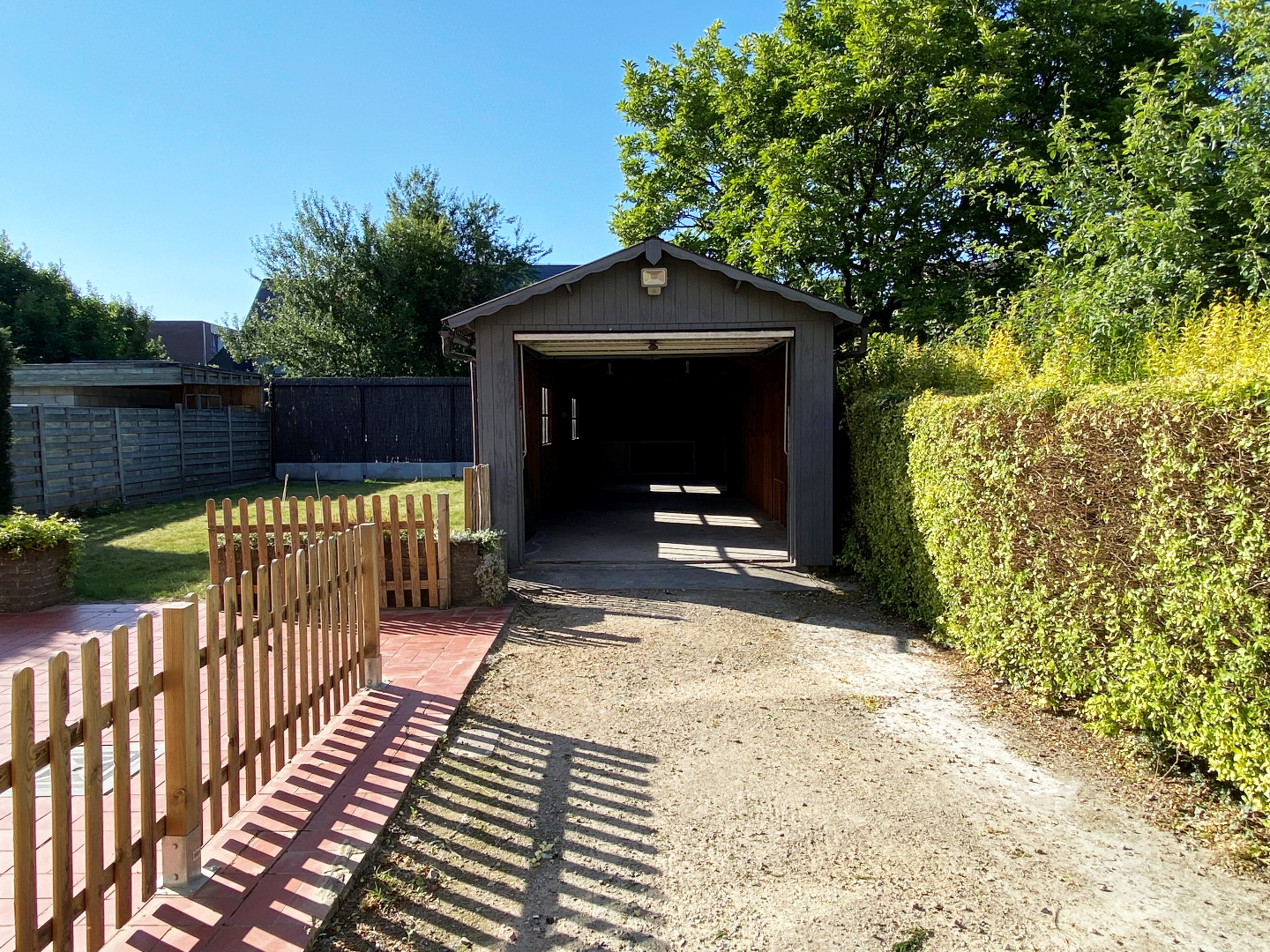 De woning biedt een ruime achtertuin met vrijstaande garage (geautomatiseerde poort) en private parkeergelegenheid voor 3 wagens. In de straat is er ook mogelijkheid tot parkeren.
