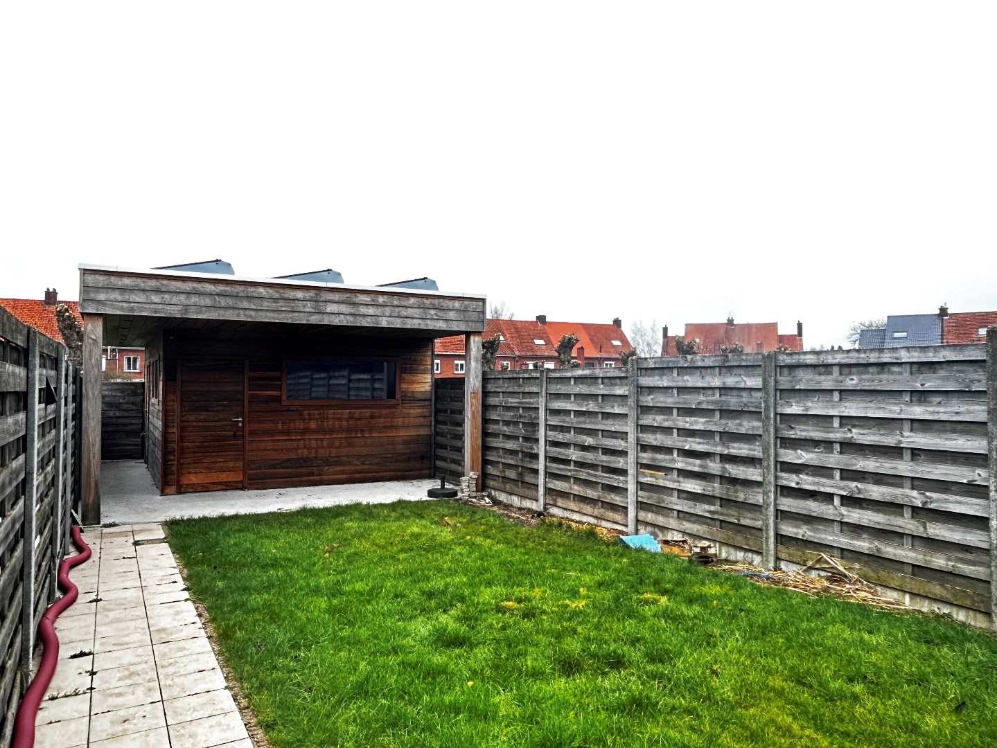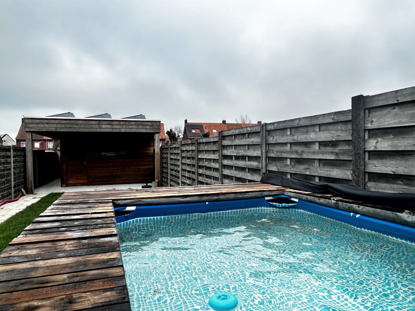 De zonnige tuin in voorzien van een verwarmd zwembad in opbouw, recent tuinhuis (2021), overdekt terras en biedt toegang tot het openbaar voetbalpleintje via een poortje.