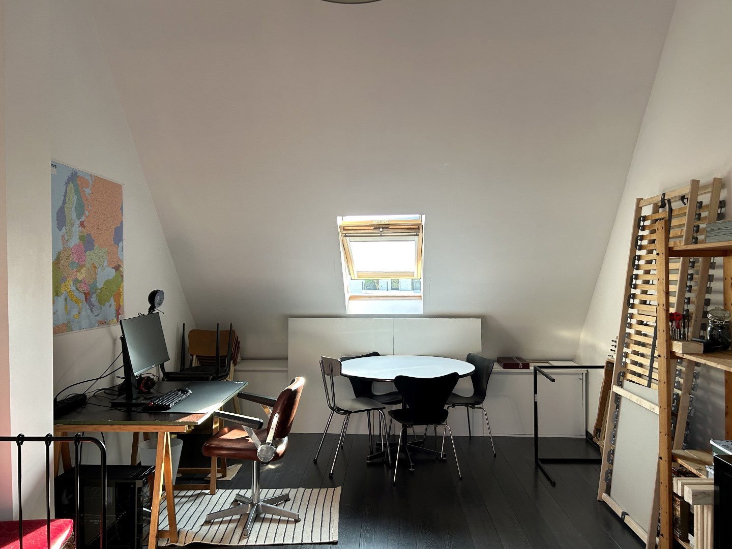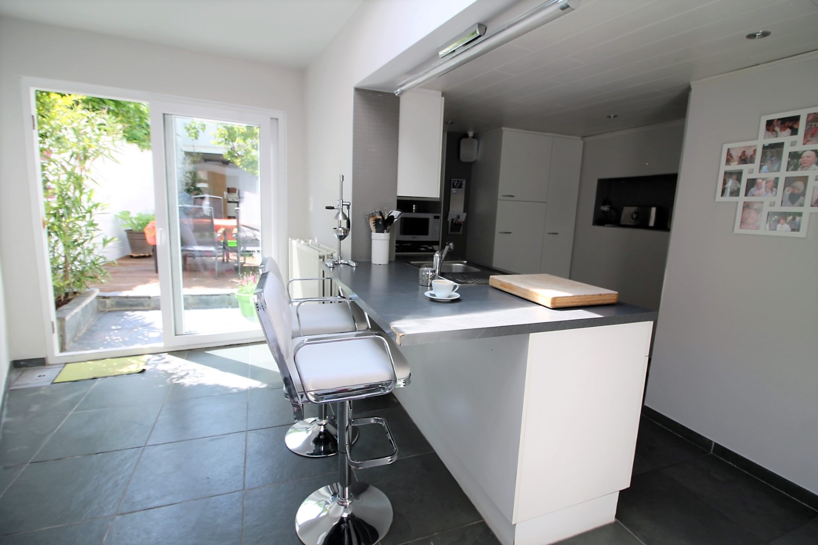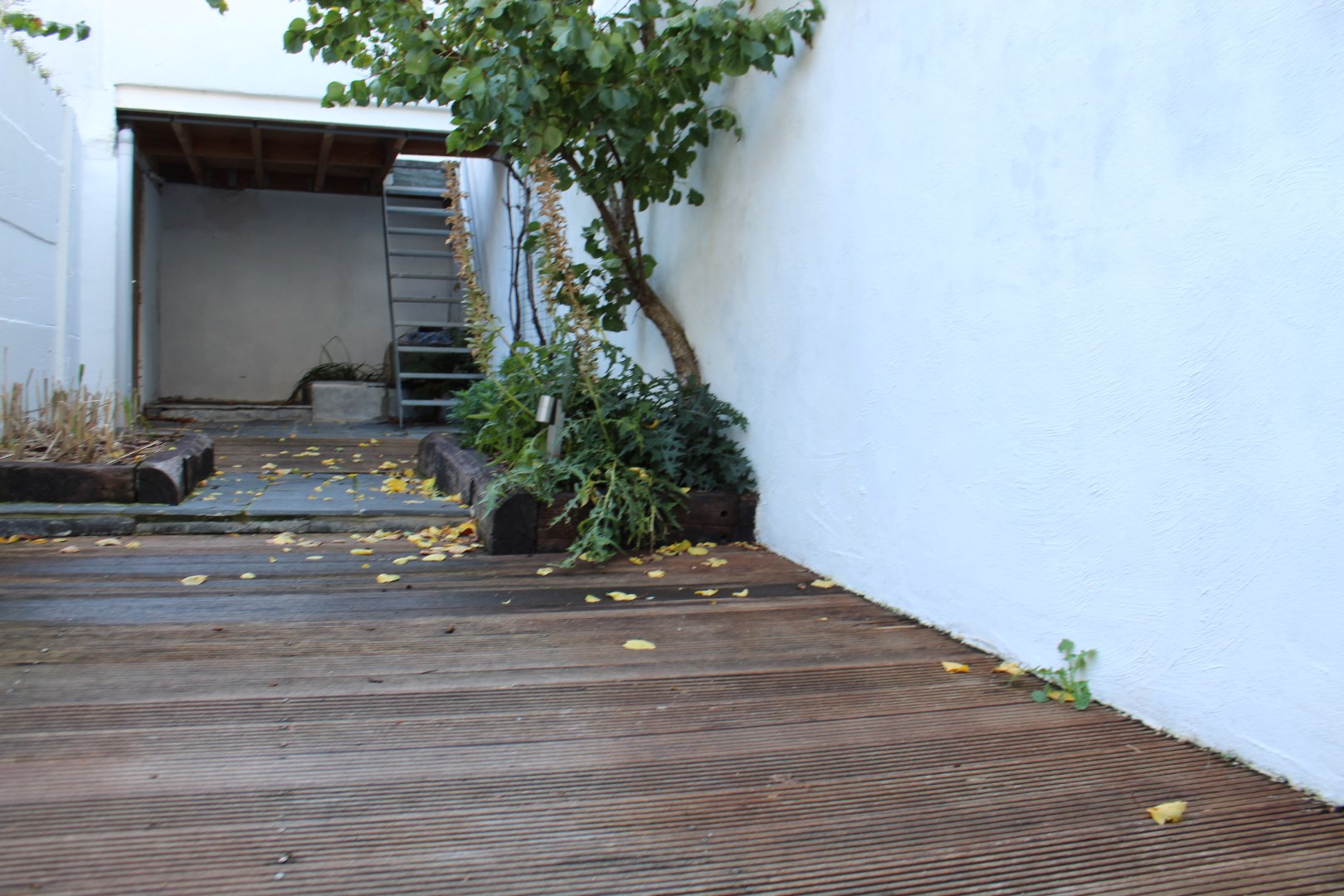 De woning bestaat uit een inkomhall en verleent toegang tot de leefruimte met open ingerichte keuken en berging. Via het schuifraam kan u het terras betreden. Via het terras krijgen we toegang tot het toilet en extra berg/wasruimte. Via de vaste trap komen we op het zonnig dakterras.