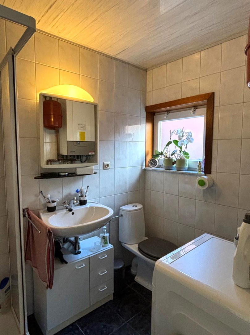 Op het gelijkvloers situeert zich de badkamer met douche, badkamermeubel en toilet. Achter de badkamer is er een kleine berging met aansluitingen voor wasmachine en droogkast.