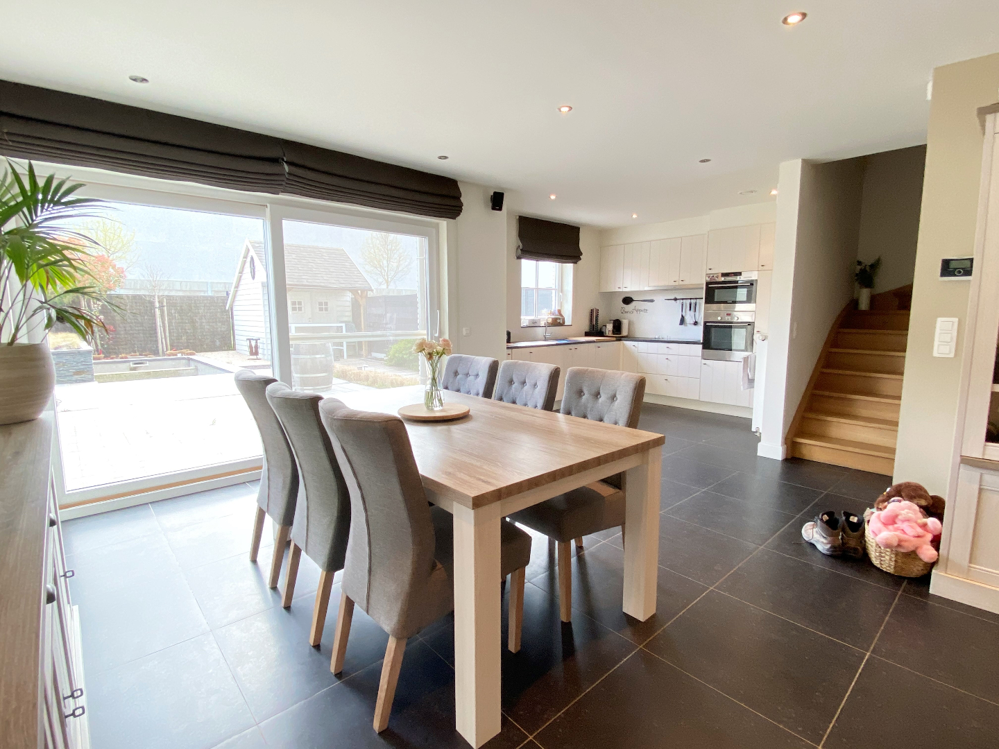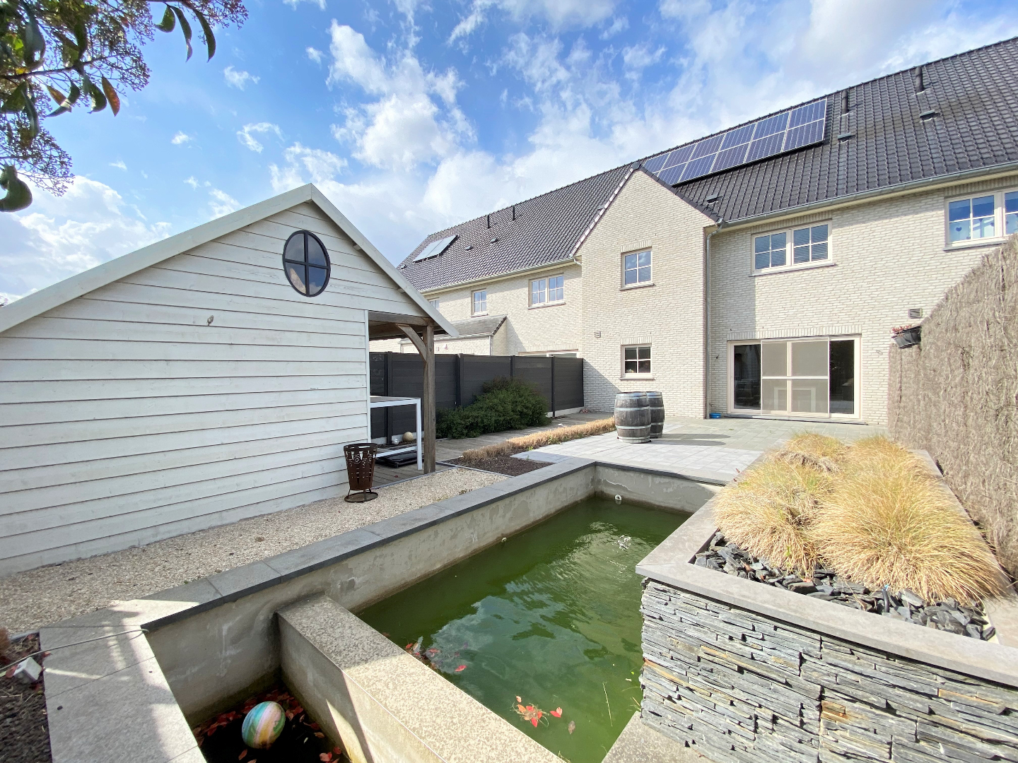 Er is toegang zowel via de keuken als de eetplaats naar de tuin met terras, tuinhuis en zwembad (werken voorzien najaar).