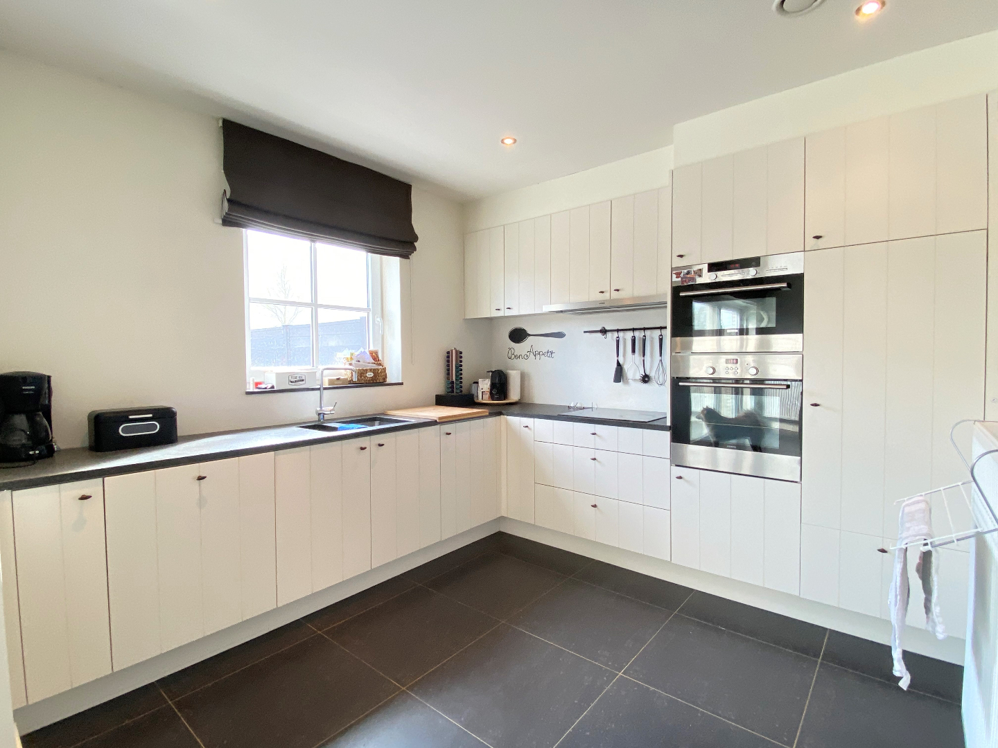 Via de woonkamer kan u de garage betreden met spoelbak en aansluitingen voor de wasmachine en de droogkast.