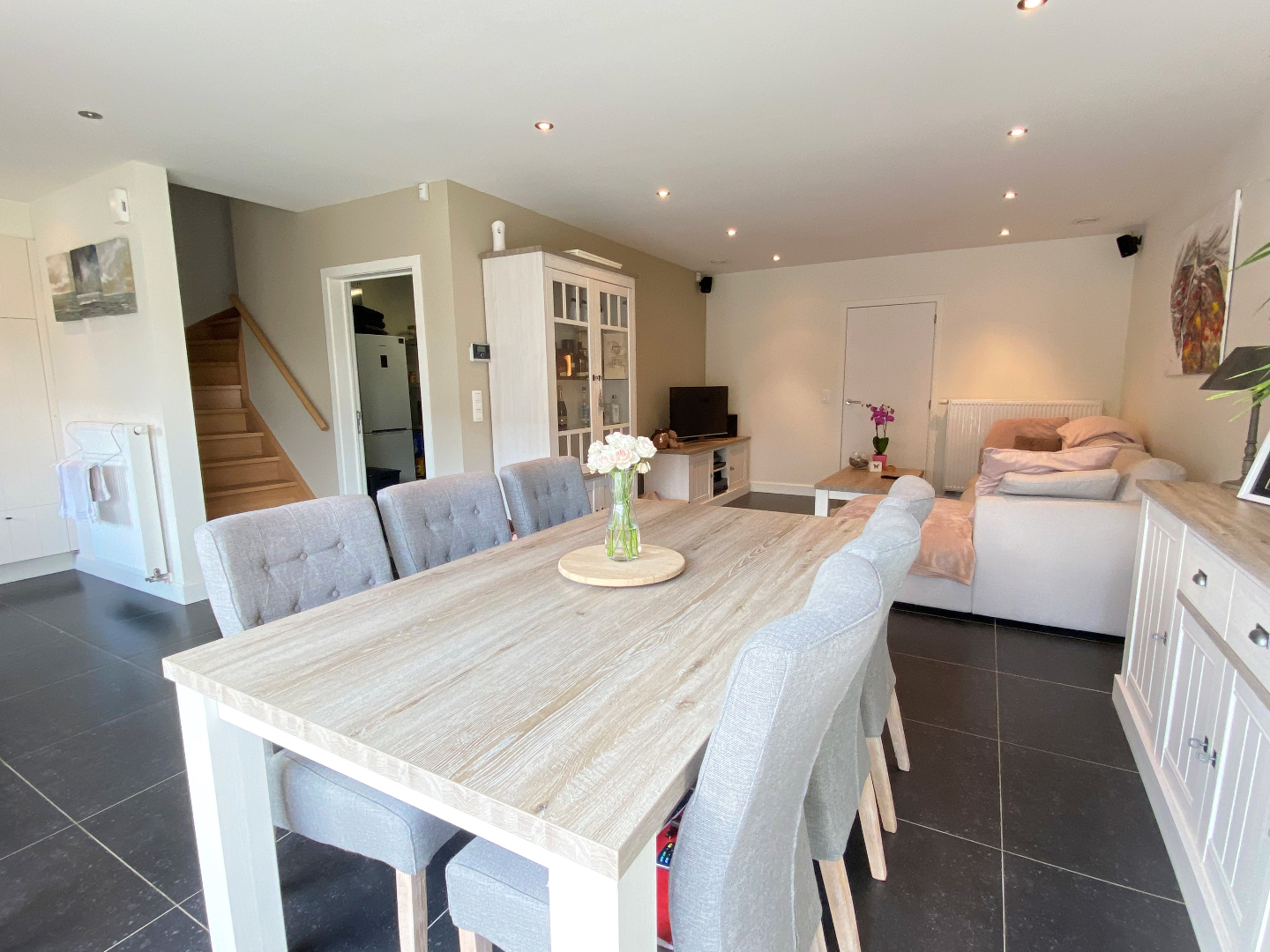 U komt binnen in de inkomhal met ingemaakte kasten en apart gastentoilet met handenwasser. Aansluitend is er een ruime en lichtrijke leefruimte voorzien van een zithoek en eethoek. Verder is de open volledig ingerichte keuken voorzien van een kookplaat, dampkap, vaatwasser, spoelbak, oven, microgolf en een ruime koelkast.