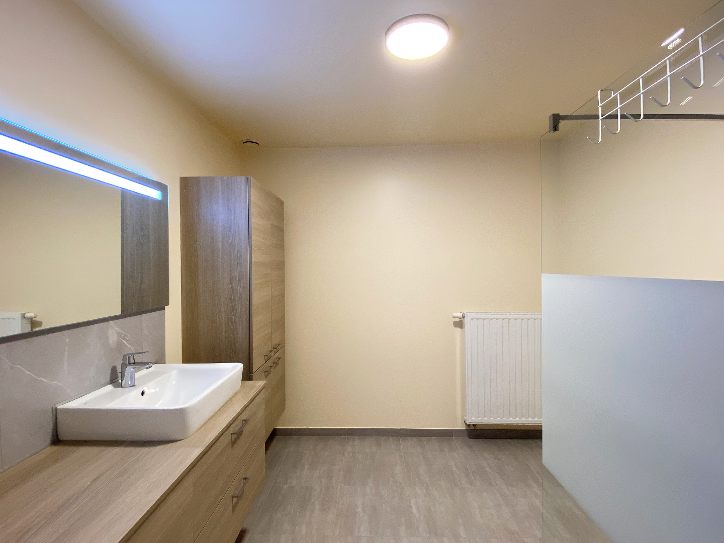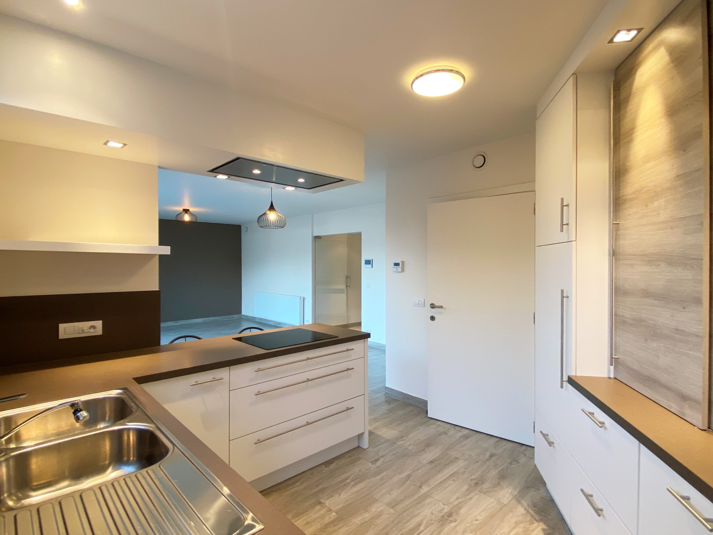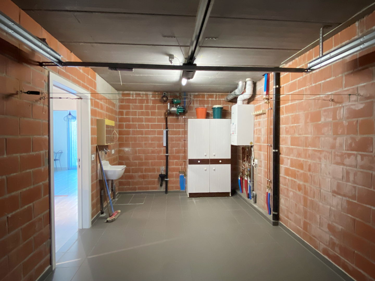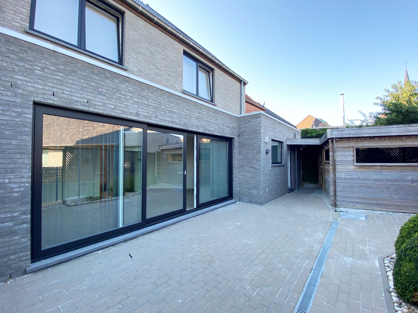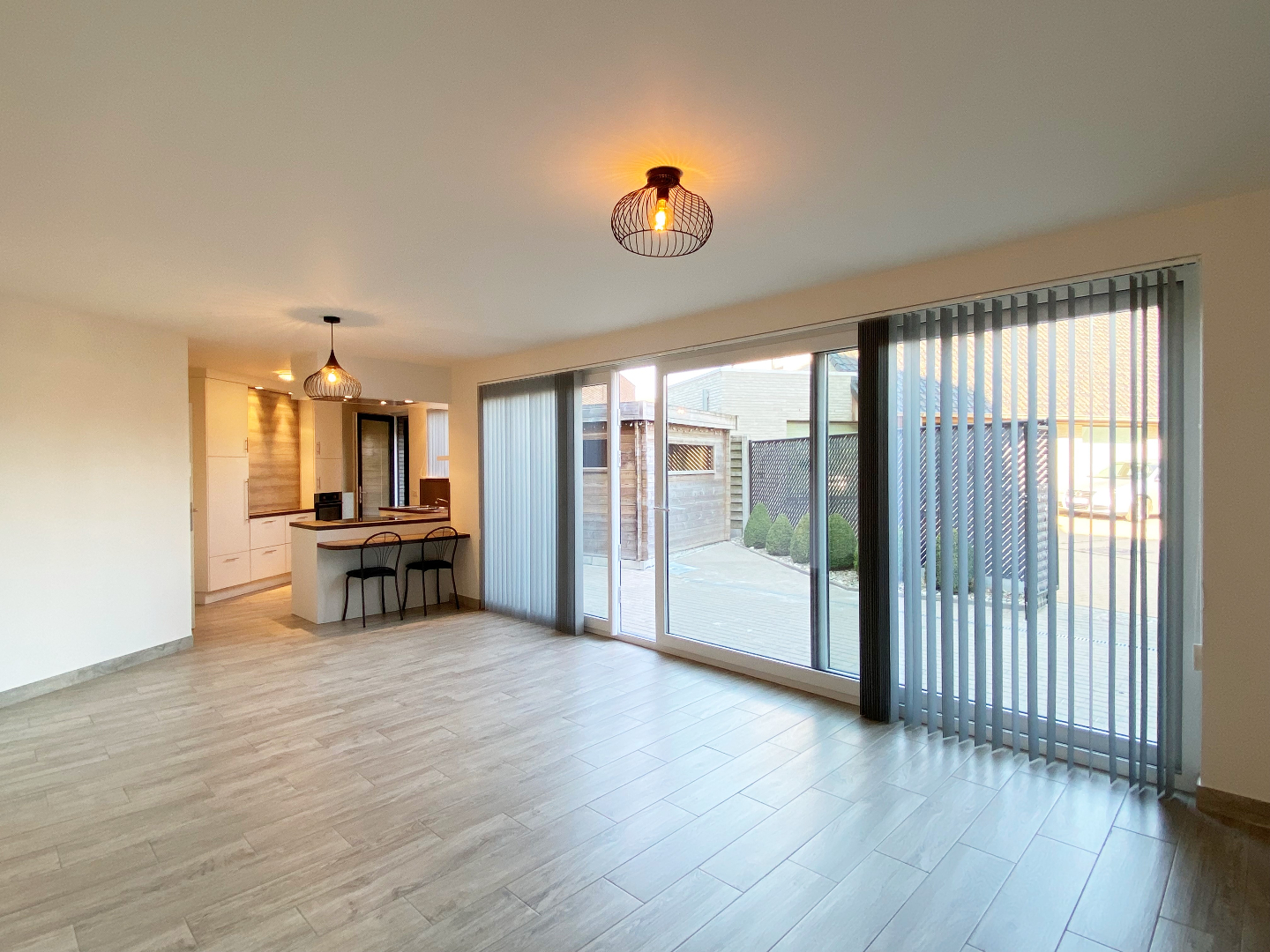 U komt binnen via de lichtrijke inkomhal die toegang verleent tot de leefruimte, het apart toilet en de garage met automatische poort en aansluiting voor een wasmachine. De leefruimte kan u afsluiten met een glazen deur. Vervolgens omvat de woning een open ingerichte keuken (koelkast | dampkap | kookplaat | dubbele spoelbak | vaatwasmachine | oven). Naast de keuken is er een praktische bergruimte. De koer kan u betreden langs de keuken en de leefruimte.
