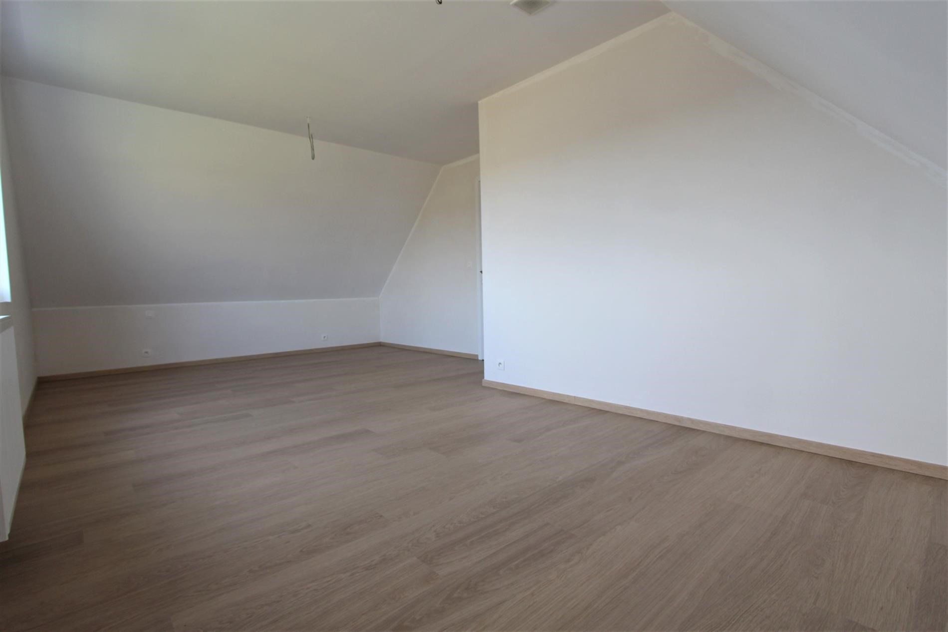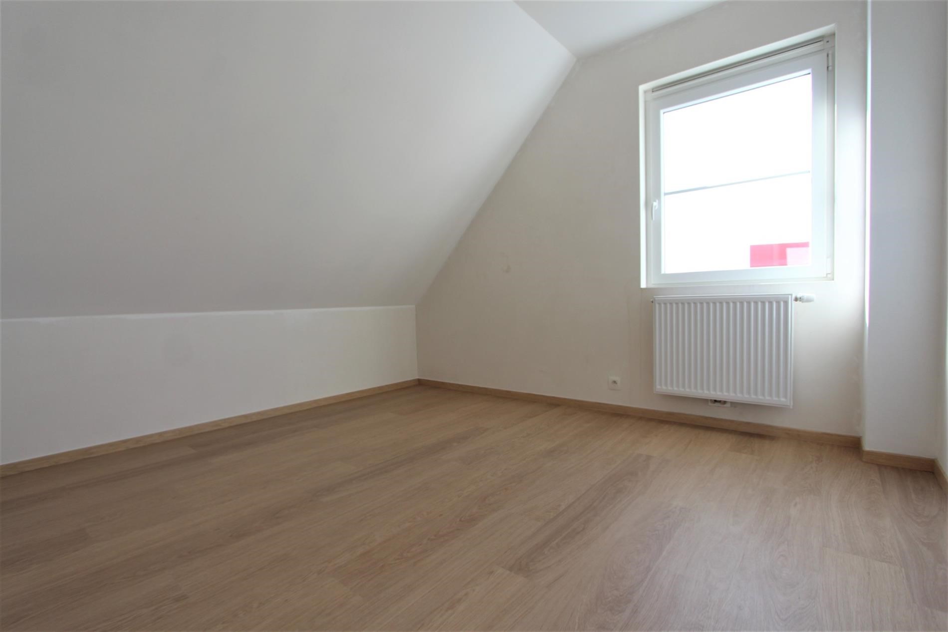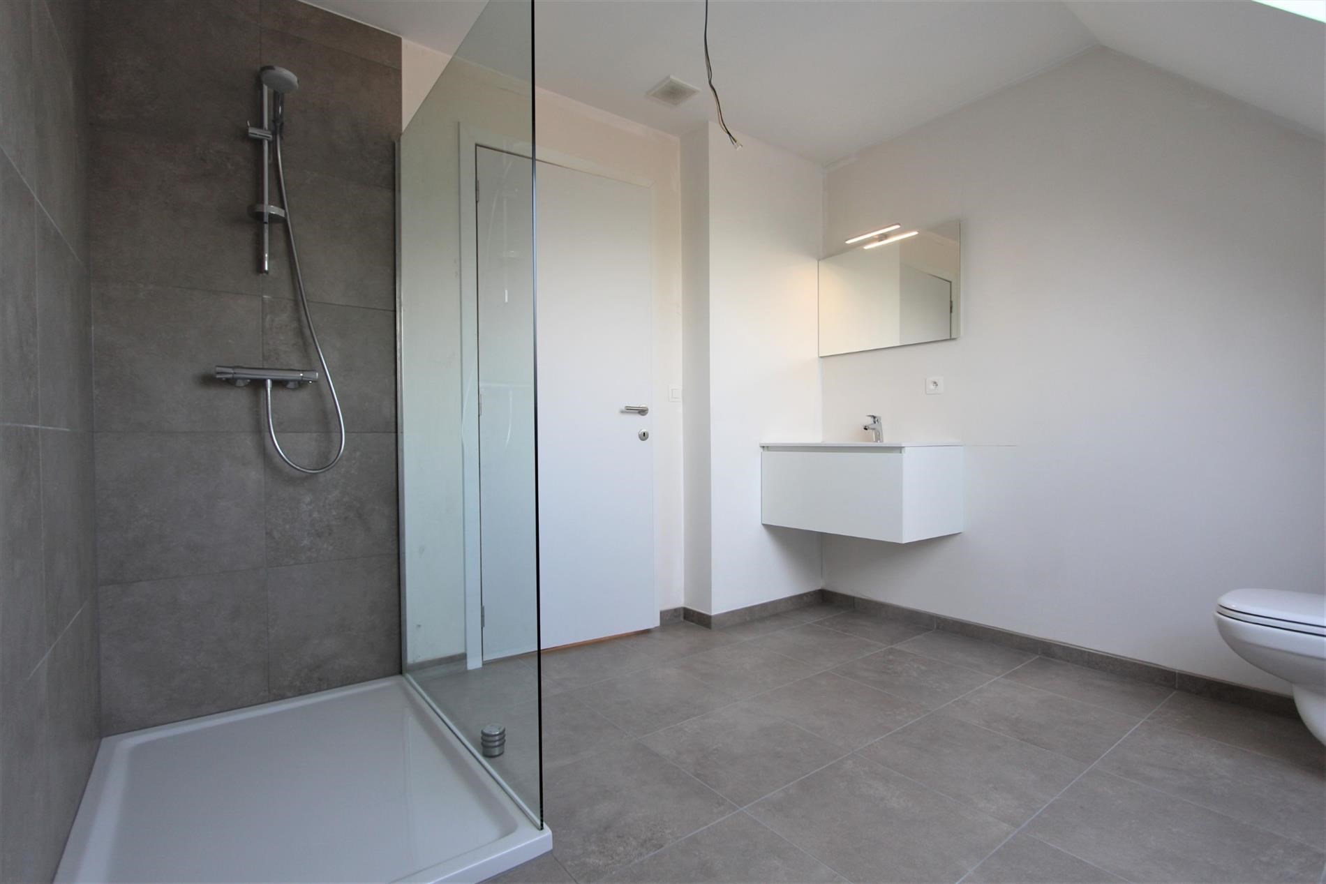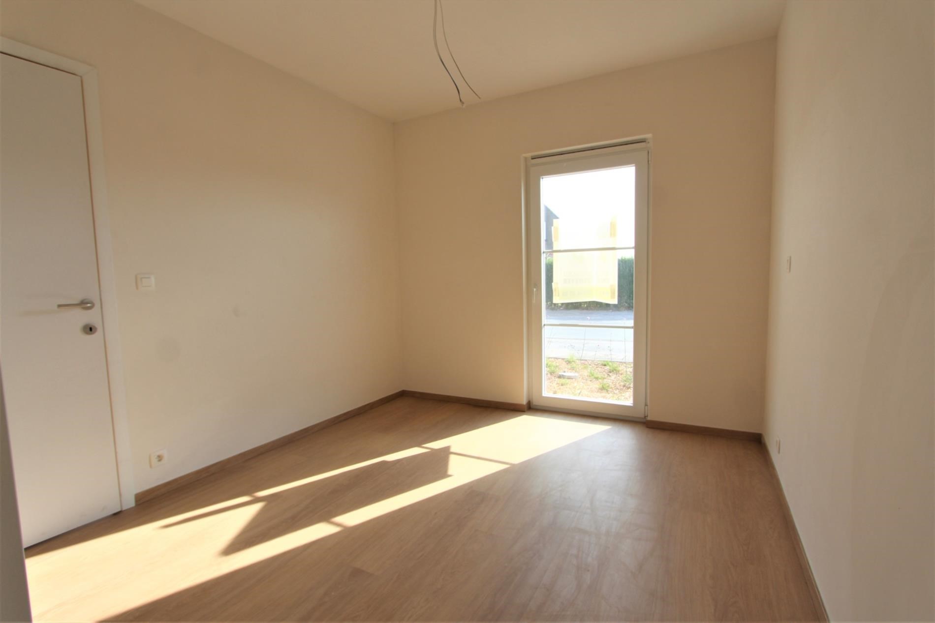 Verder omvat het gelijkvloers de eerste slaapkamer ofwel de bureauruimte. Deze ruimte biedt ook toegang tot een kleine sanitaire ruimte met lavabo en douche.