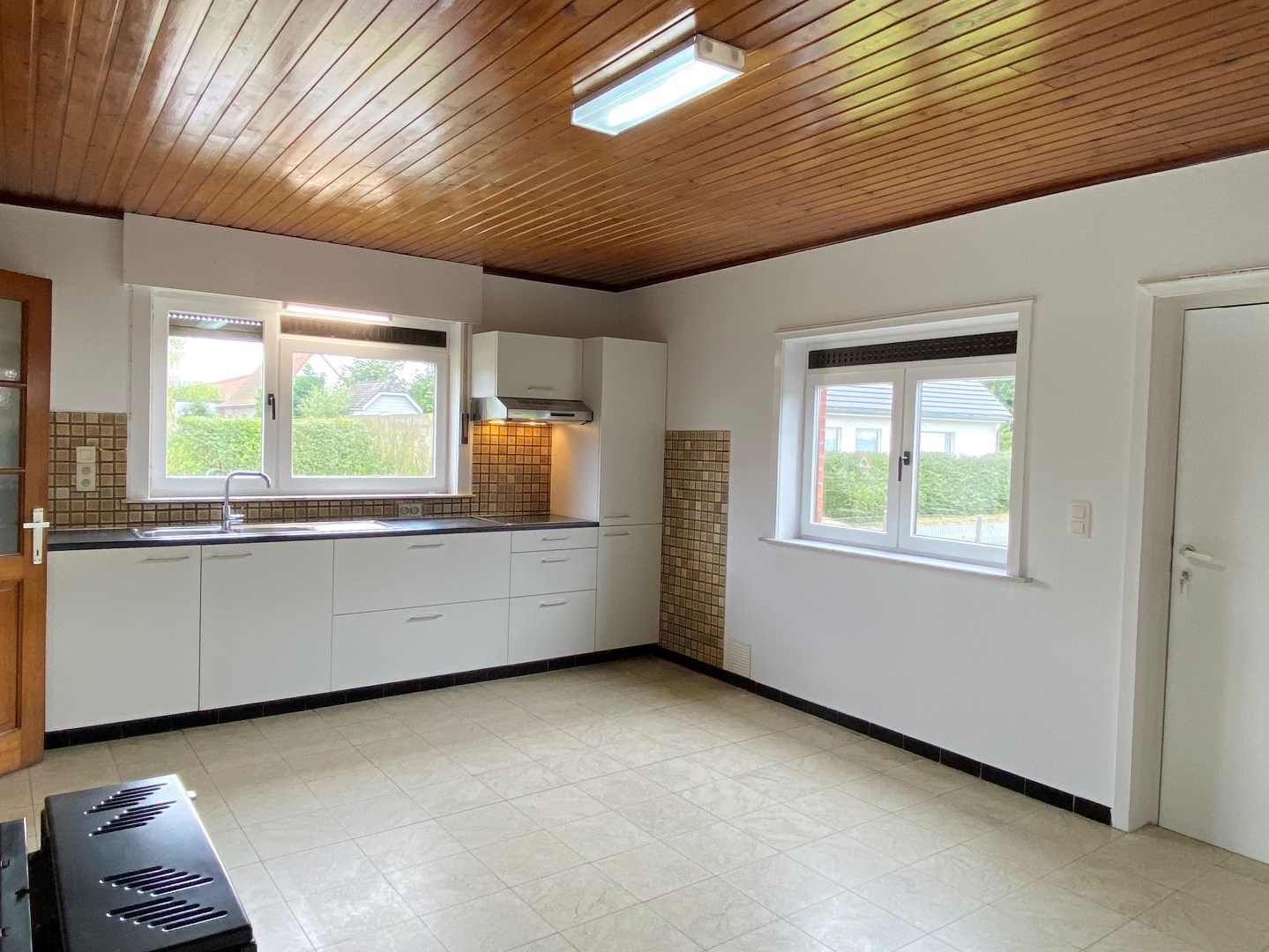 De leefkeuken werd vernieuwd en is voorzien van een kookplaat, dampkap, frigo en spoelbak.
