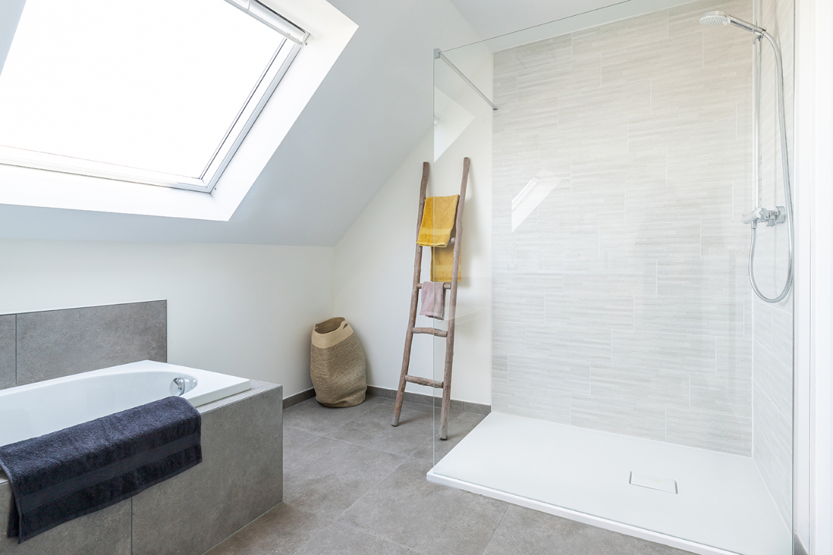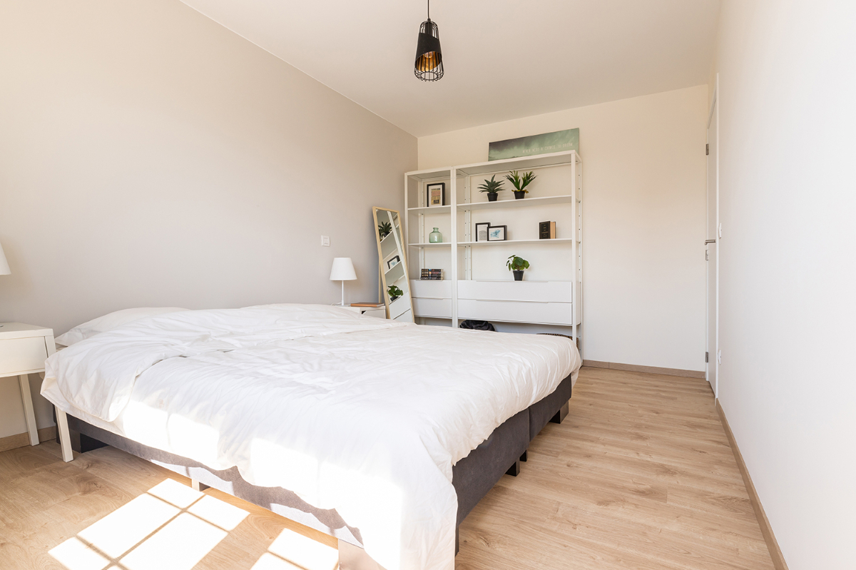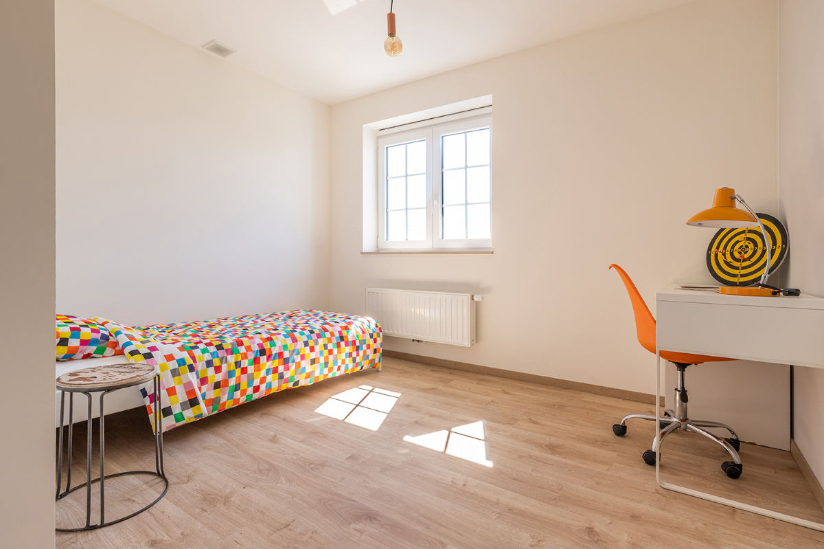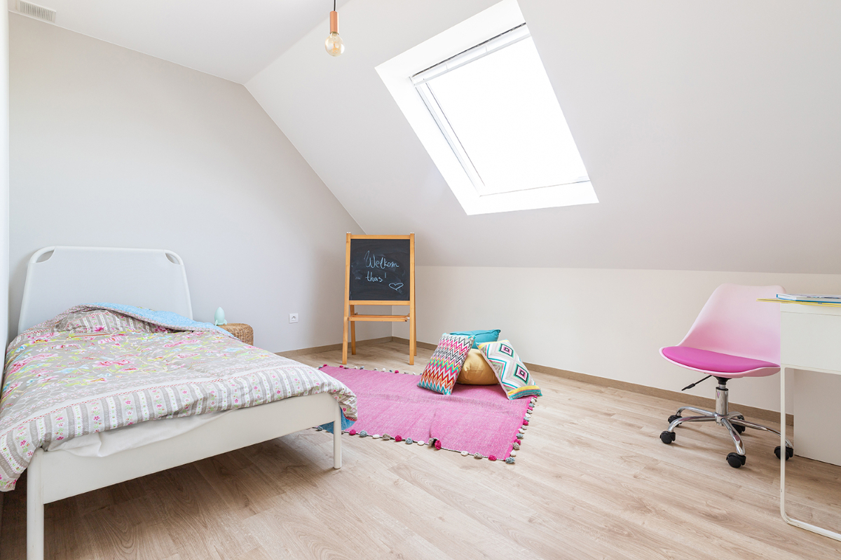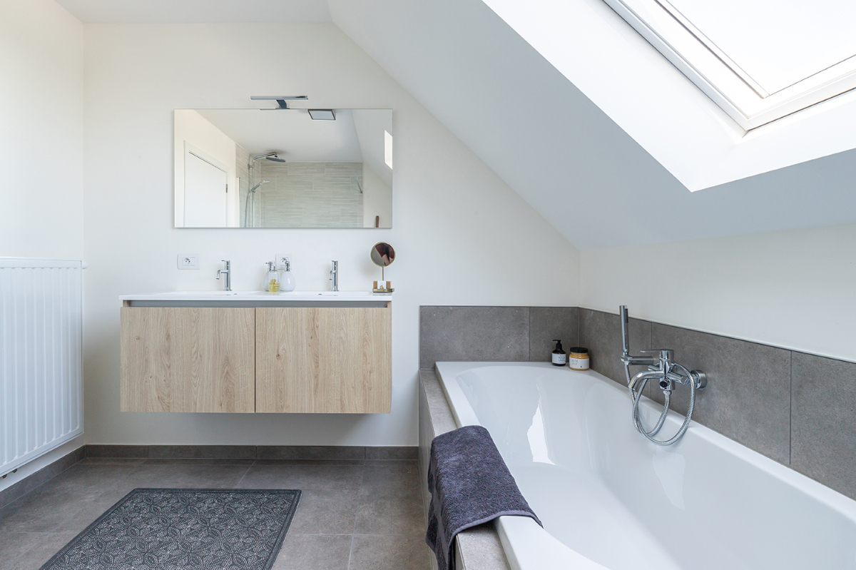 Het eerste verdiep telt drie slaapkamers, een volledig ingerichte badkamer (bad - inloopdouche - dubbele lavabo's met meubel) en apart toilet. Via de vouwtrap is er toegang tot de volledig geïsoleerde zolder, zeer handig ter stockage.