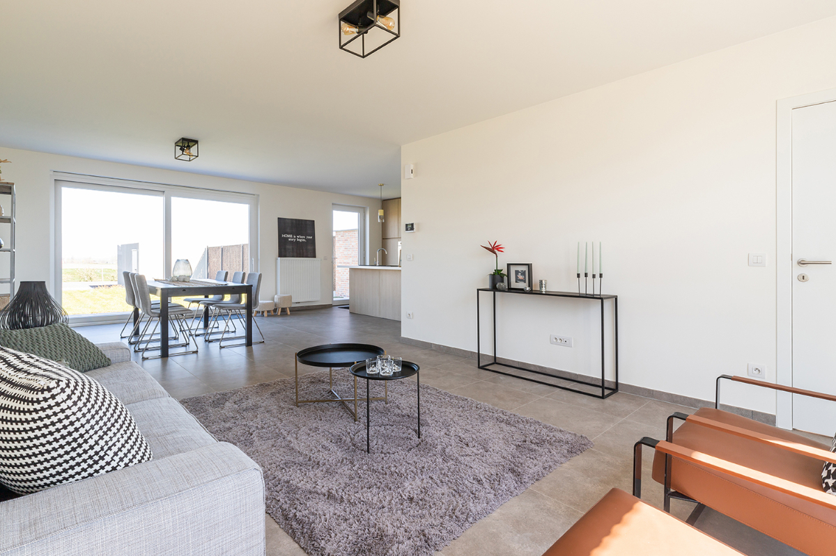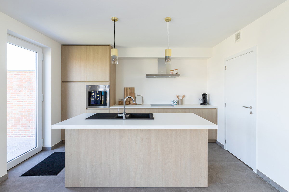 U komt binnen in de inkomhal met trappenhal. Aansluitend is er de lichtrijke leefruimte met open volledig ingerichte keuken, voorzien van een keramische kookplaat, dampkap, vaatwasser, dubbele spoelbak, combi-oven en koelkast (geen vriesvak). Via de keuken kan u de wasplaats betreden met aansluitingen voor de wasmachine en de droogkast. Tevens is er een apart toilet op het gelijkvloers. Via zowel de keuken als de leefruimte is er directe toegang naar de zongerichte tuin.