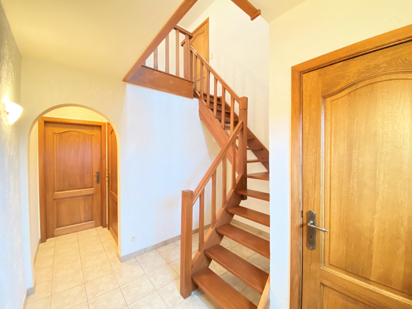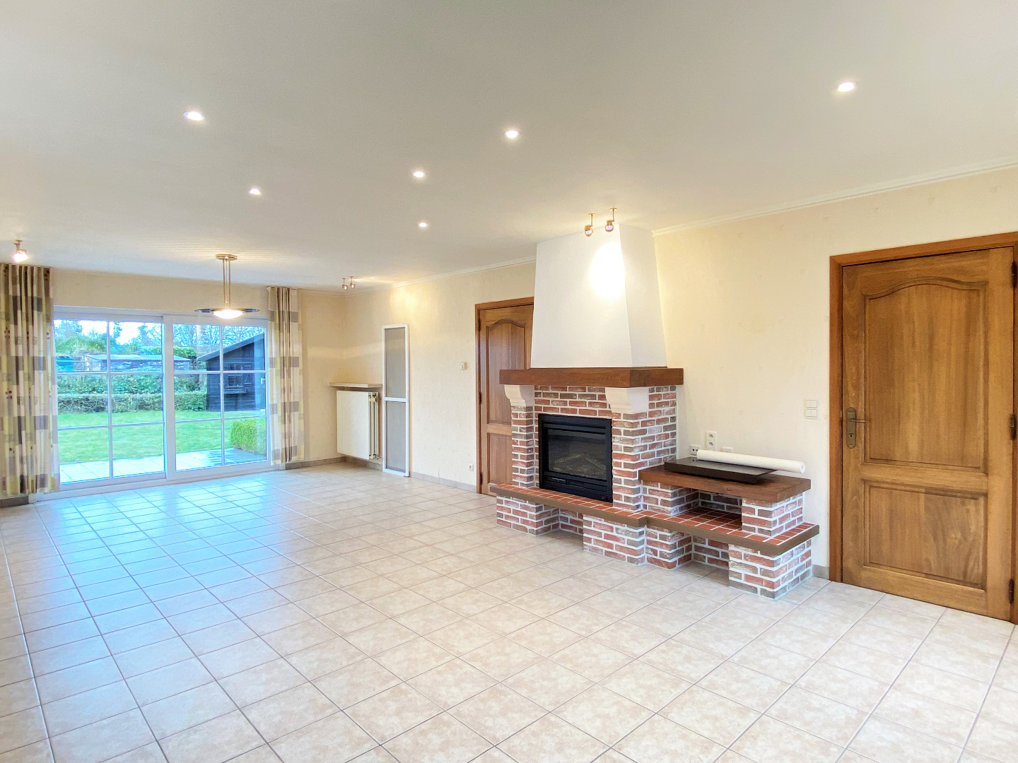 U komt binnen via de inkomhal met trappenhal, die toegang verleent tot het apart toilet, berging en leefruimte. Verder komt u binnen in de lichtrijke leefruimte met sierhaard. De leefruimte geeft uit met zicht op de tuin. Via de leefruimte bereikt u de geïnstalleerde keuken oven | koelkast | dubbele spoelbak | elektrische kookplaat | dampkap | oven. Vervolgens een hall die toegang verleent tot de badkamer, 2 slaapkamers en de garage. De inpandige garage heeft een automatische poort.