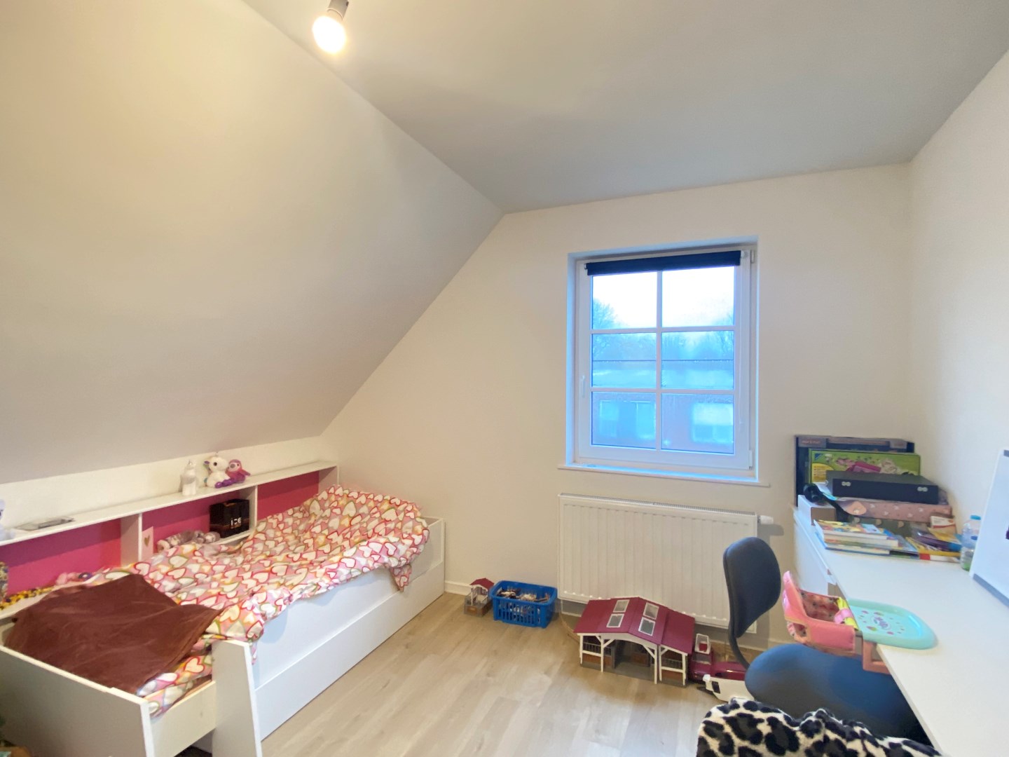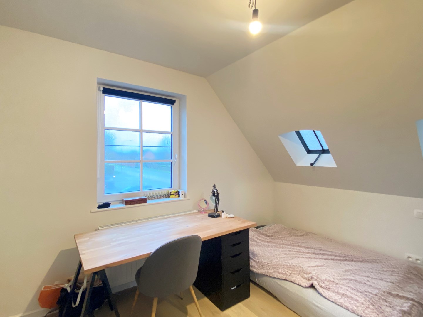 Het eerste verdiep telt drie slaapkamers, een volledig ingerichte badkamer (bad - inloopdouche - lavabo met meubel) en apart toilet. Via de vouwtrap is er toegang tot de volledig geïsoleerde zolder, zeer handig ter stockage.