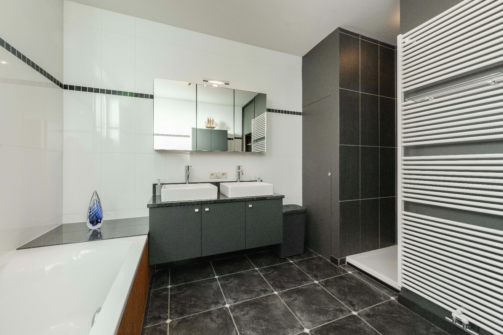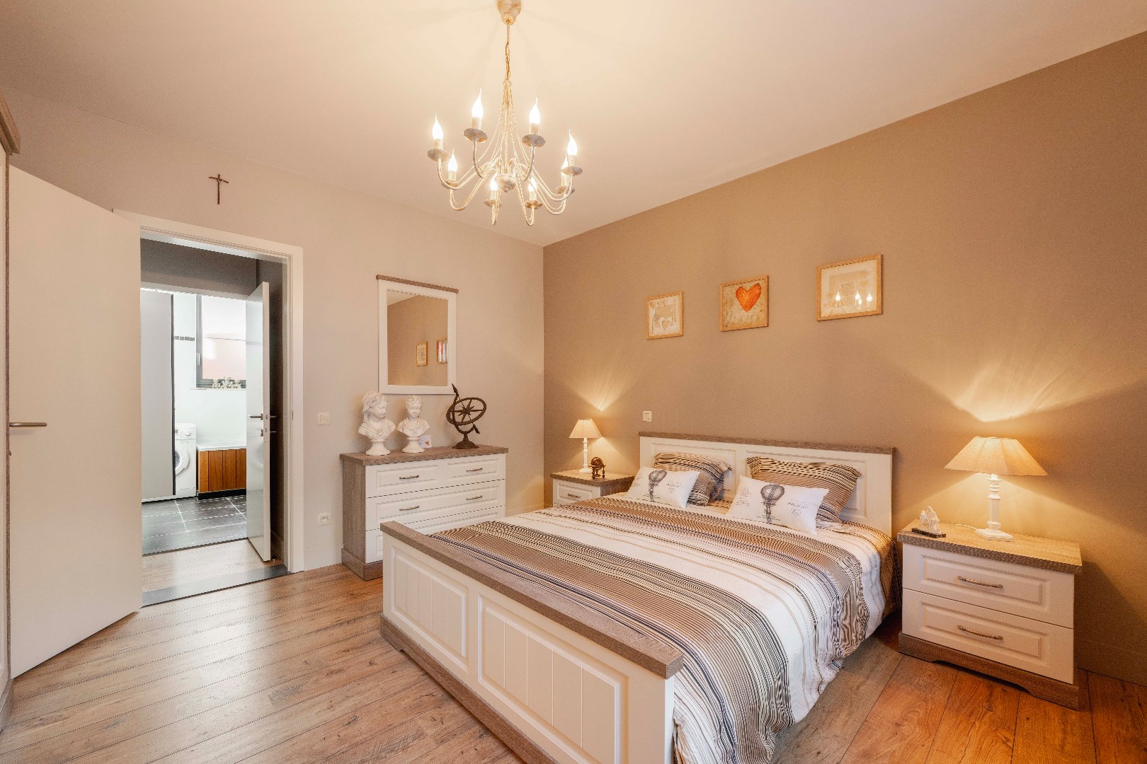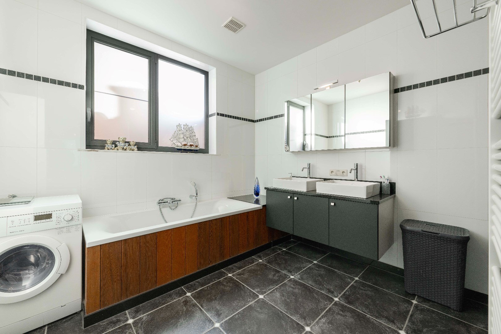 Via de achterinkom/nachthall is er toegang tot de ruime en droge kelder. Verder op het gelijkvloers zijn er nog 2 ruime slaapkamers, alsook de ingerichte badkamer (inloopdouche | ligbad | dubbele lavabo met meubel) met aansluiting voor wasmachine en droogkast.