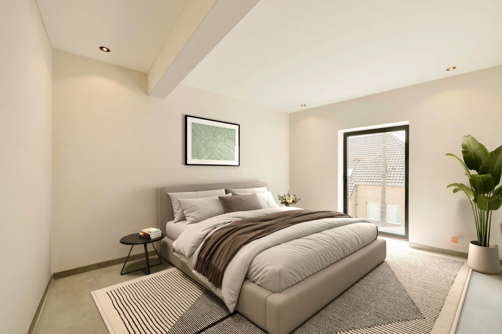 U komt het appartement binnen in de ruime lichtrijke woonkamer met ingerichte keuken (49,99 m²). U kan via de woonkamer het terras (5,59 m²) betreden. Verder omvat het appartement 2 slaapkamers (16,55 m² | 13,45 m²) waarvan 1 kamer uitgerust met dressing (4,77 m²), een ingerichte badkamer voorzien van een inloopdouche en dubbele lavabo met meubel, apart toilet en berging/technische ruimte (2,98 m²) met aansluiting voor een wasmachine en droogkast.