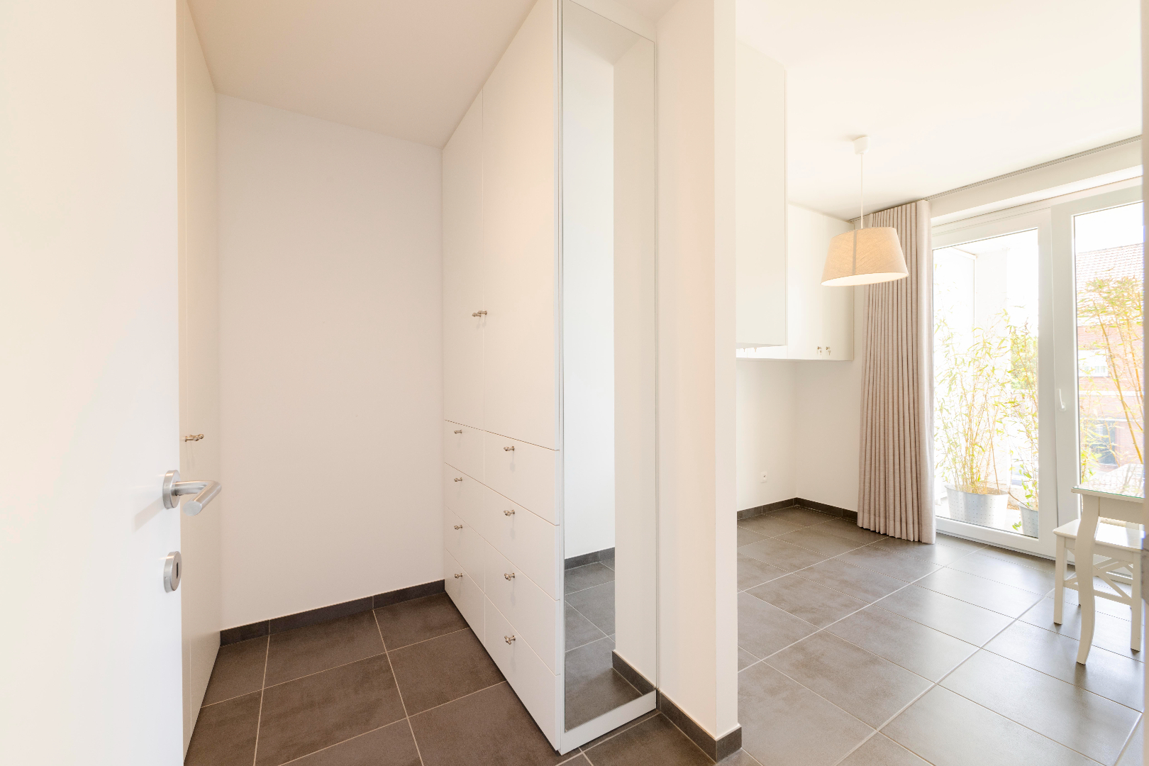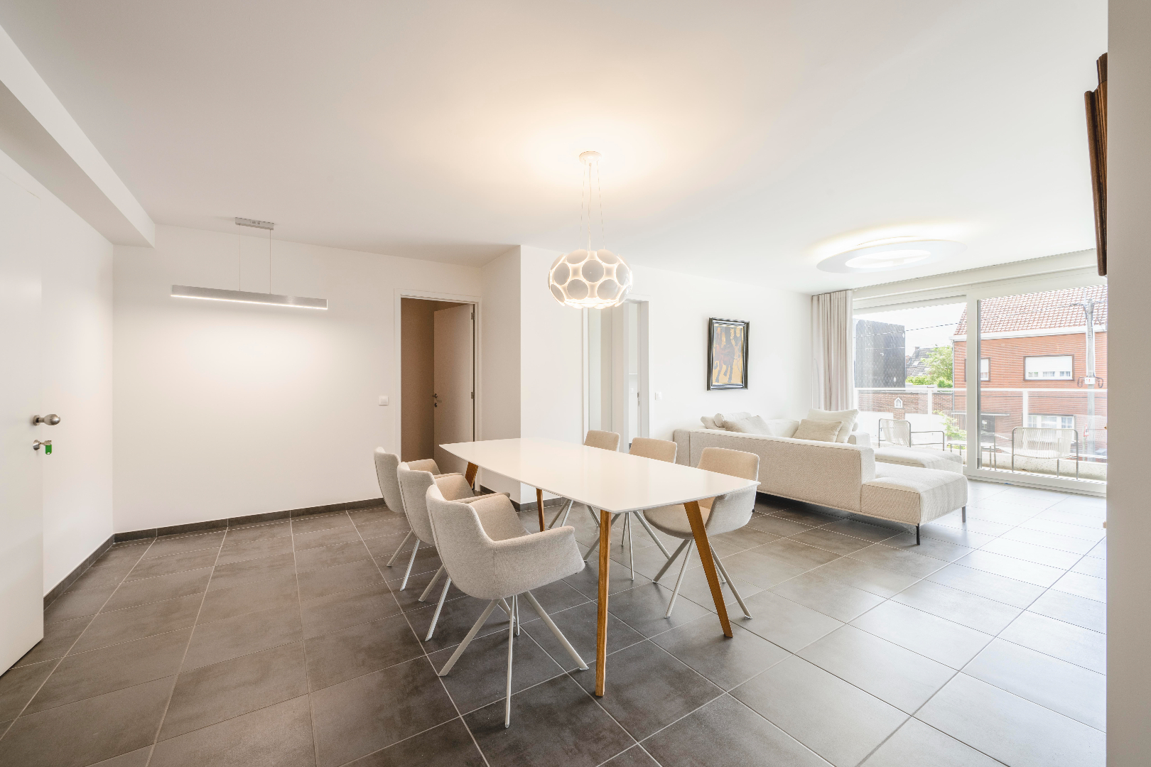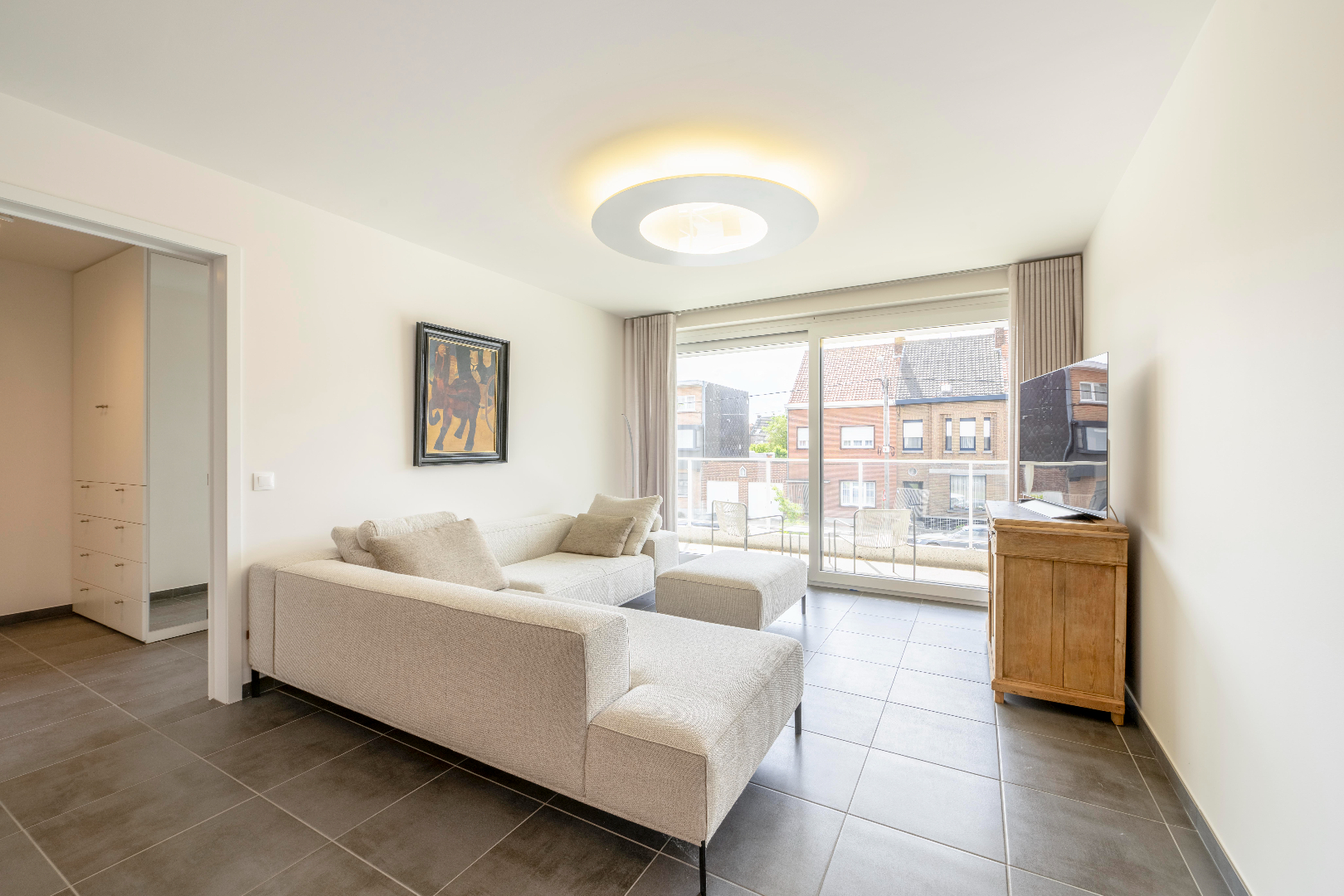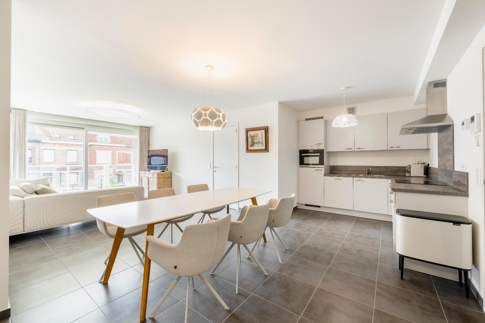 U komt het appartement binnen in de prachtige leefruimte met volledig ingerichte keuken (kookplaat | dampkap | dubbele spoelbak | combi-oven | frigo). U geniet van prachtige lichtinval gezien het enorme schuifraam in de zithoek met directe toegang tot het terras.