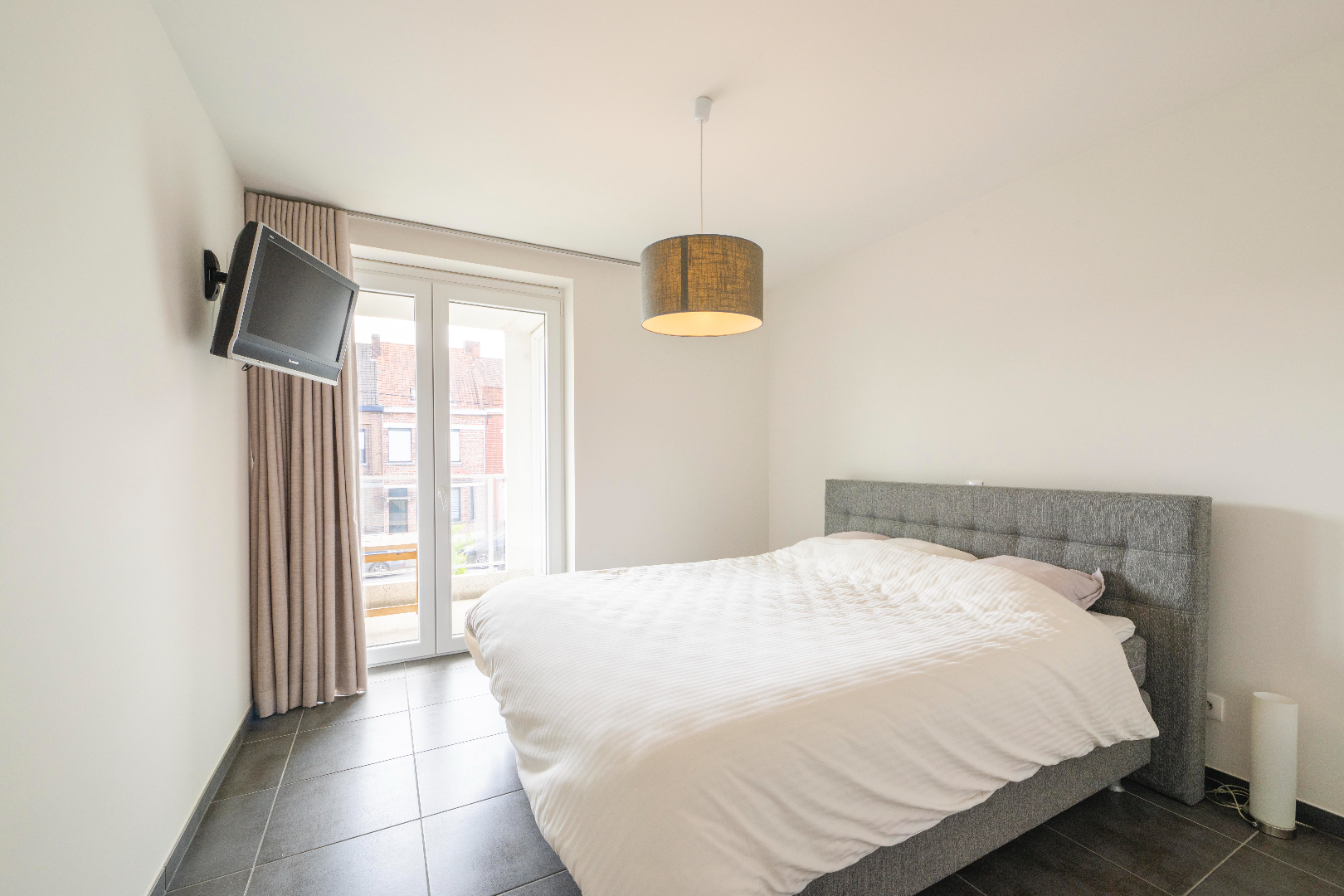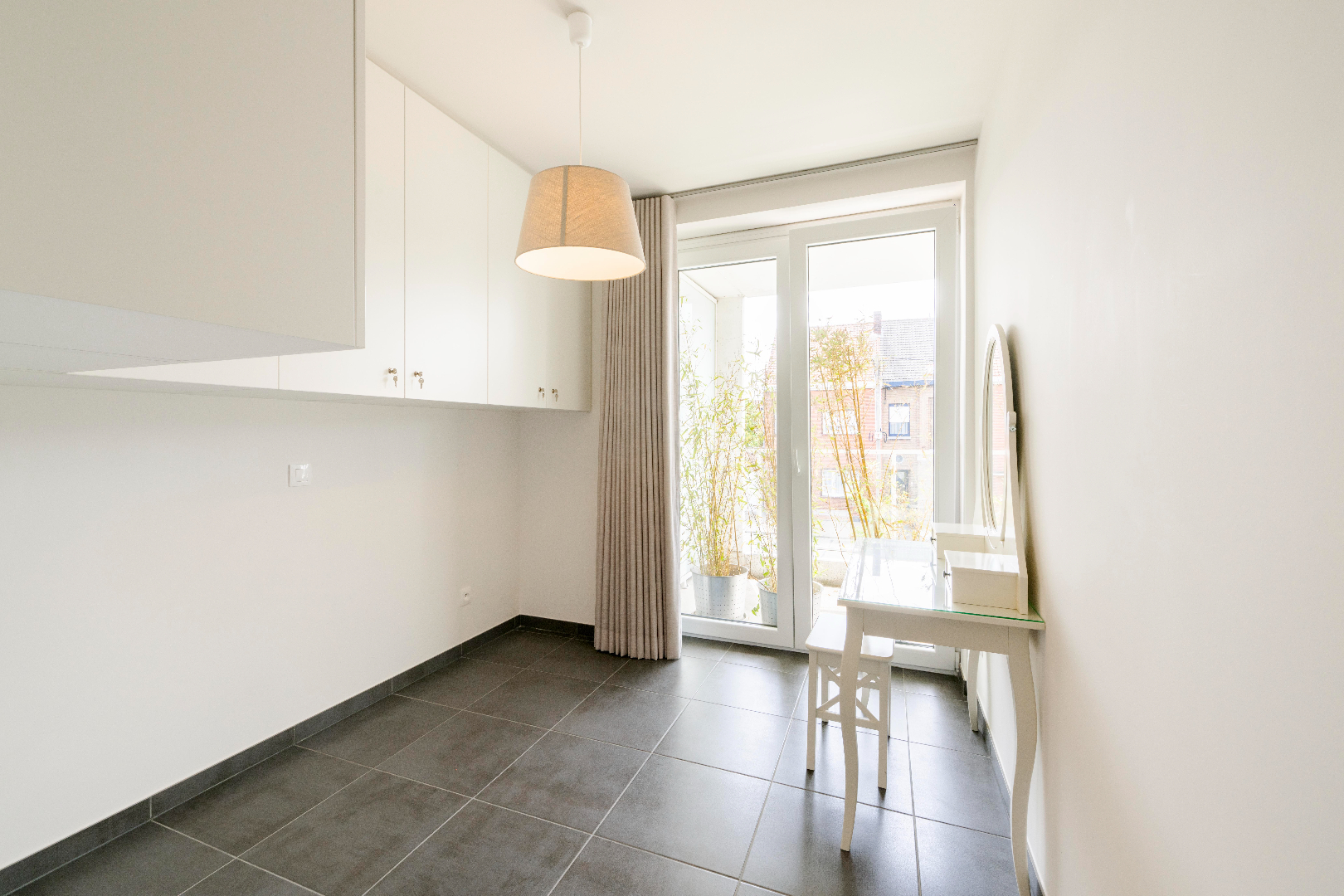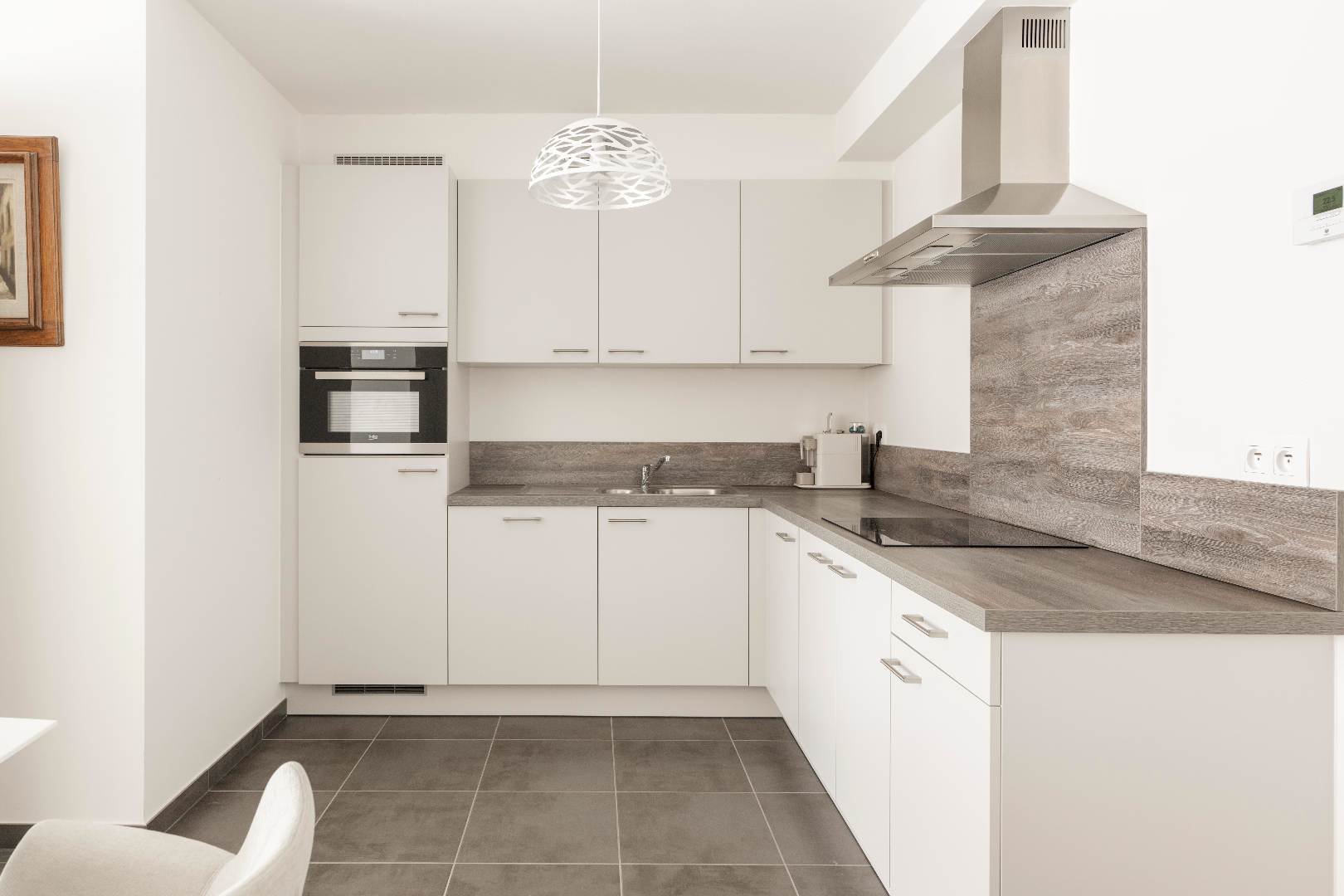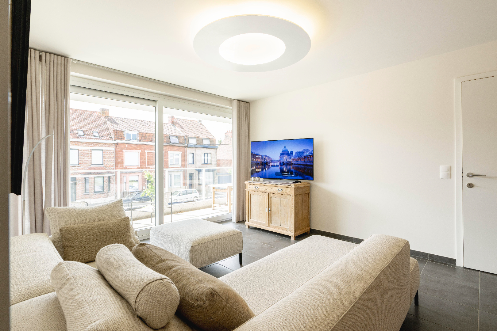 U komt het appartement binnen in de prachtige leefruimte met volledig ingerichte keuken (kookplaat | dampkap | dubbele spoelbak | combi-oven | frigo). U geniet van prachtige lichtinval gezien het enorme schuifraam in de zithoek met directe toegang tot het terras.